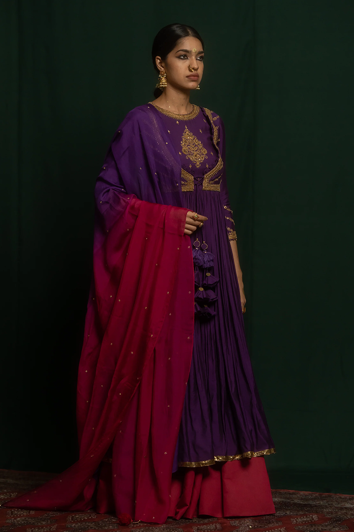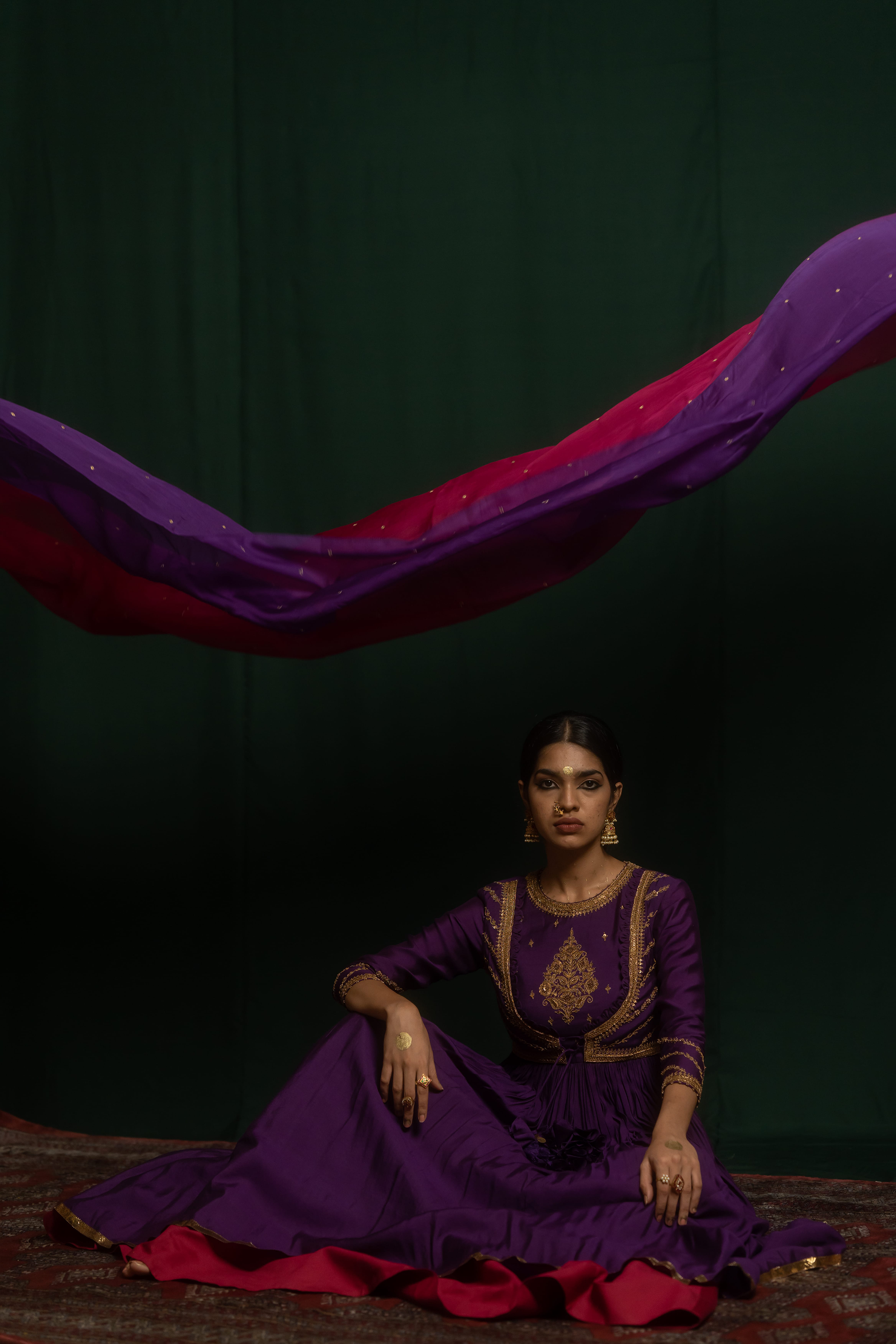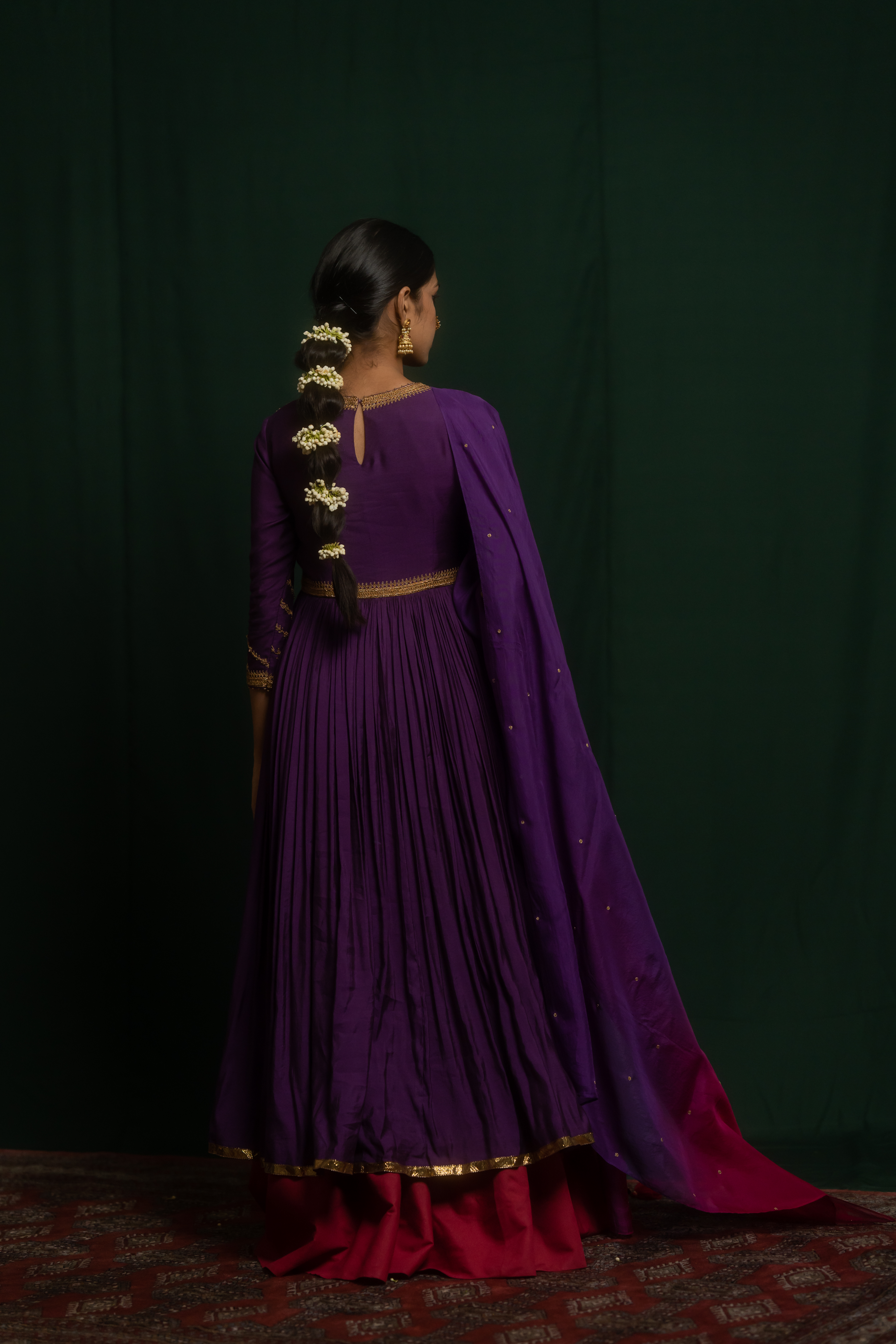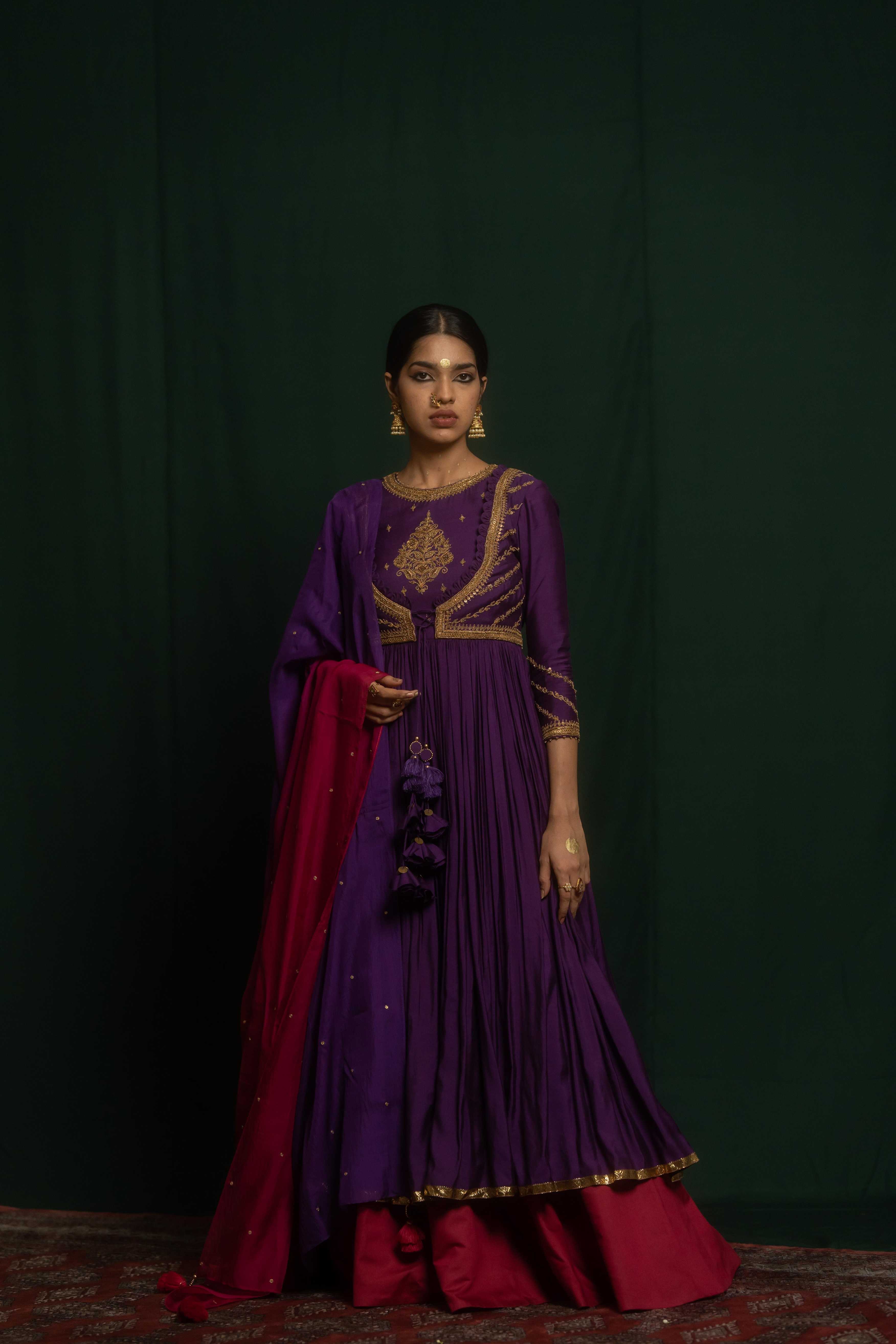 Aafia Anarkali is crafted in purple cotton silk, it has a contrast double layer colour. It features a combination of marodi and zardosi embroidery techniques with floral and geometrical designs.