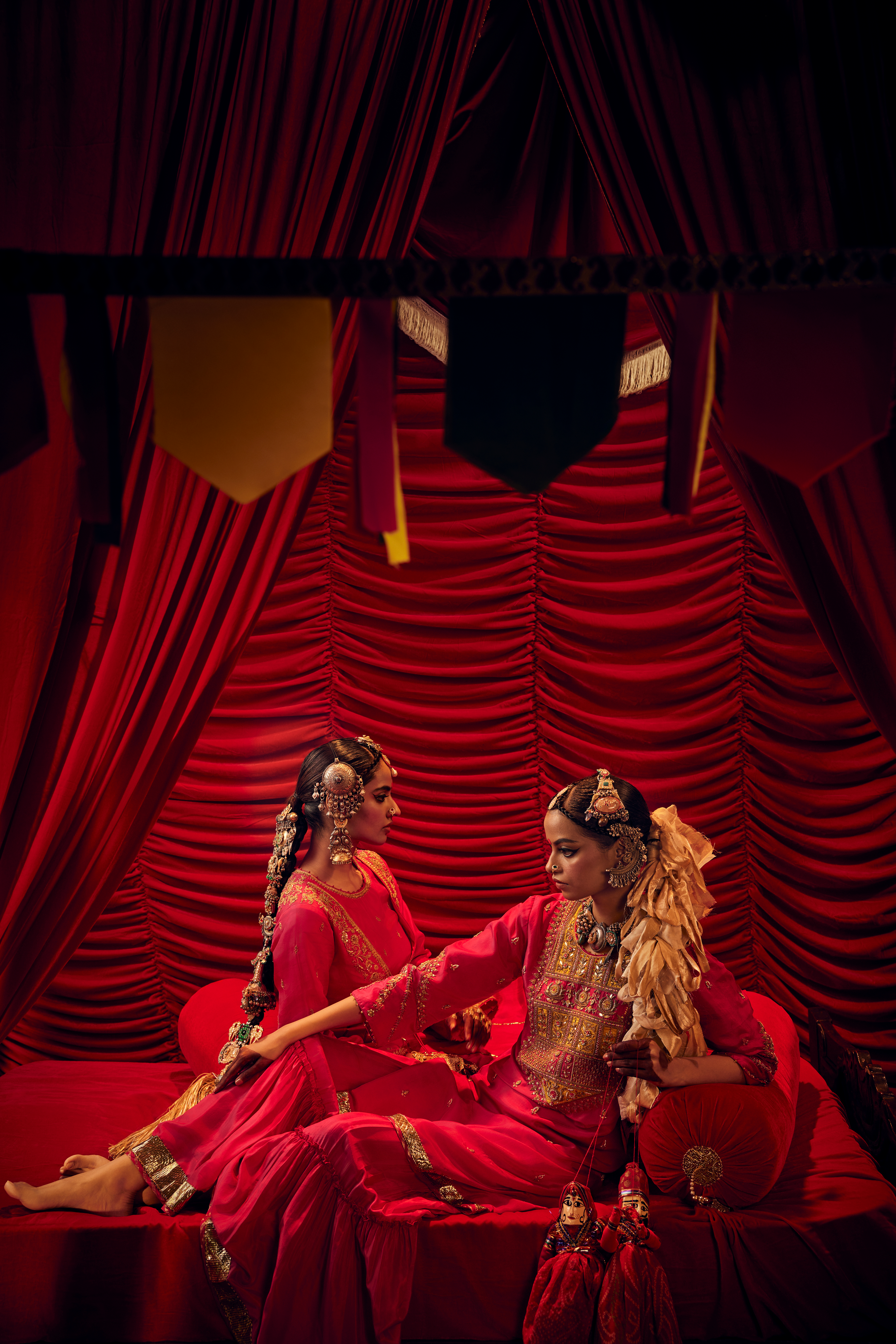 Aarna anarkali is crafted in fine rani handwoven silk. The Kalidar anarkali has an embroidered yolk, sleeve and back with inricate floral detailing in marodi, zardozi and badla techniques, it has a lampi border along the hem.