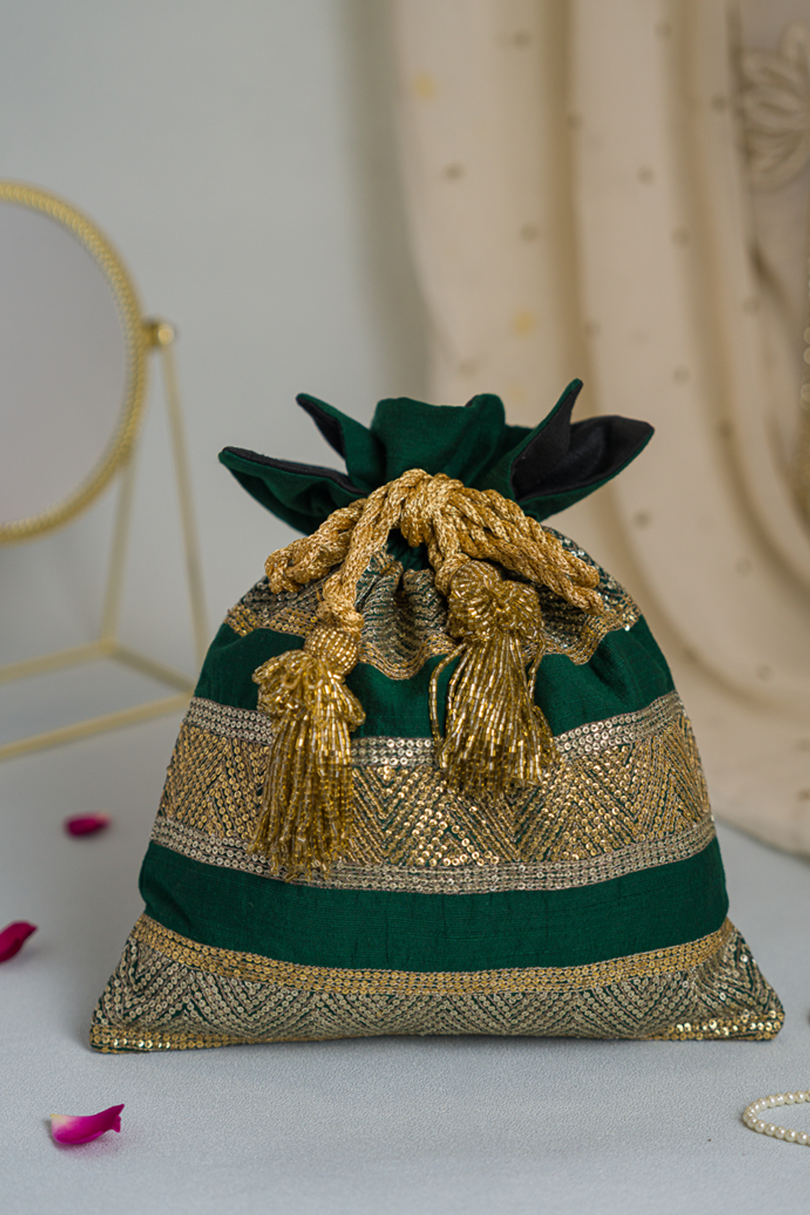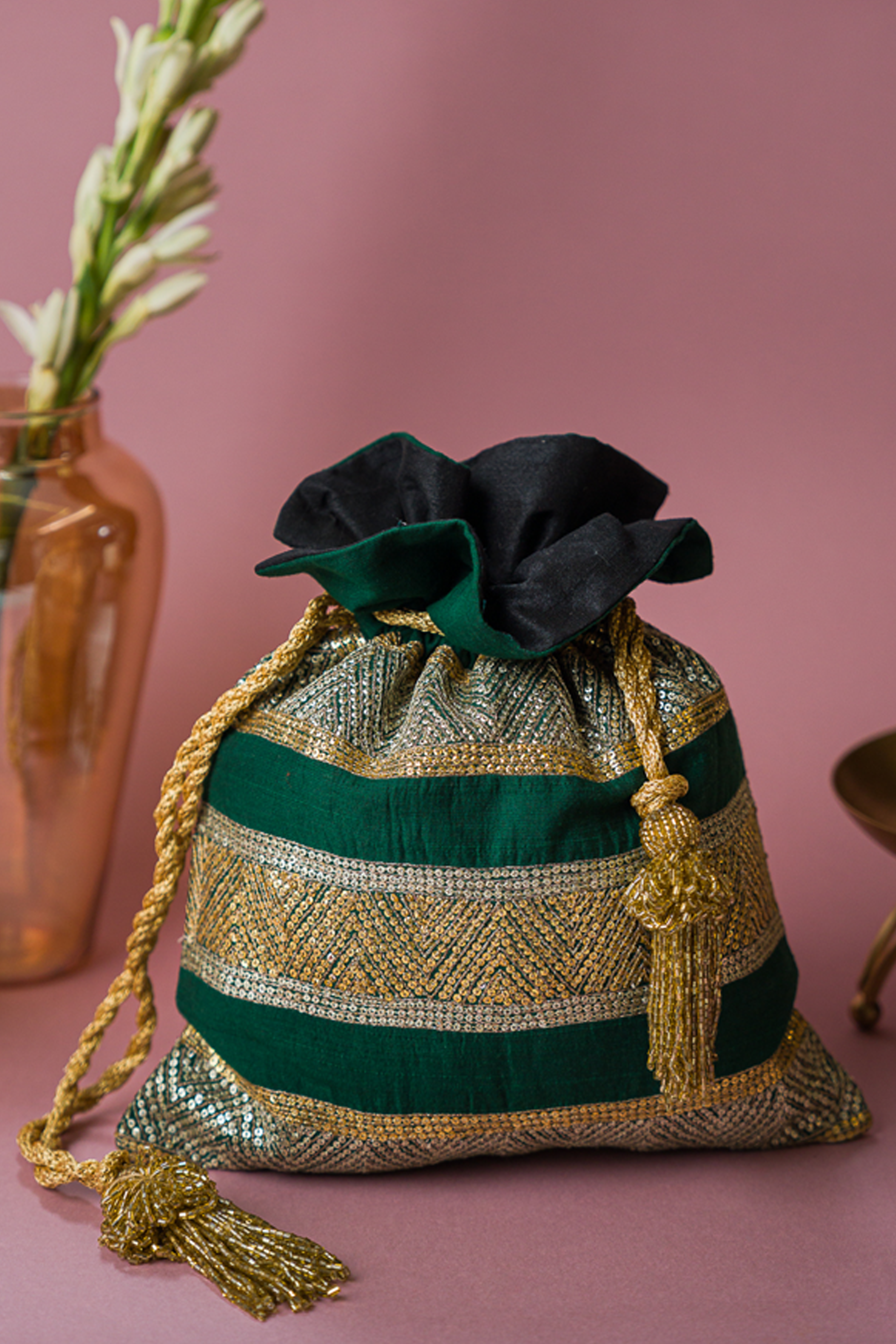 An elegant raw silk batwa, beautifully embroidered with Aari and Tikki techniques. The fabric is adorned with intricate floral and geometric patterns, enhanced by delicate tassel accents.