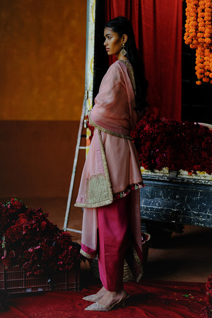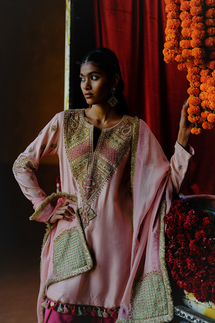 Amaltas Kurta Dhoti Dupatta Set is crafted in handwoven silk, the kurta has a richly embroidered yoke blending zardozi, marodi, and patchwork.Also has an embroidered sleeve hanging tassels at the hem. It is paired with dhoti pants and a handcrafted dupatta with delicate embroidery.