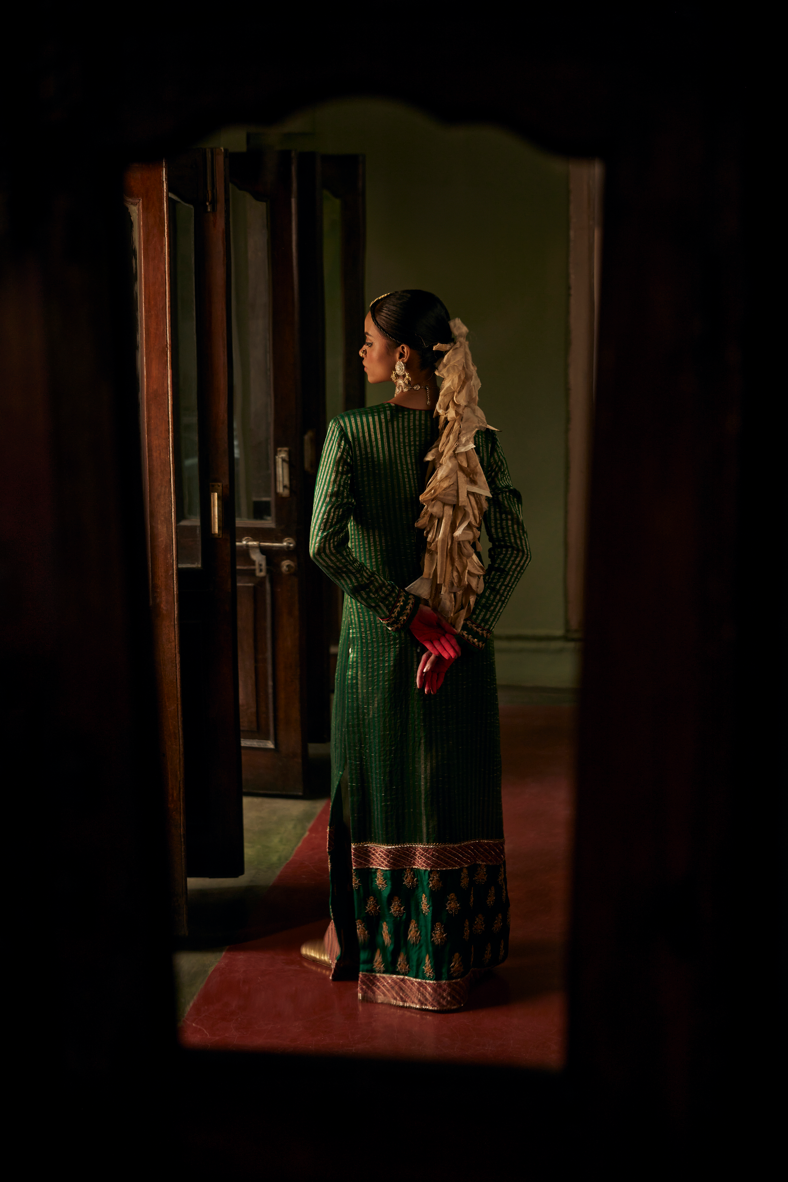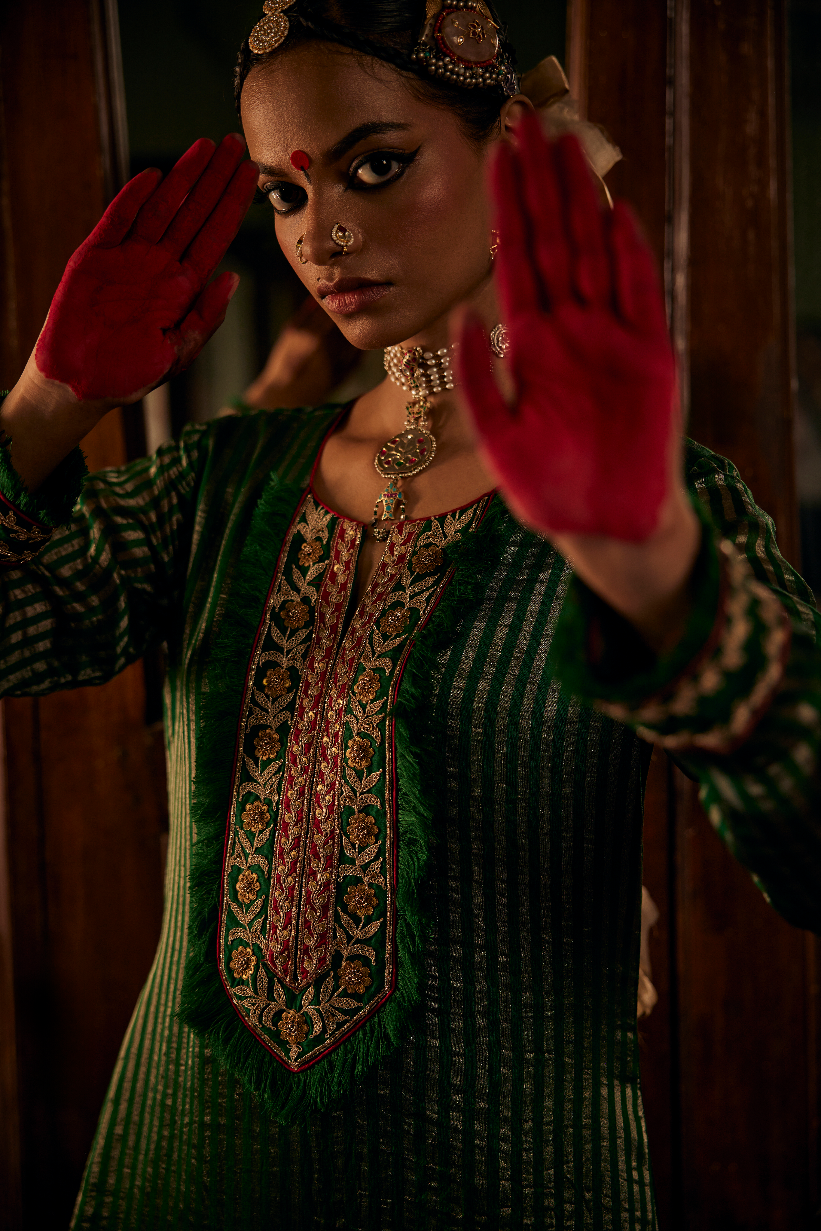 Anika full lenght kurta is crafted in gold stripe tissue fabric. It features delicate marodi embriodery on the yolk and cuff and heavy embriodery on the hem.