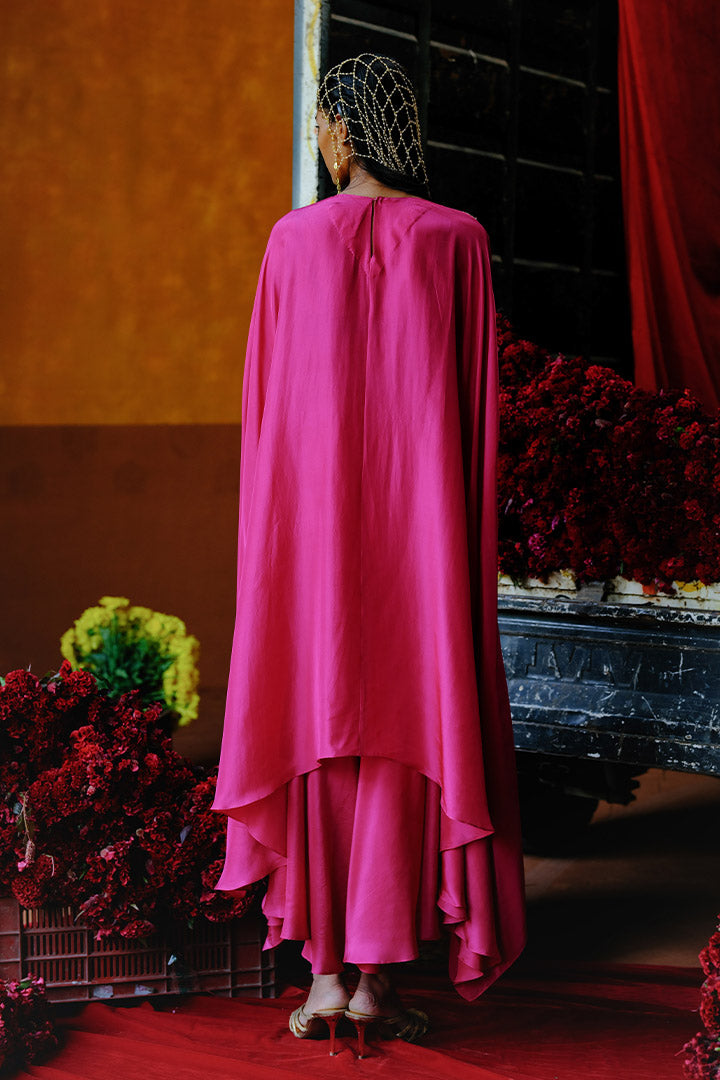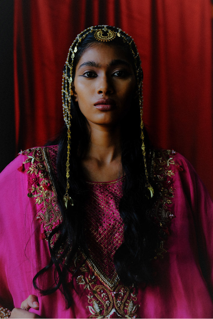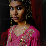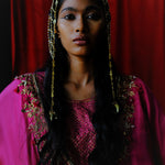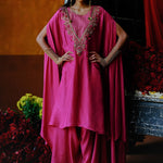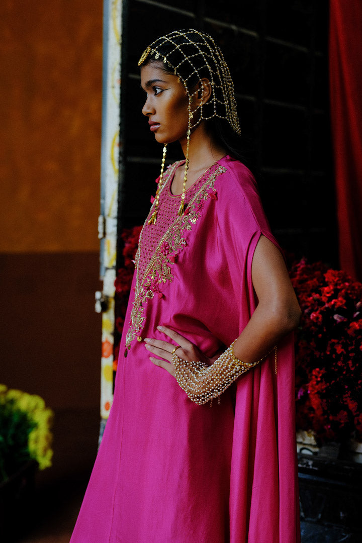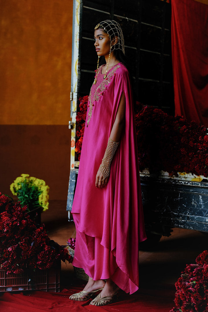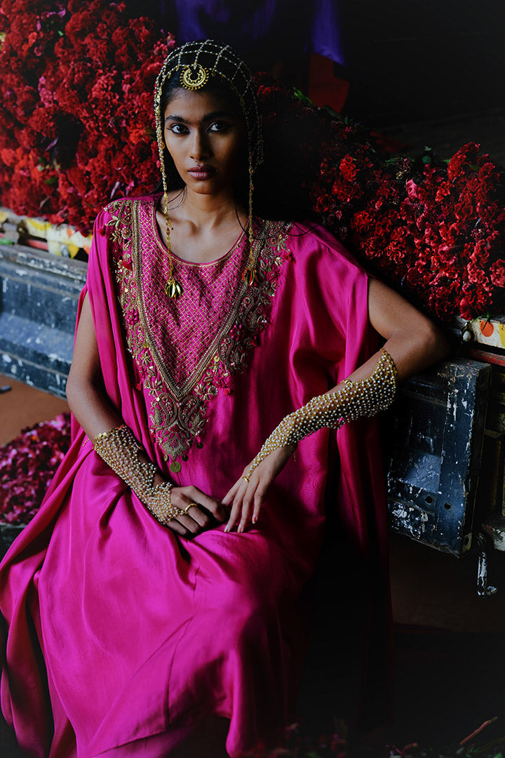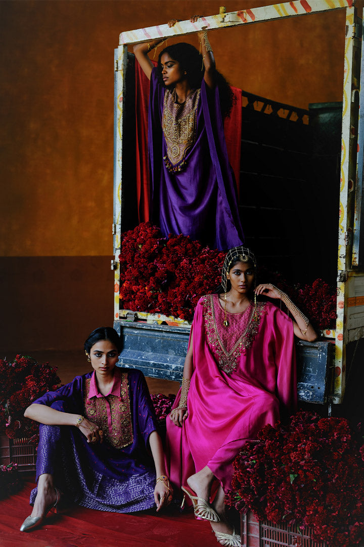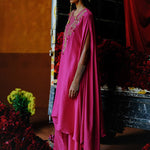 The Aparajita tunic dhoti set is crafted in handwoven silk the tunic has an intricately embroidered zardozi and marodi yoke, highlighted with subtle embellishments and 3d flowers. It is paired with a matching dhoti crafted from the same fabric for a refined finish.