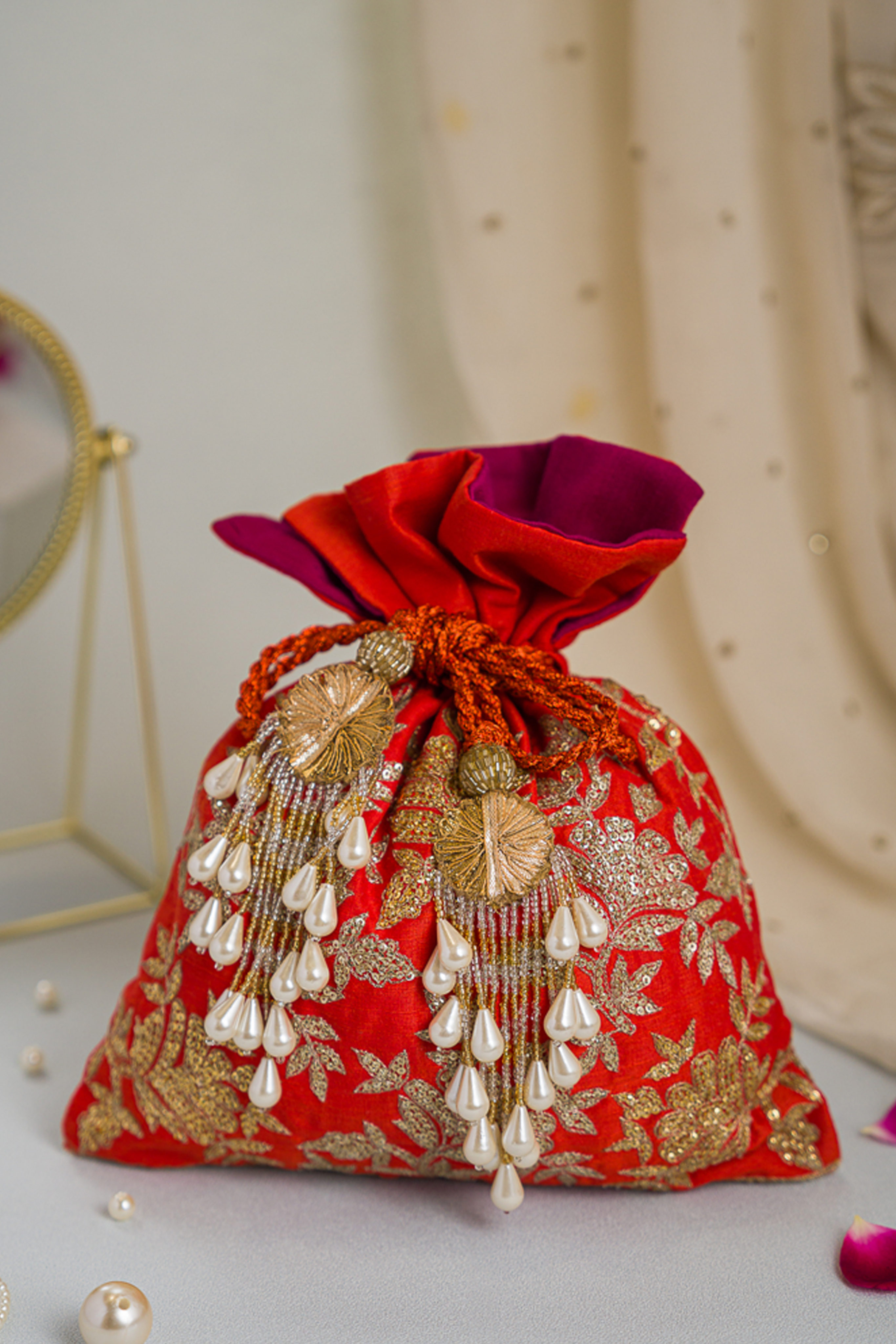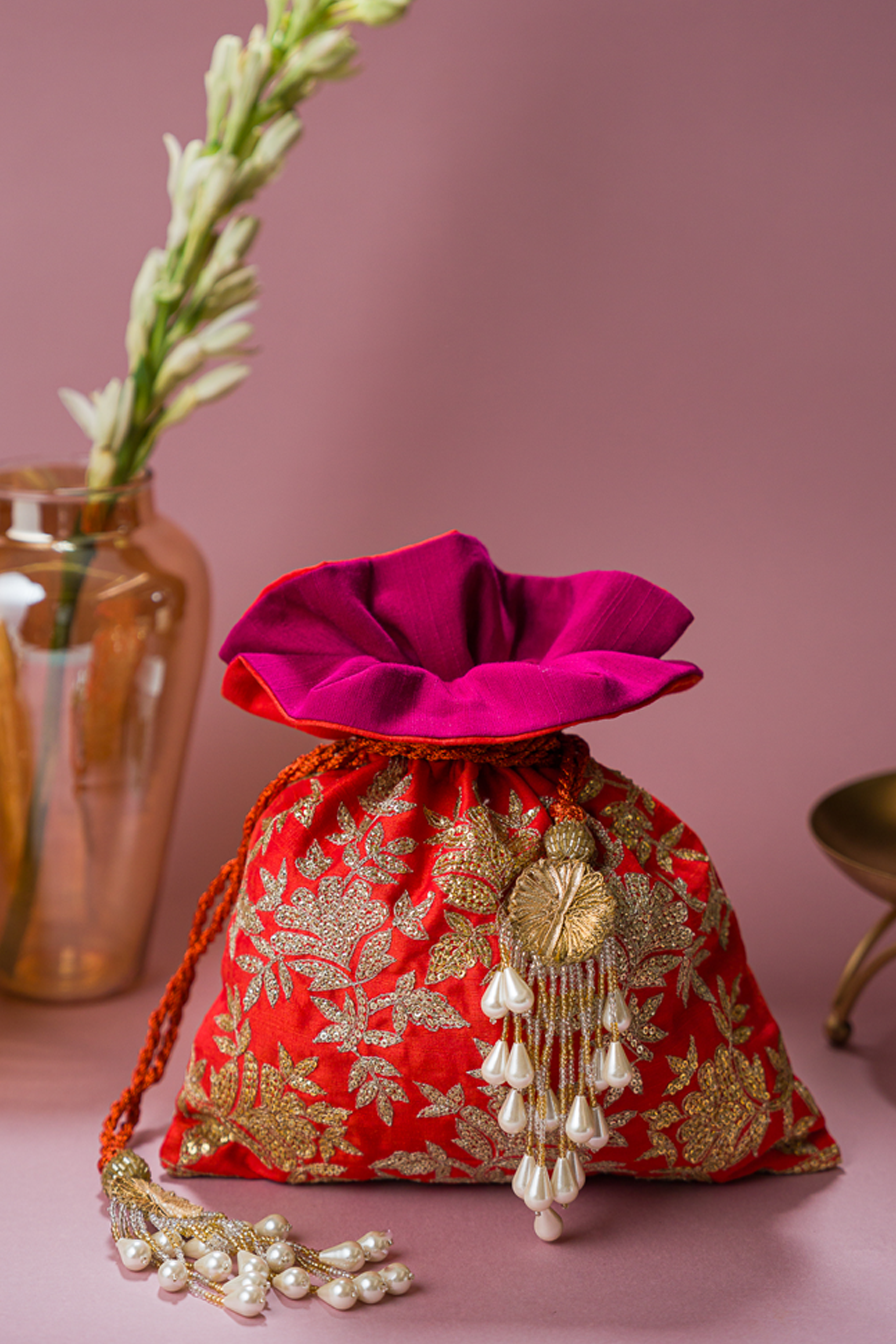 An elegant raw silk batwa, beautifully embroidered with Aari and Tikki techniques. The fabric is adorned with intricate floral and geometric patterns, enhanced by delicate tassel accents.