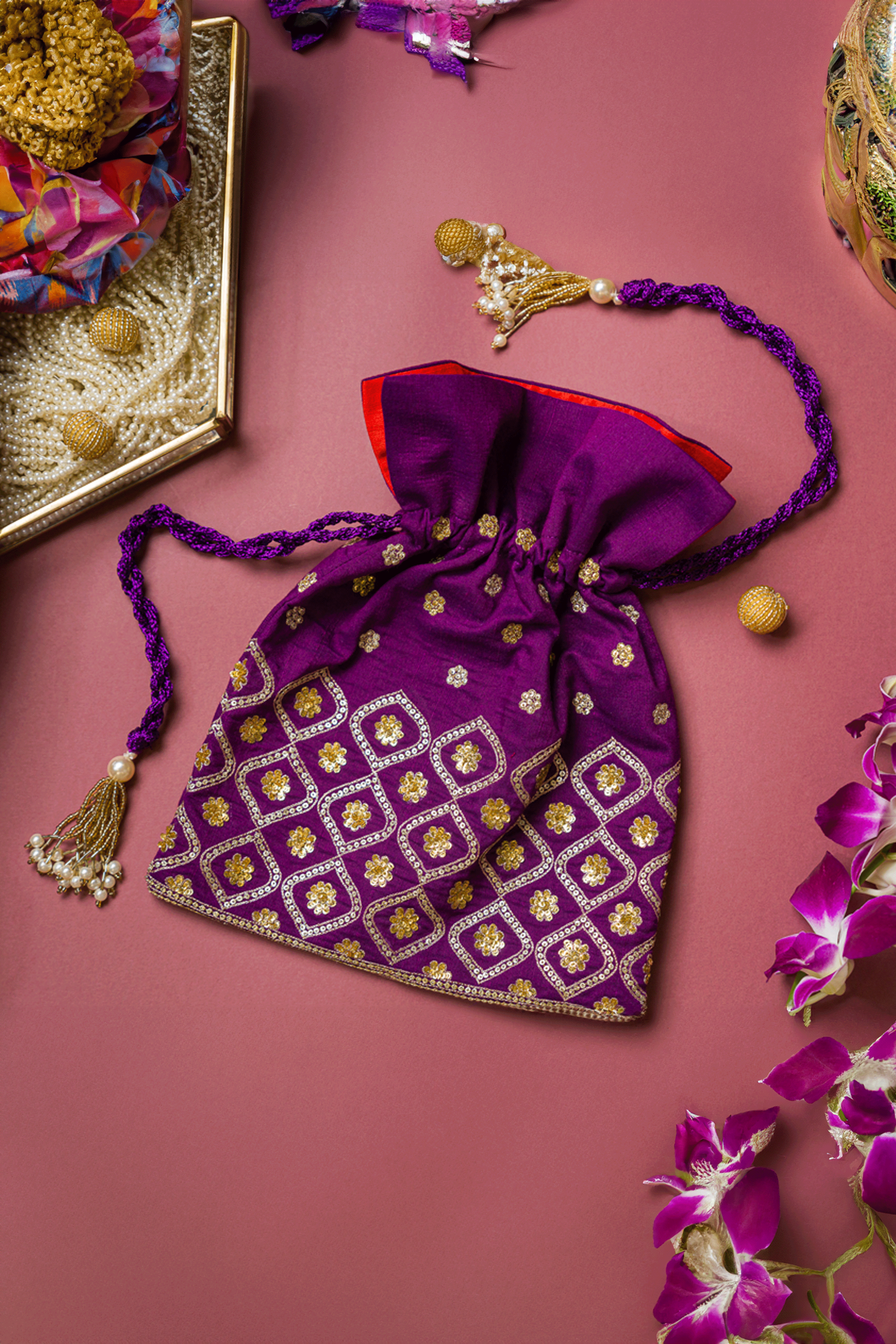 An elegant raw silk batwa, beautifully embroidered with Aari and Tikki techniques. The fabric is adorned with intricate floral and geometric patterns, enhanced by delicate tassel accents.