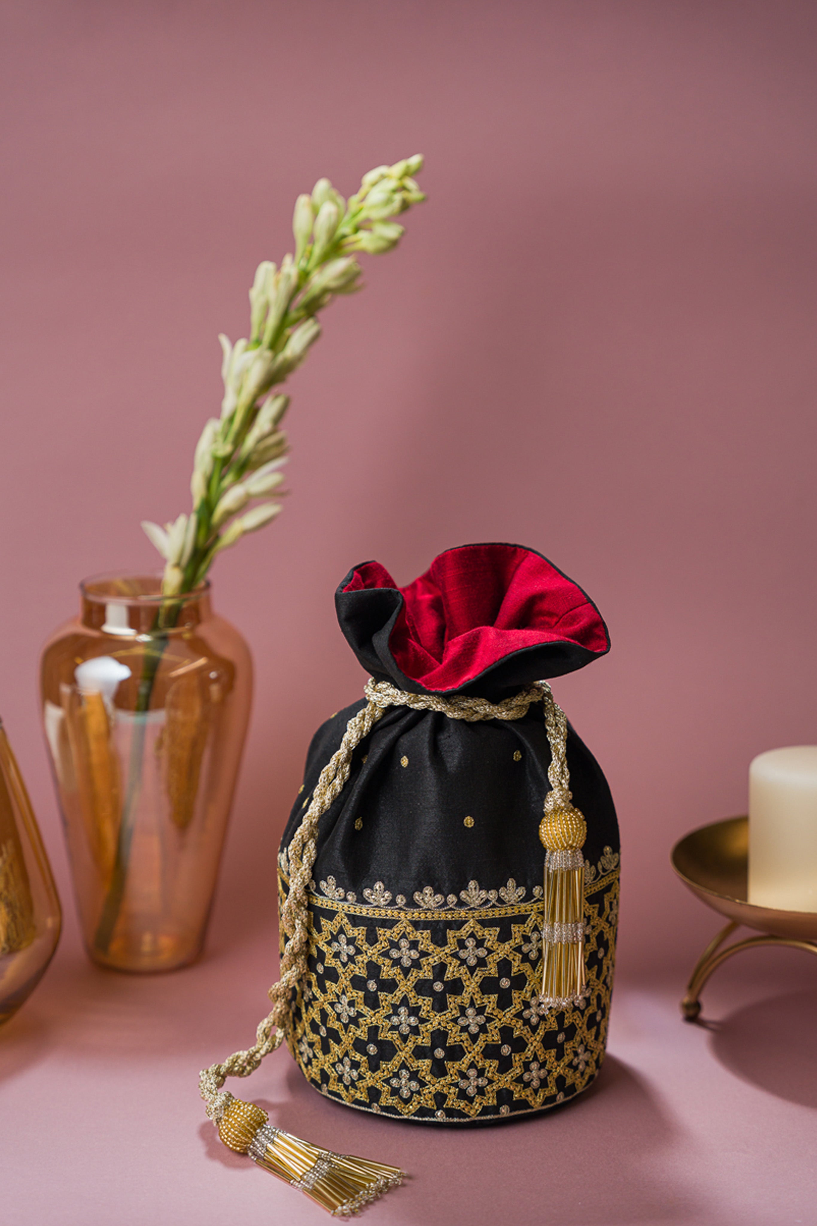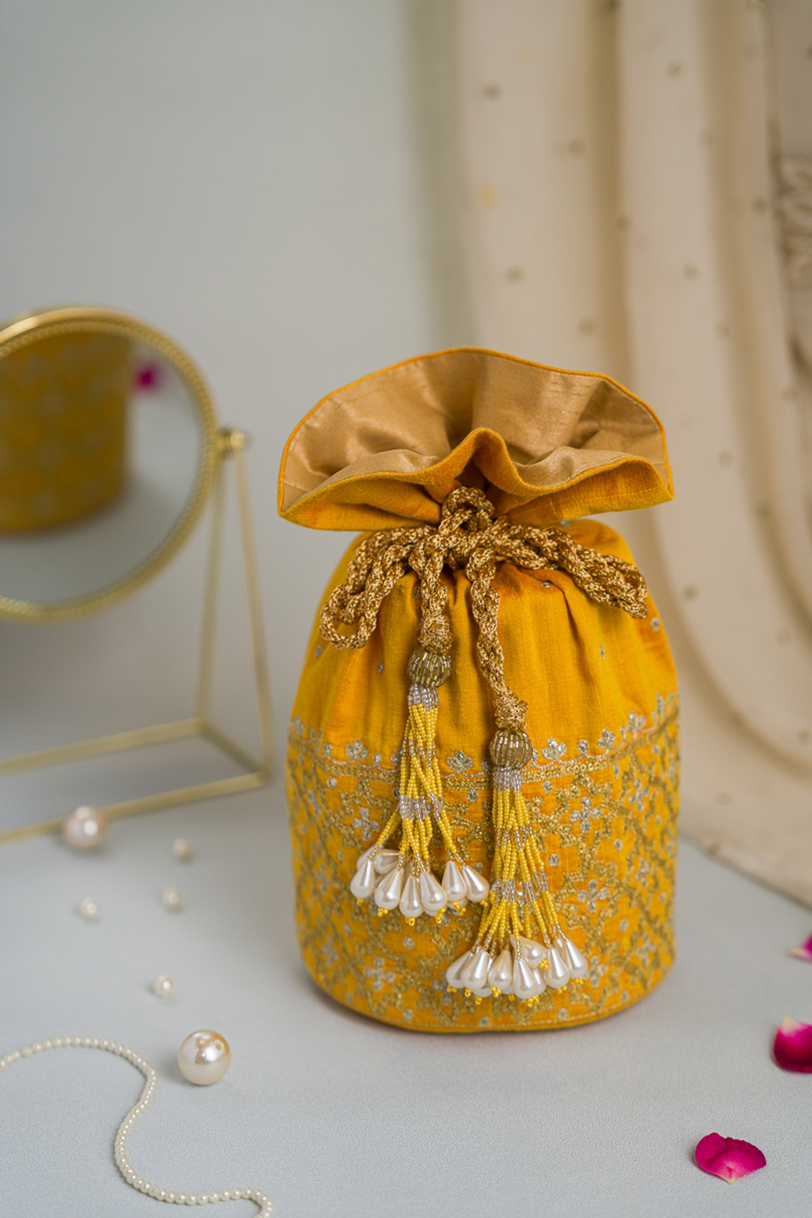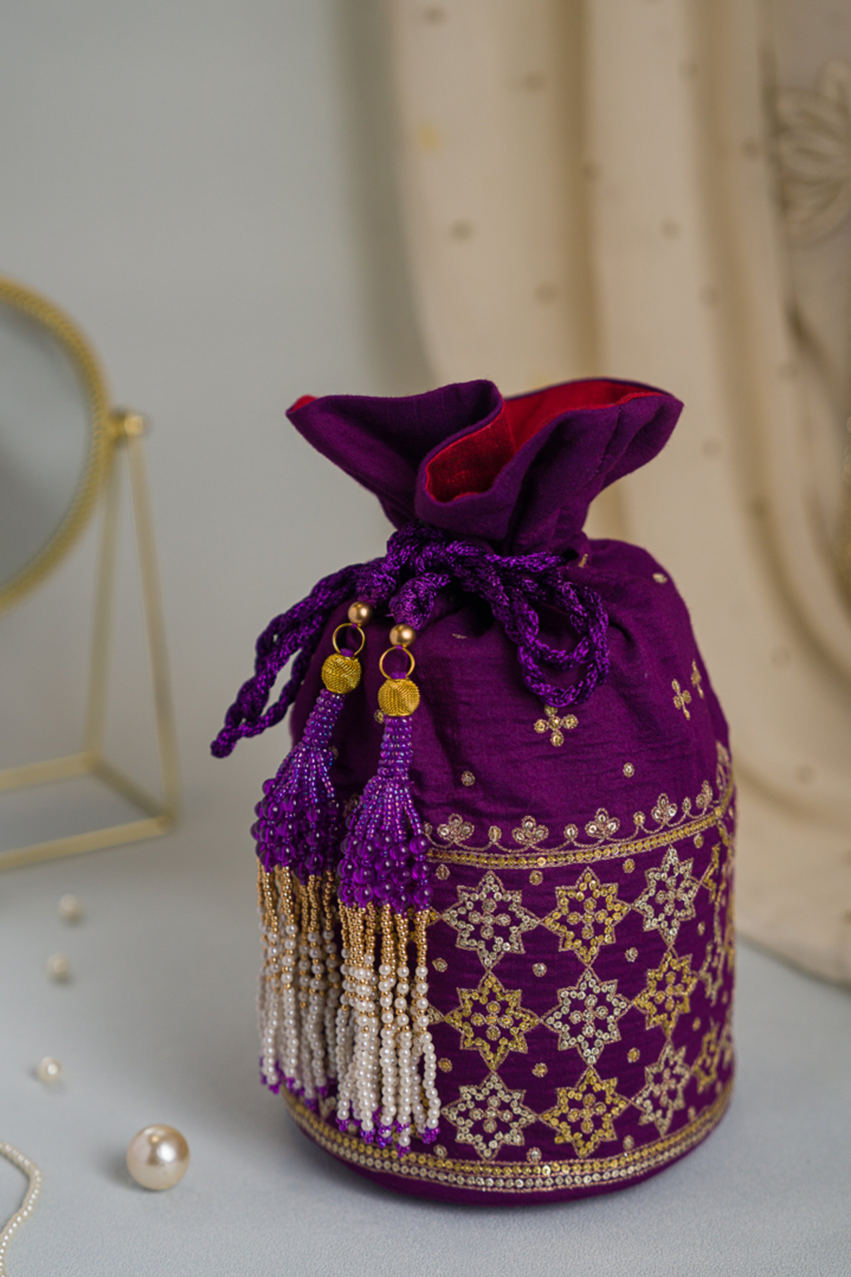 An elegant raw silk batwa, beautifully embroidered with Aari and Tikki techniques. The fabric is adorned with intricate floral and geometric patterns, enhanced by delicate tassel accents.