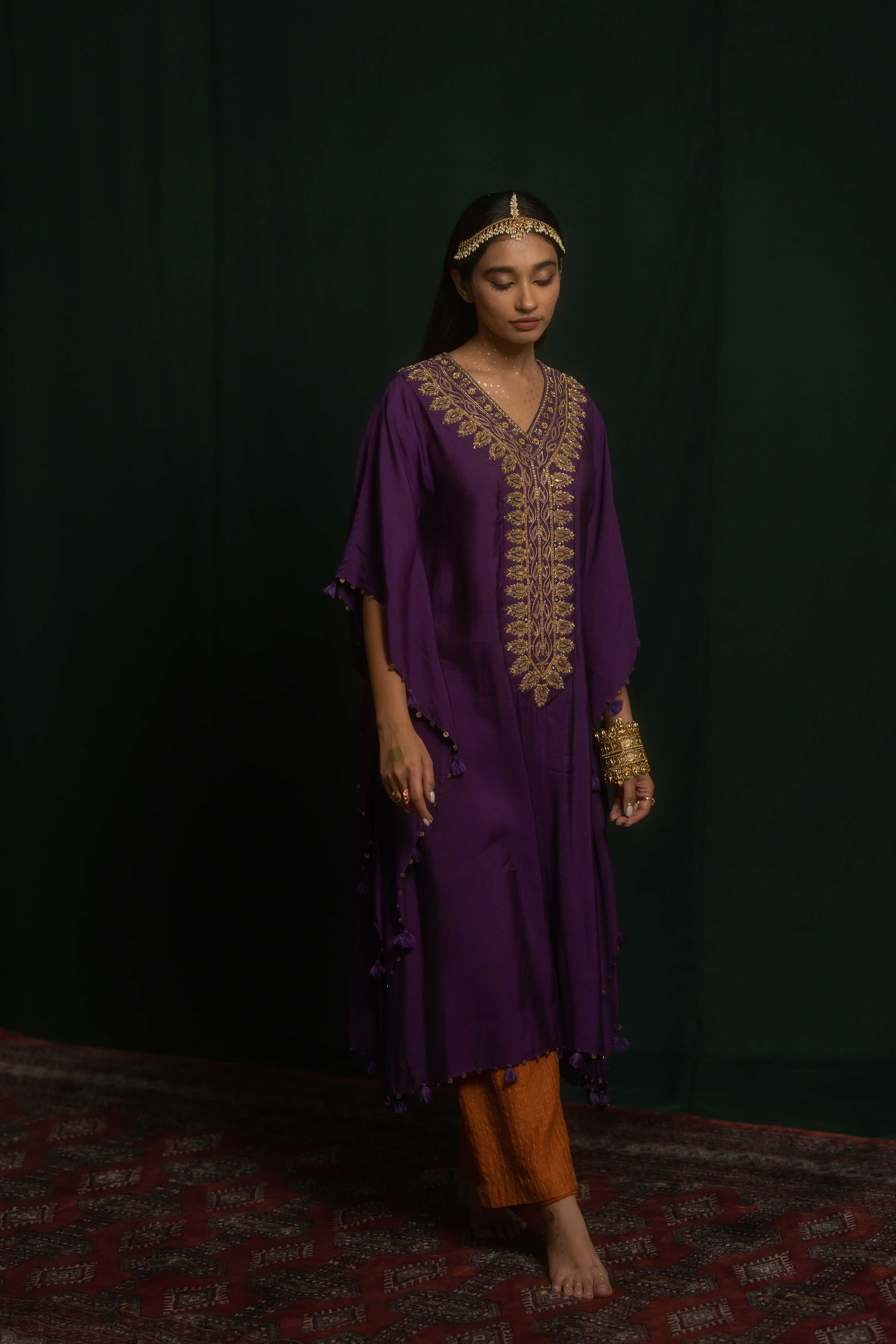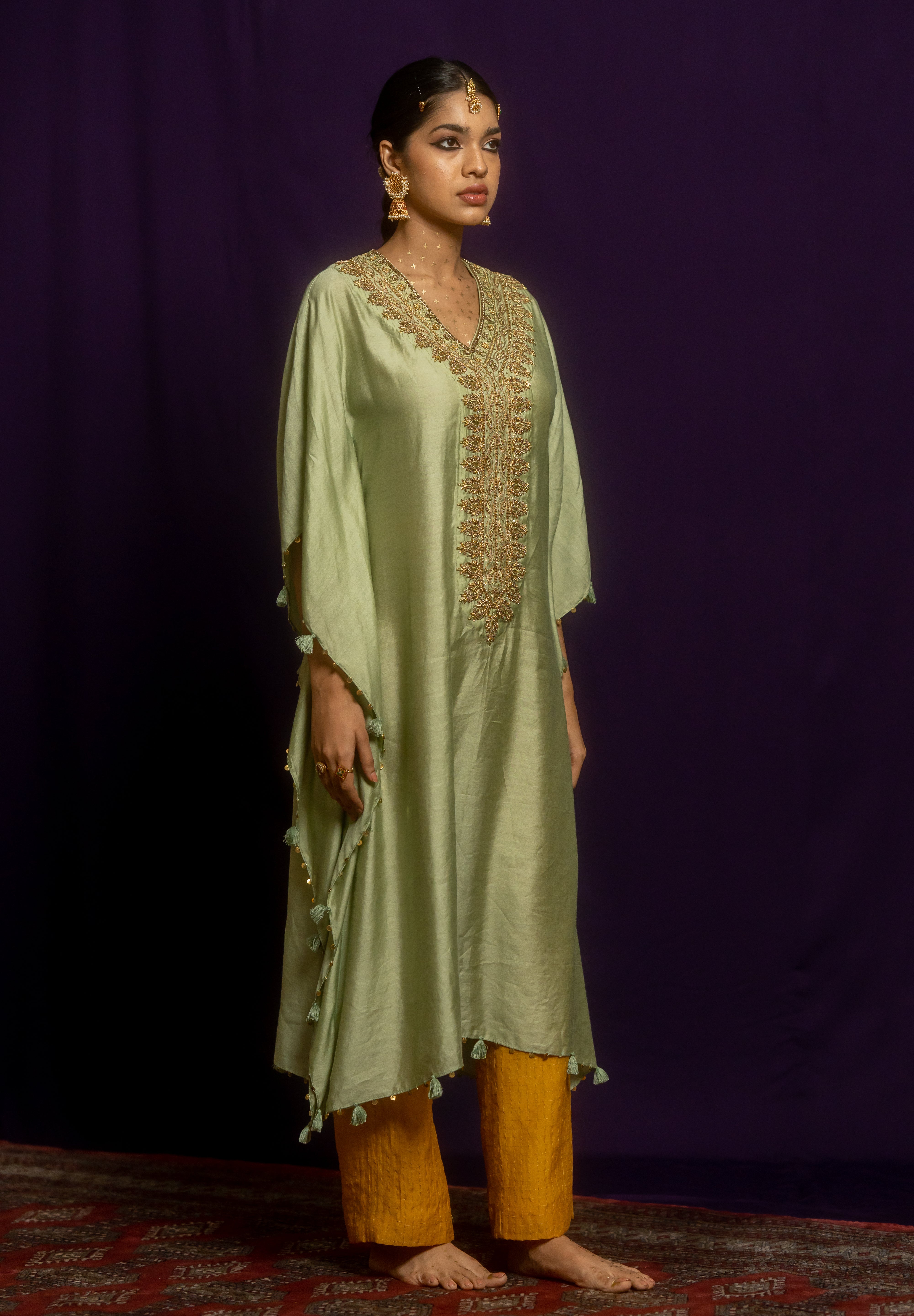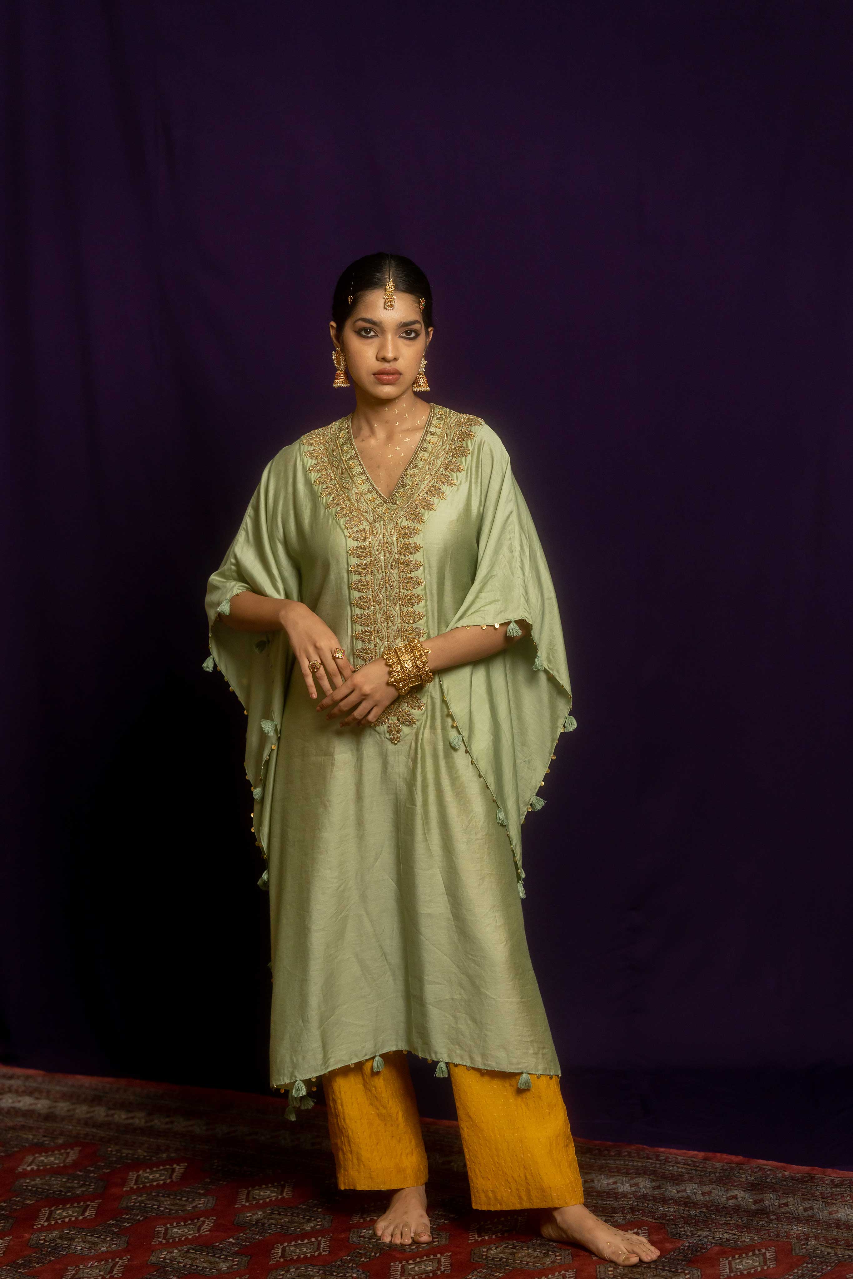 Hana set consists of a kaftan which is crafted in mint green/purple cotton silk. It features a combination of marodi, zardosi and gota kasab techniques. It has a heavily embroidered yolk.