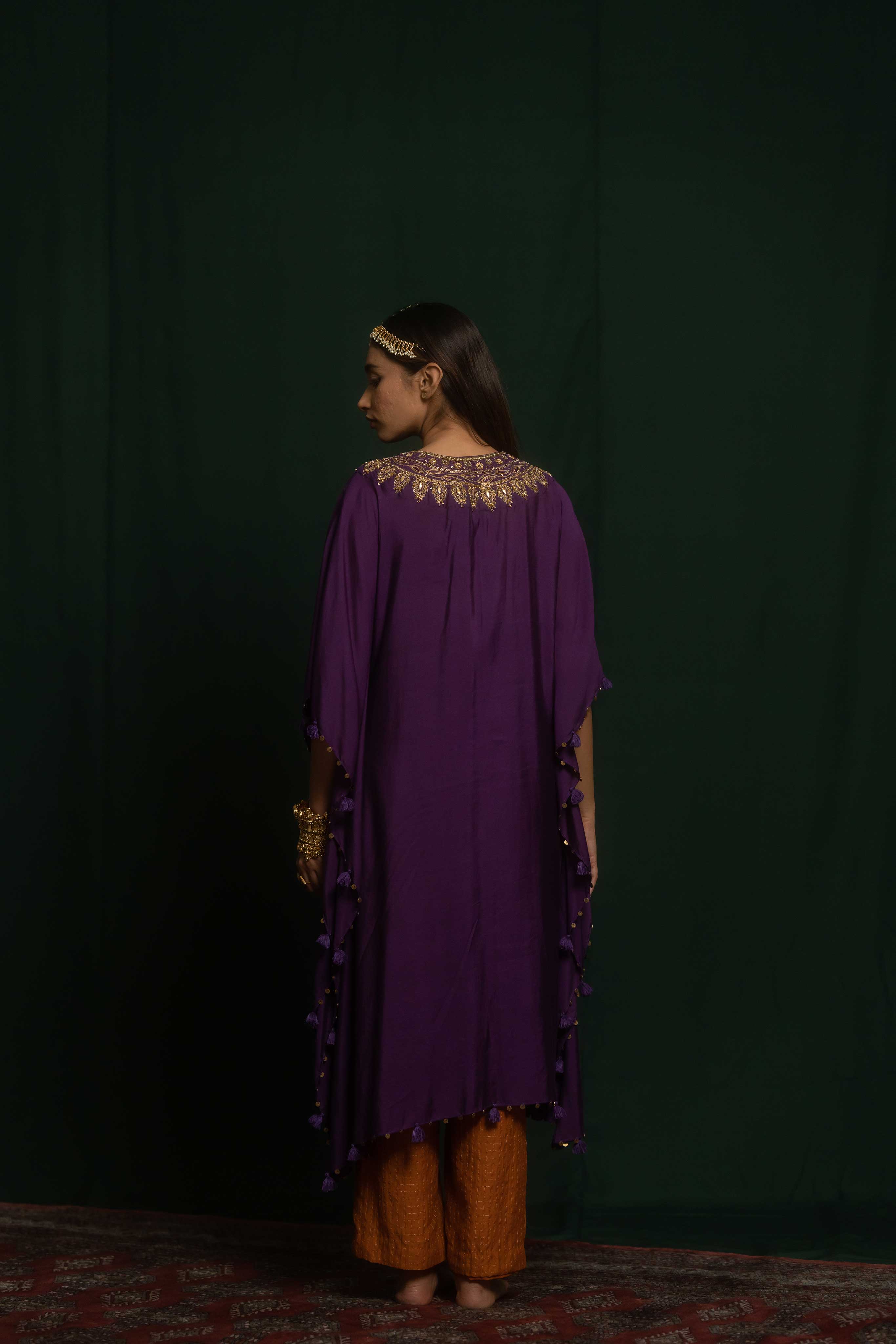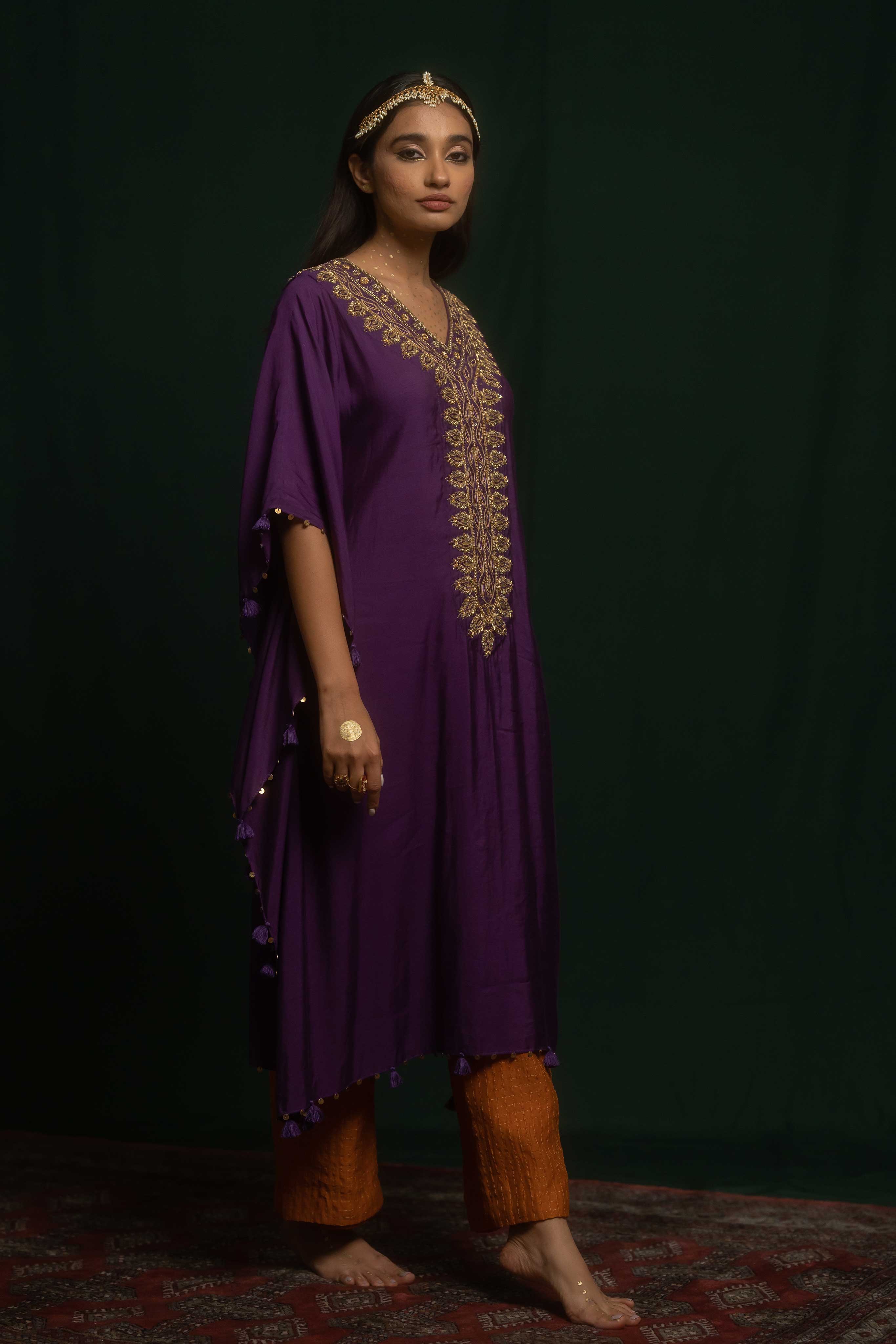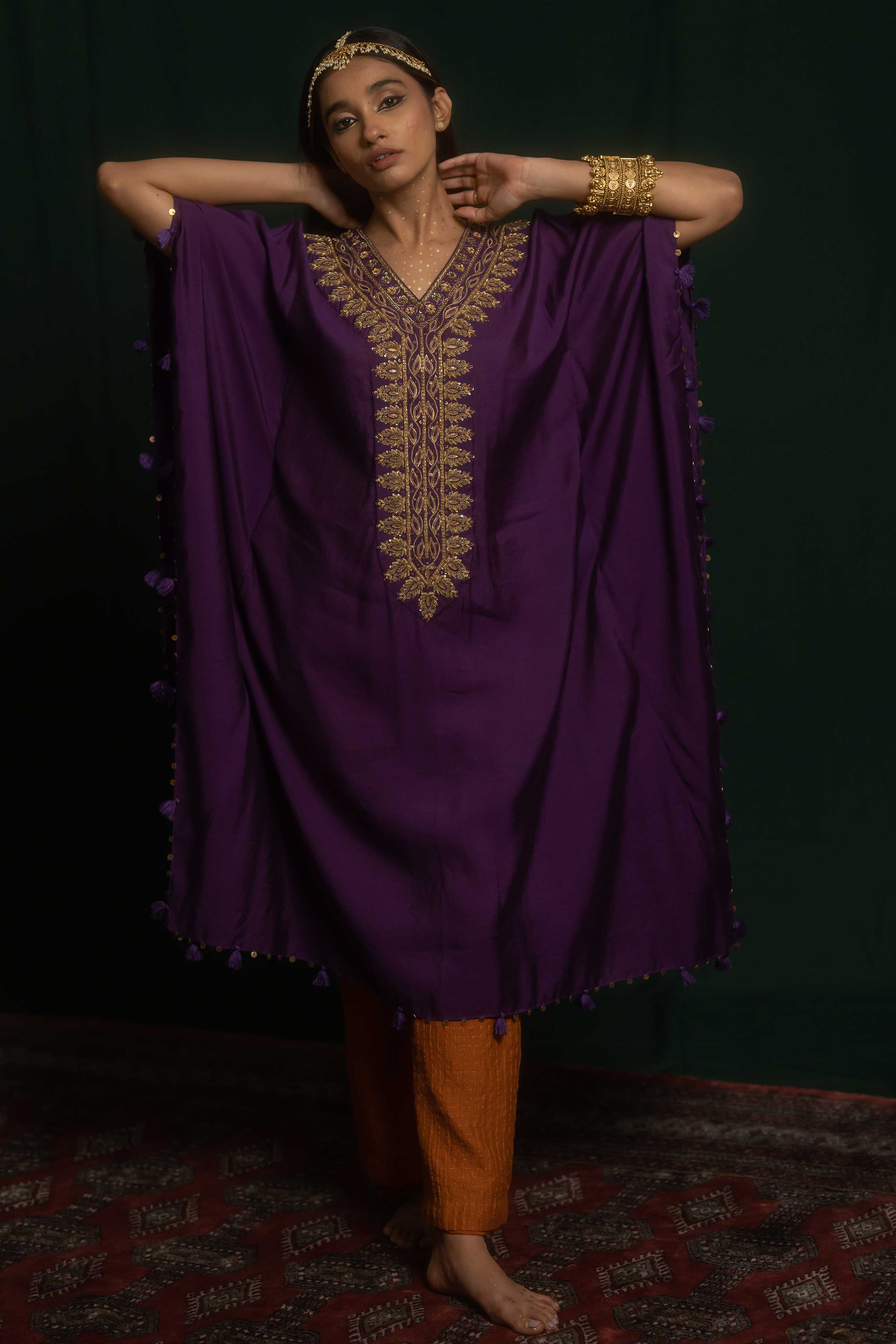 Hana set consists of a kaftan which is crafted in mint green/purple cotton silk. It features a combination of marodi, zardosi and gota kasab techniques. It has a heavily embroidered yolk.
