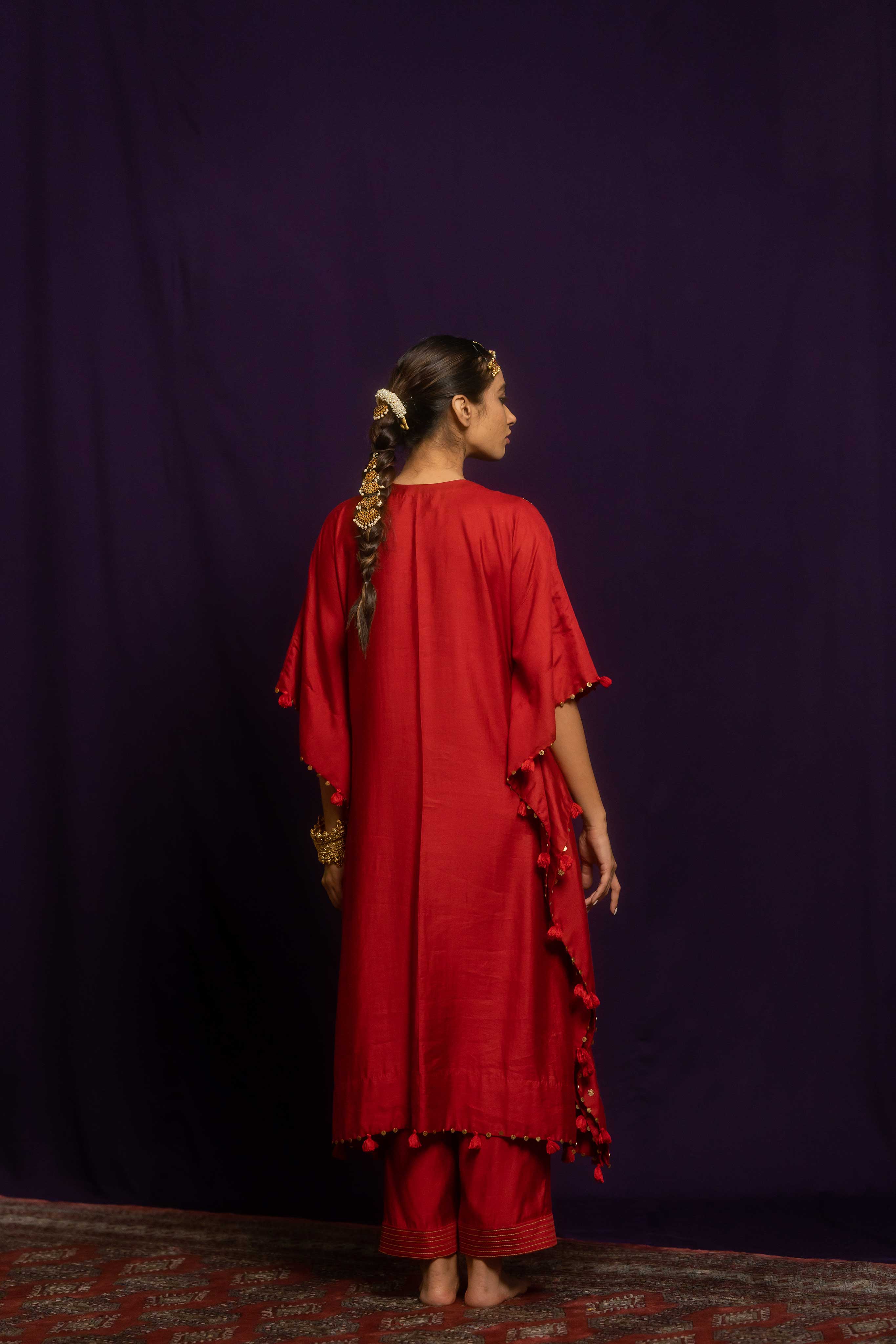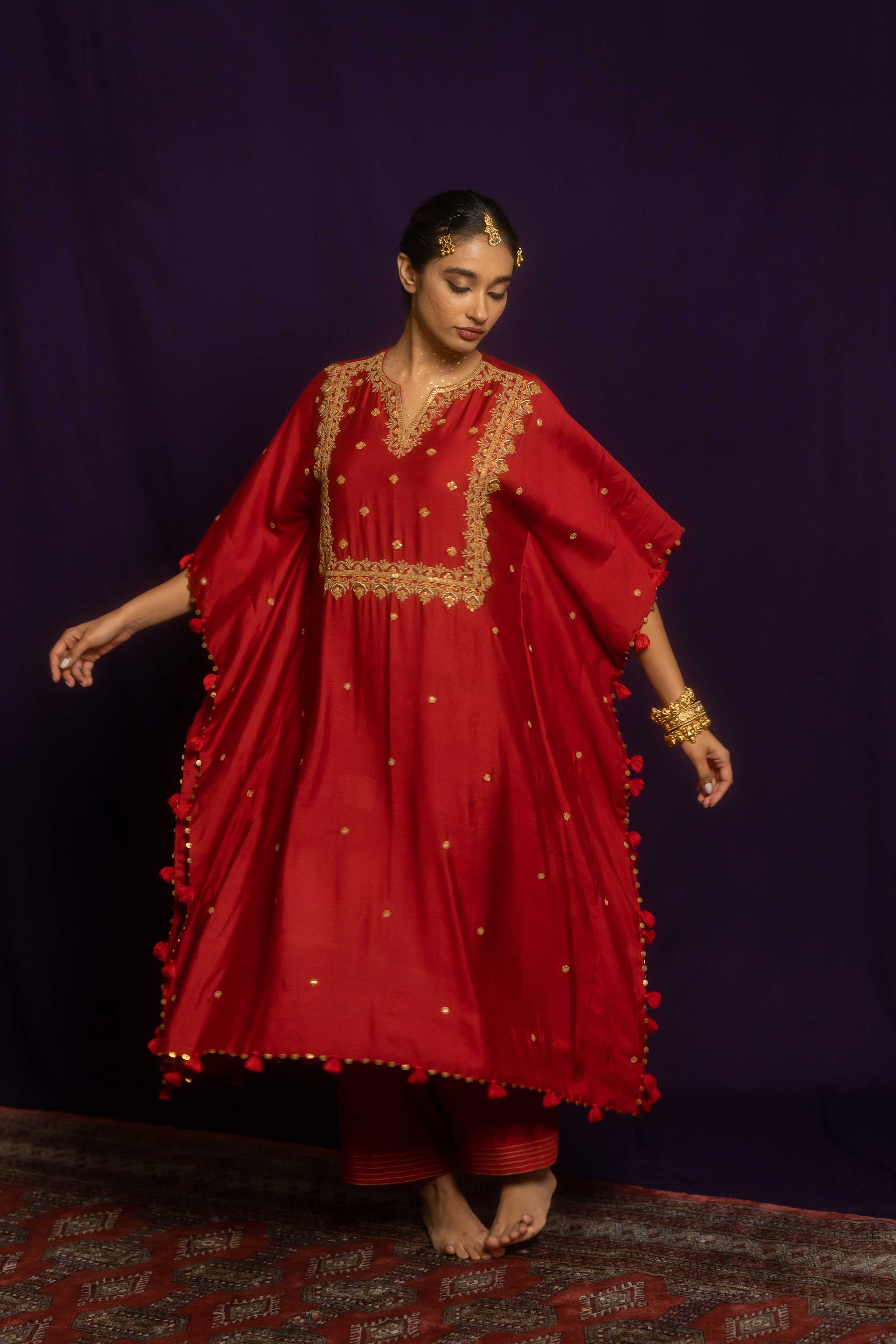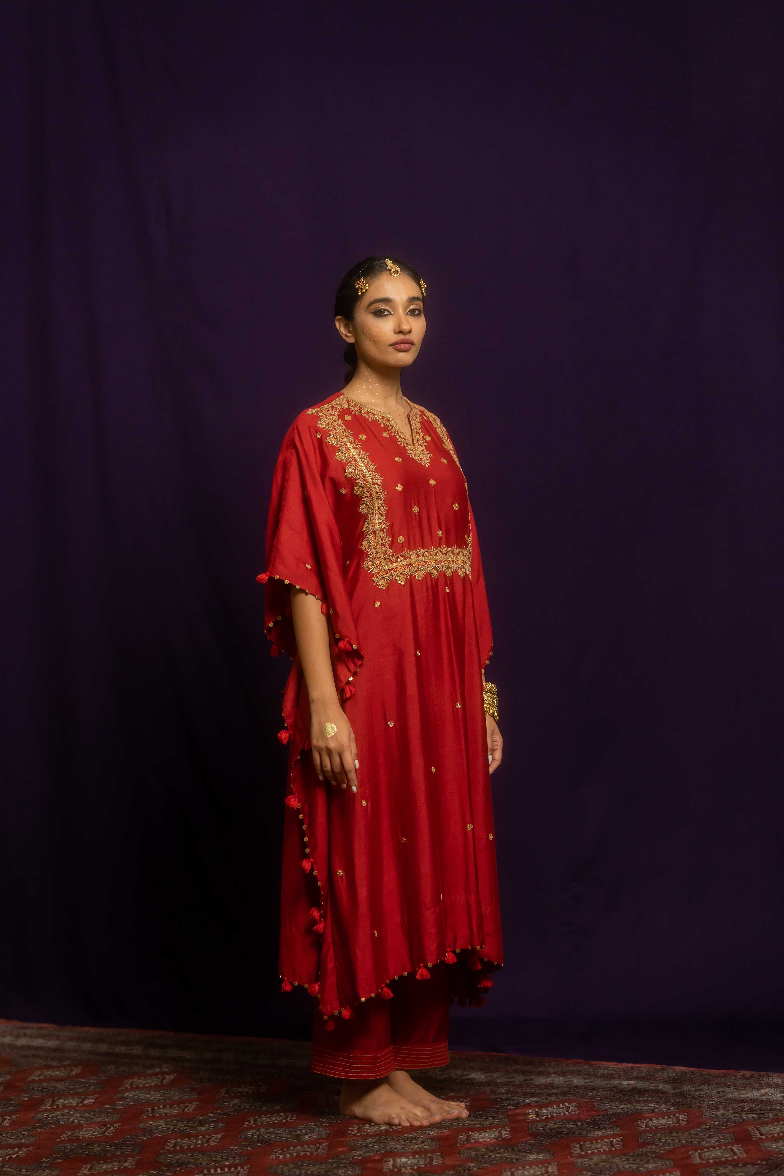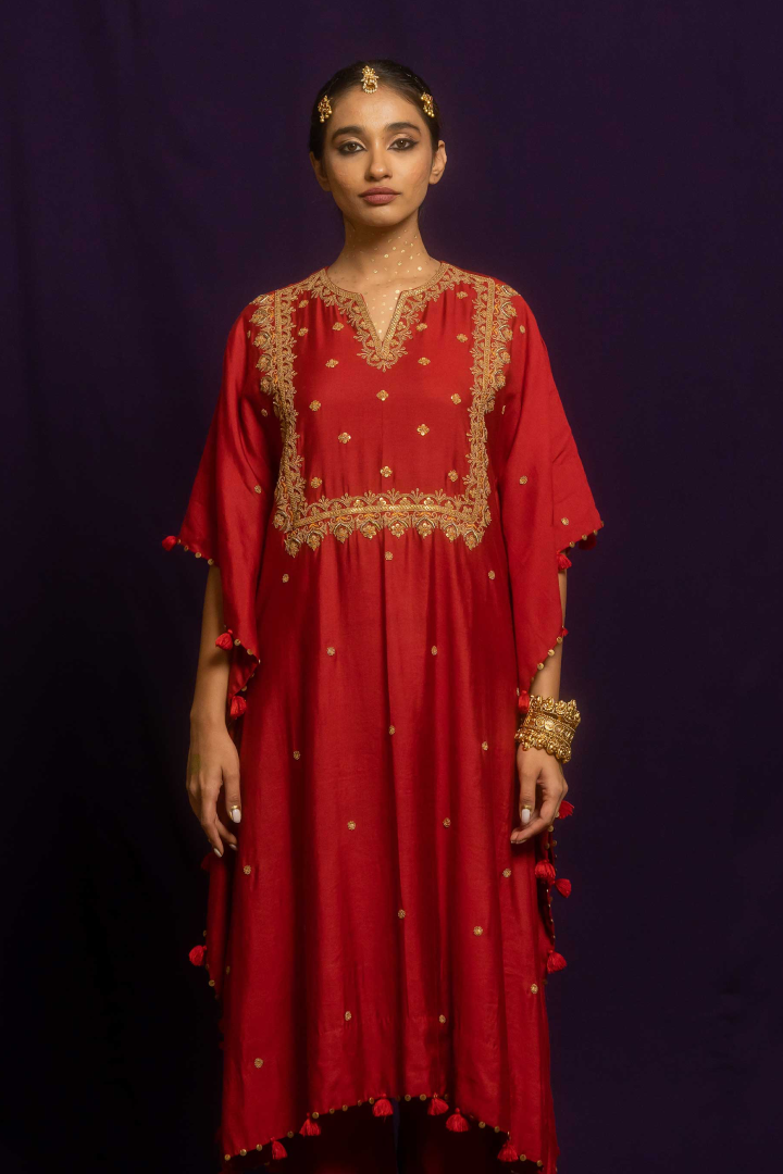 Huda Set consists of a kaftan which is crafted from red/yellow cotton silk. The delicate embroidery is done in the marodi embriodery technique with flower motifs around the yoke and tassels details the edges. Paired with cotton silk embroidered pants.