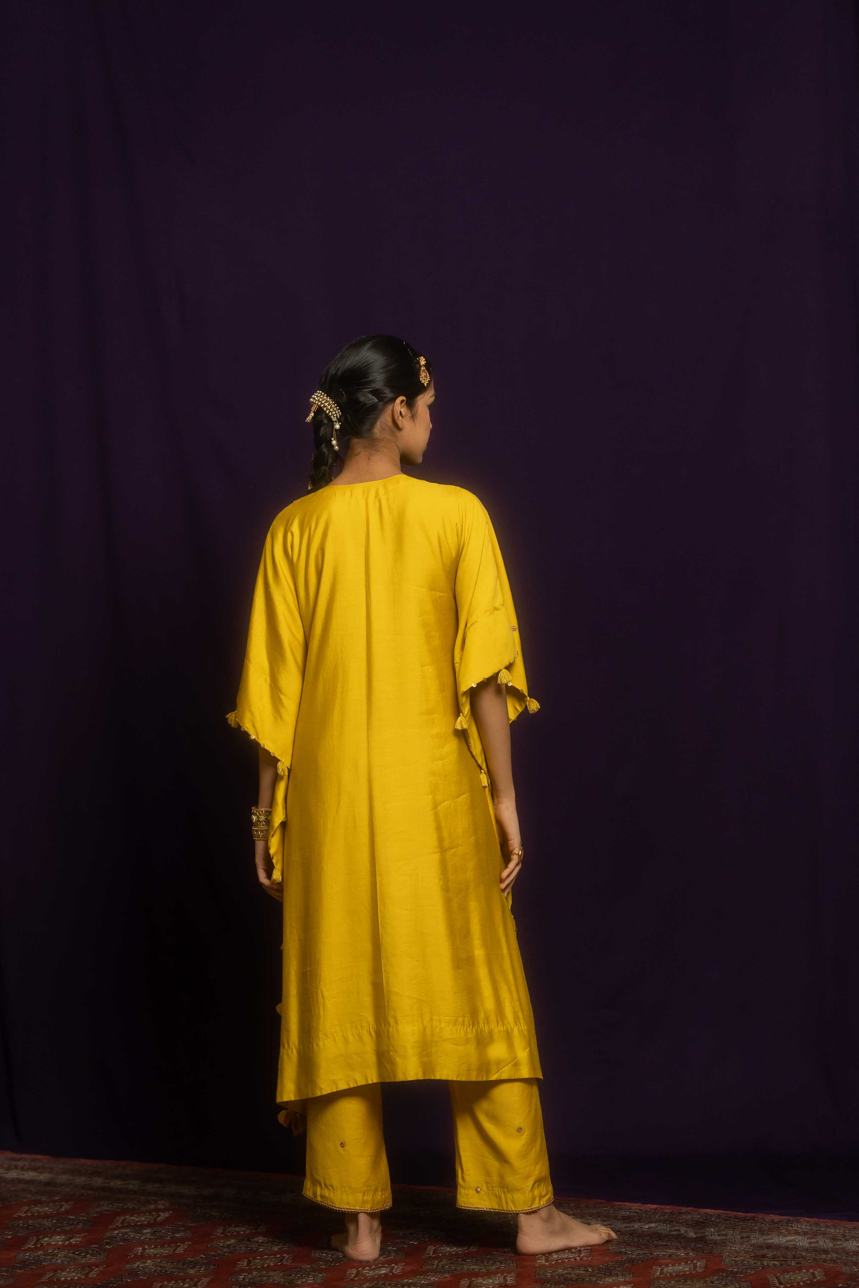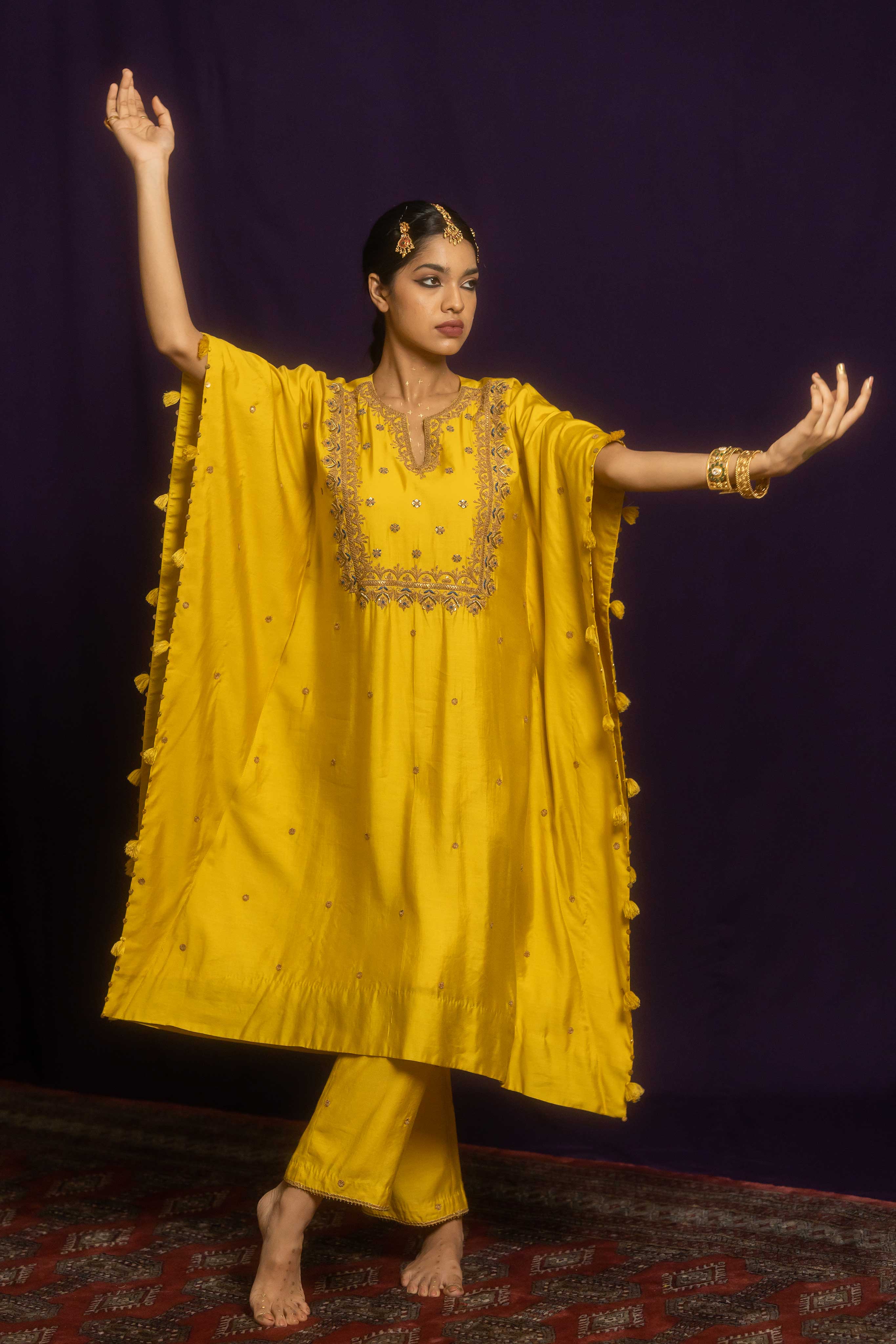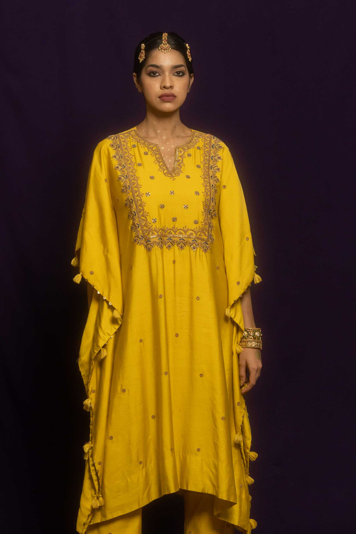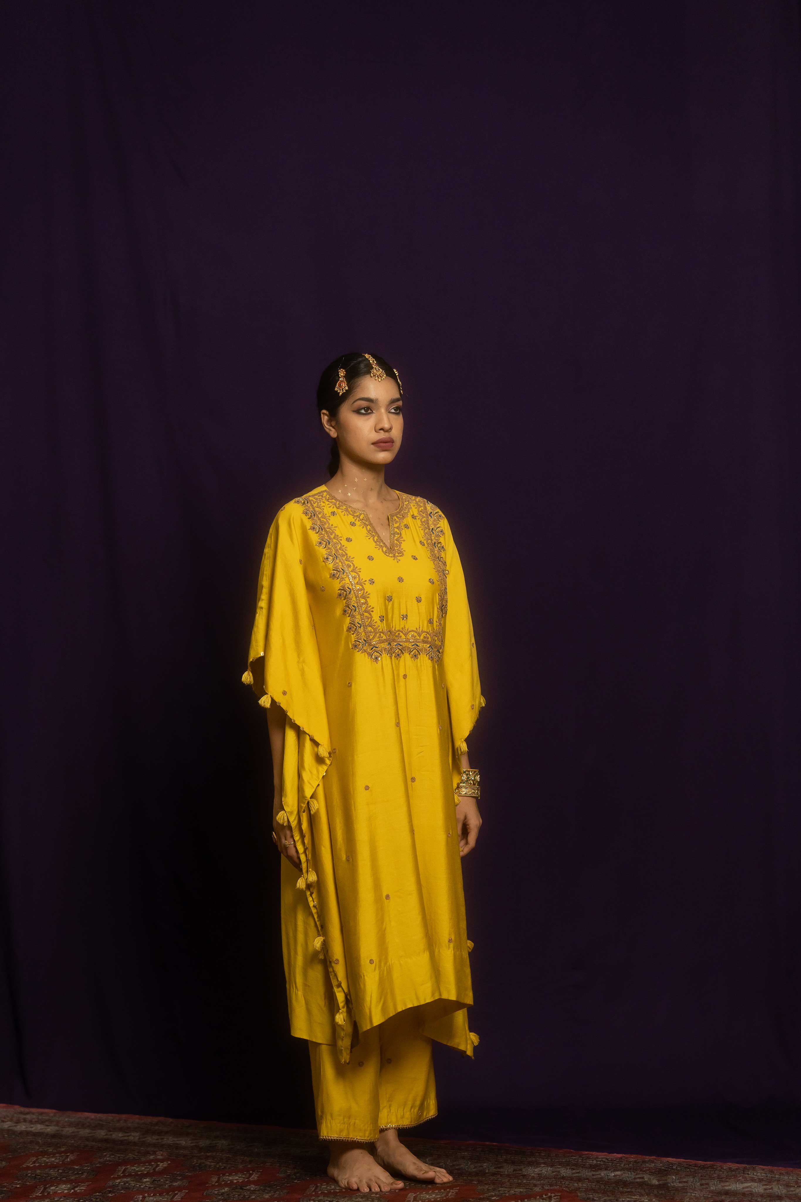 Huda Set consists of a kaftan which is crafted from red/yellow cotton silk. The delicate embroidery is done in the marodi embriodery technique with flower motifs around the yoke and tassels details the edges. Paired with cotton silk embroidered pants.