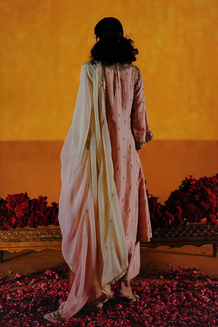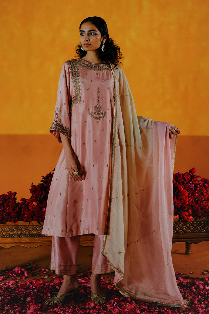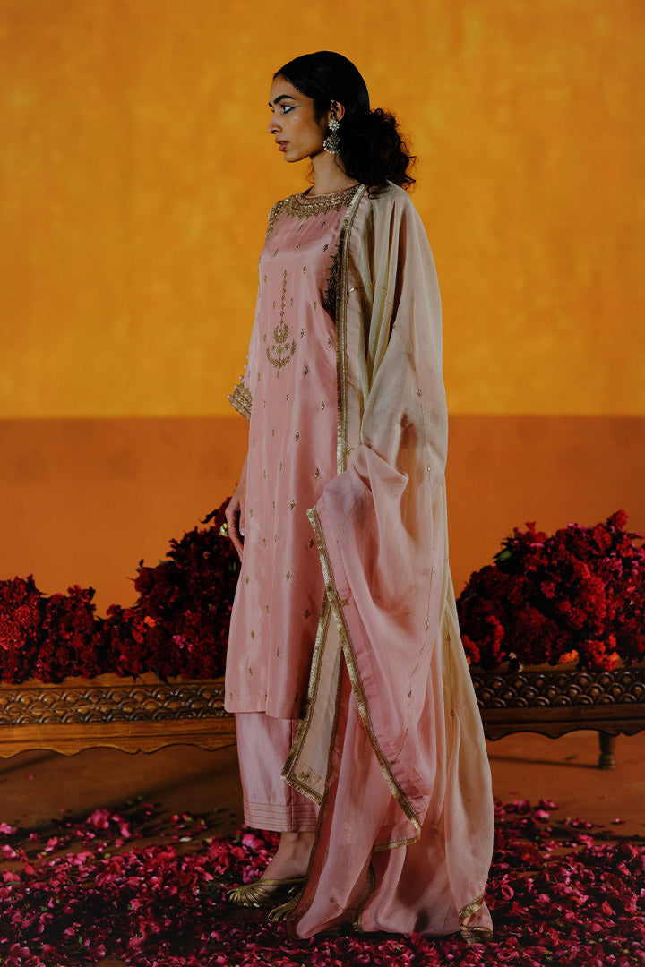 Juhi Kurta Pant Dupatta Set features kurta adorned with zardozi detailing on the neckline and cuffs, enhanced with all-over tikki embroidery, paired with matching pants featuring hem detailing and a handcrafted dupatta with all-over embroidery.