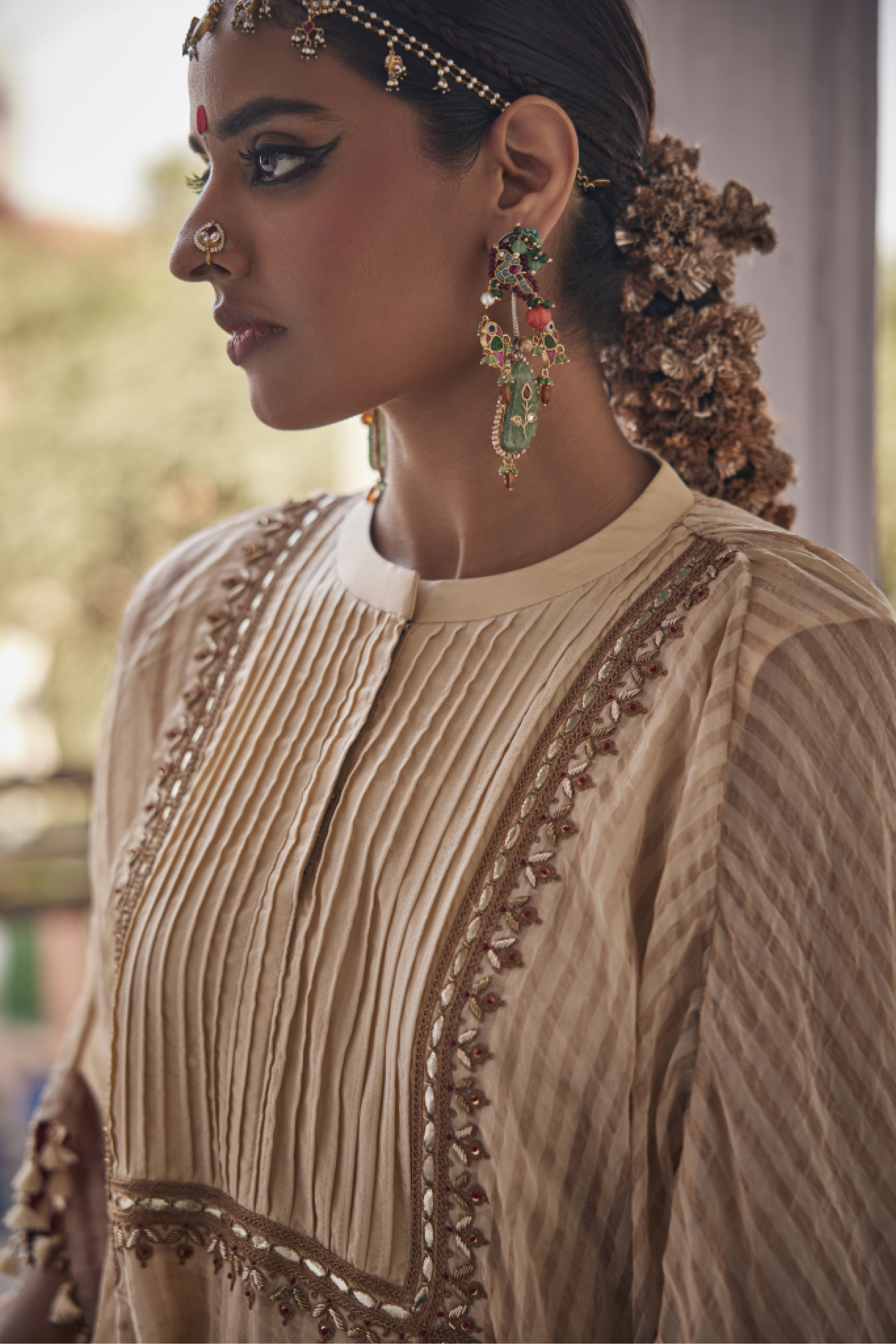 Kalini kurta is crafted in ivory stripe tissue fabric. It features an embroidered yolk in marodi, zardozi and kasab gota techniques with a chinese collar and pocket detailing.