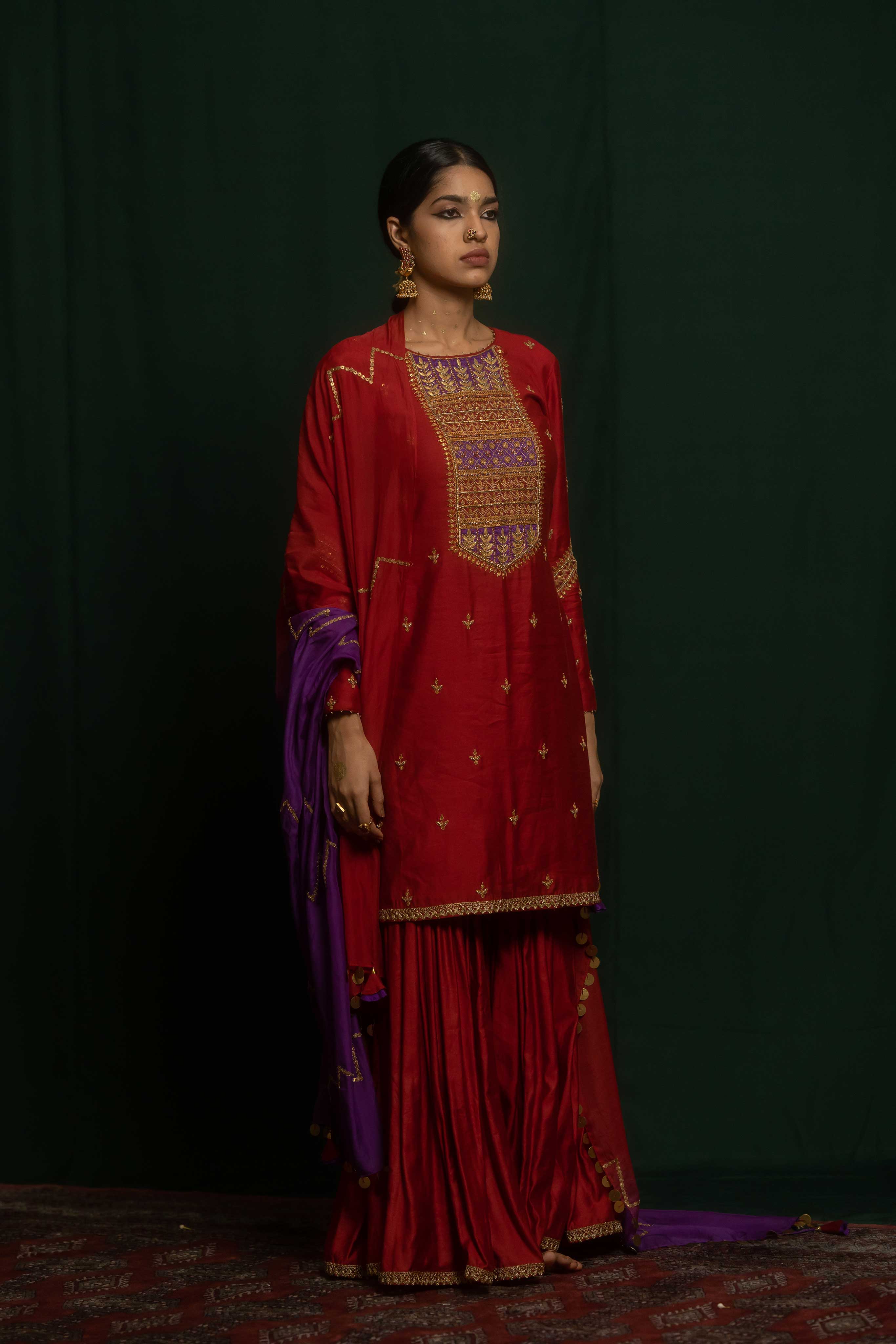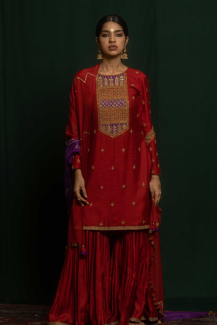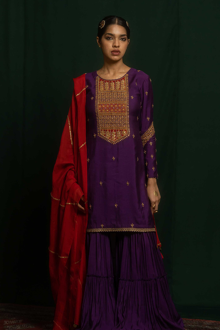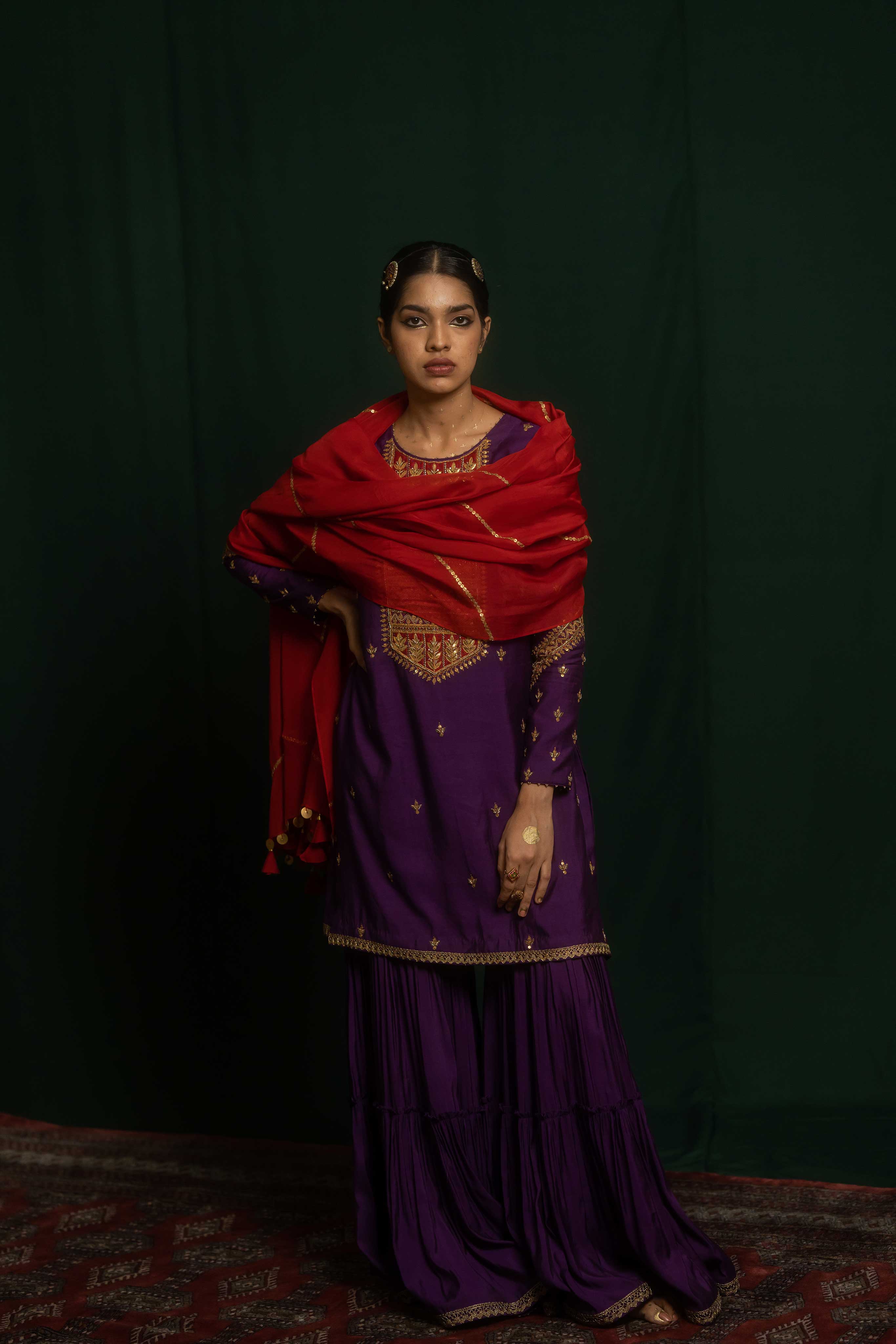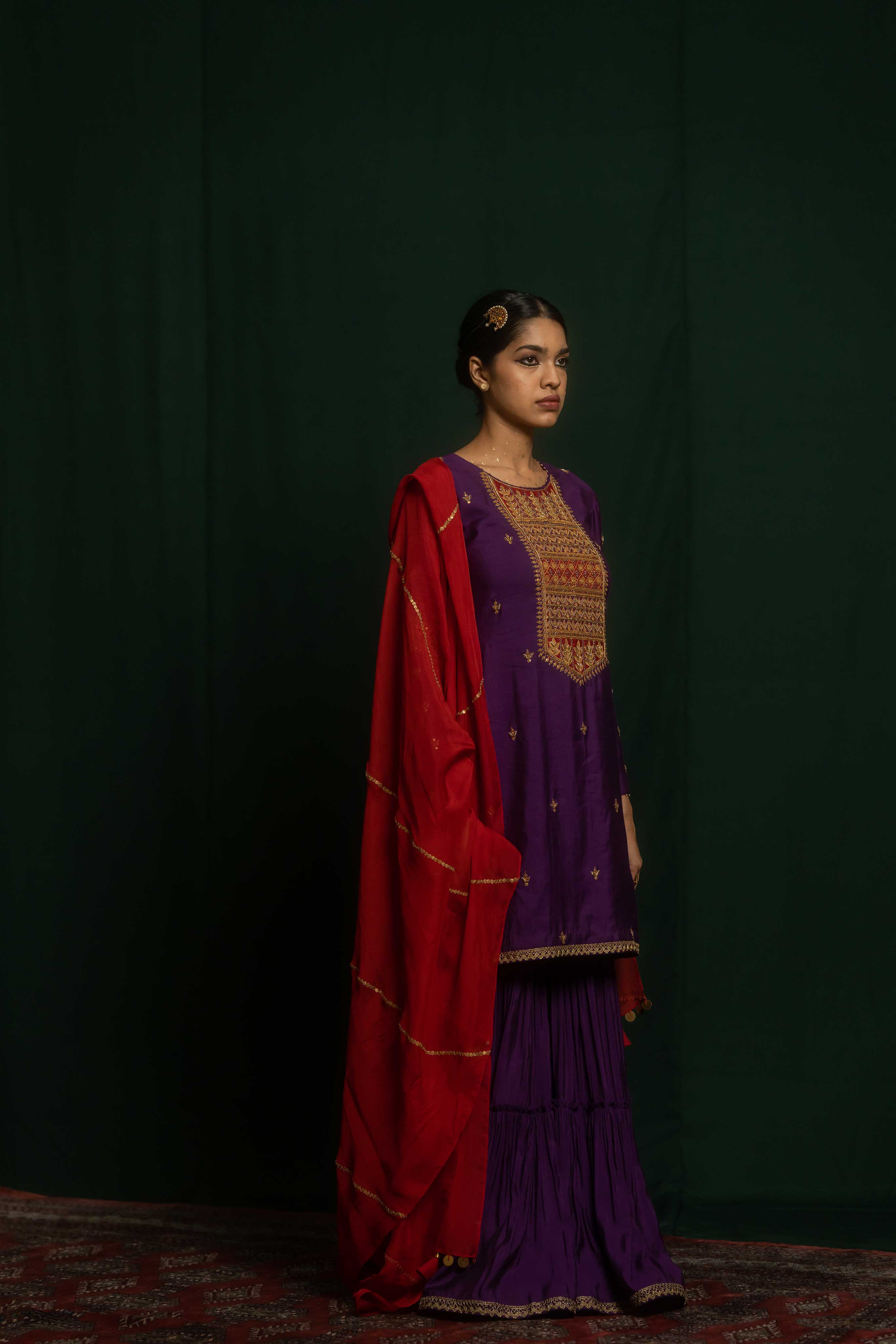 Laila Set consists of a purple/red kurta and sharara which is crafted from cotton silk.It features a combination of marodi, zardozi and kasab gota embroidery techniques with a heavily embroidered yolk and sleeve with intricate floral motifs.