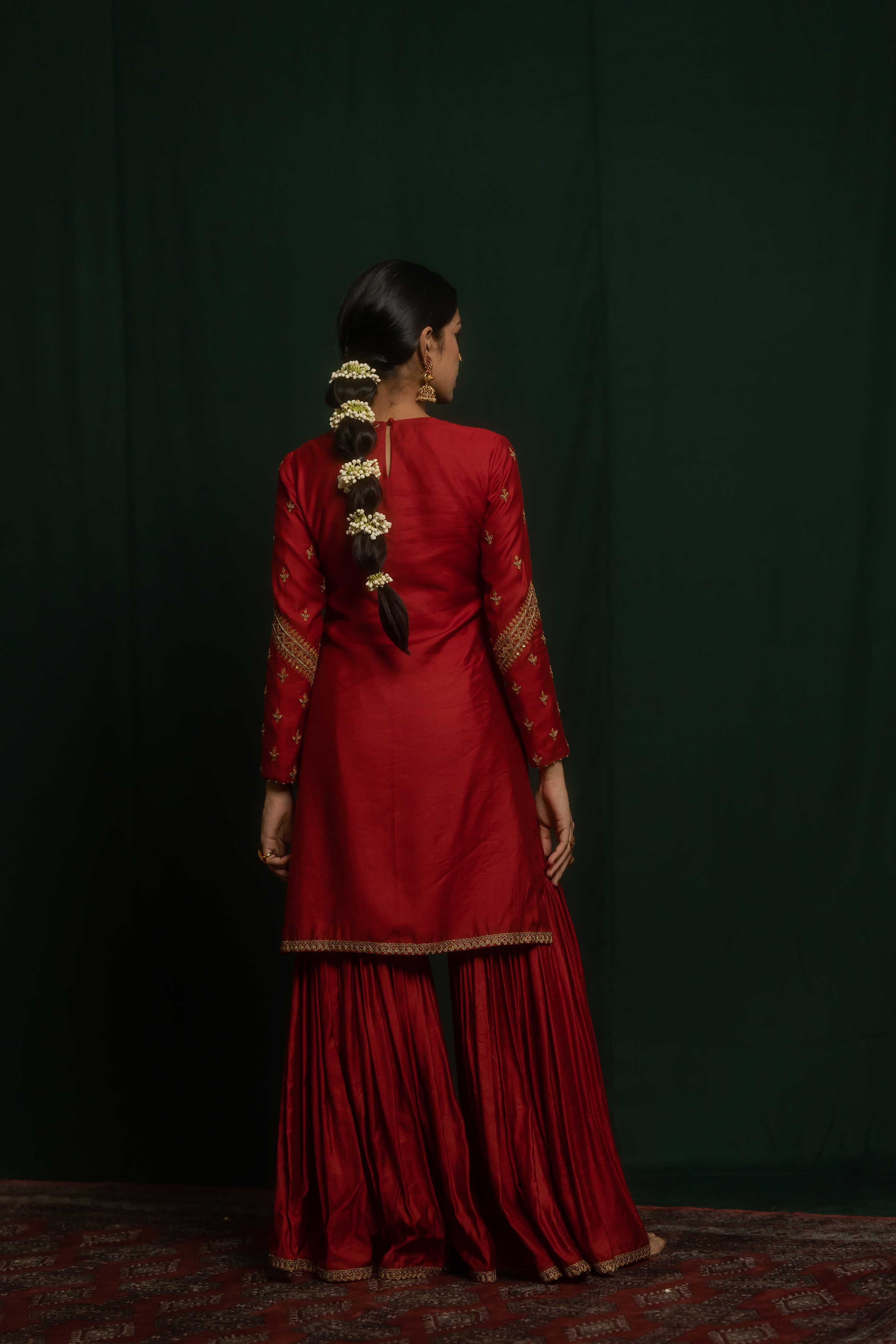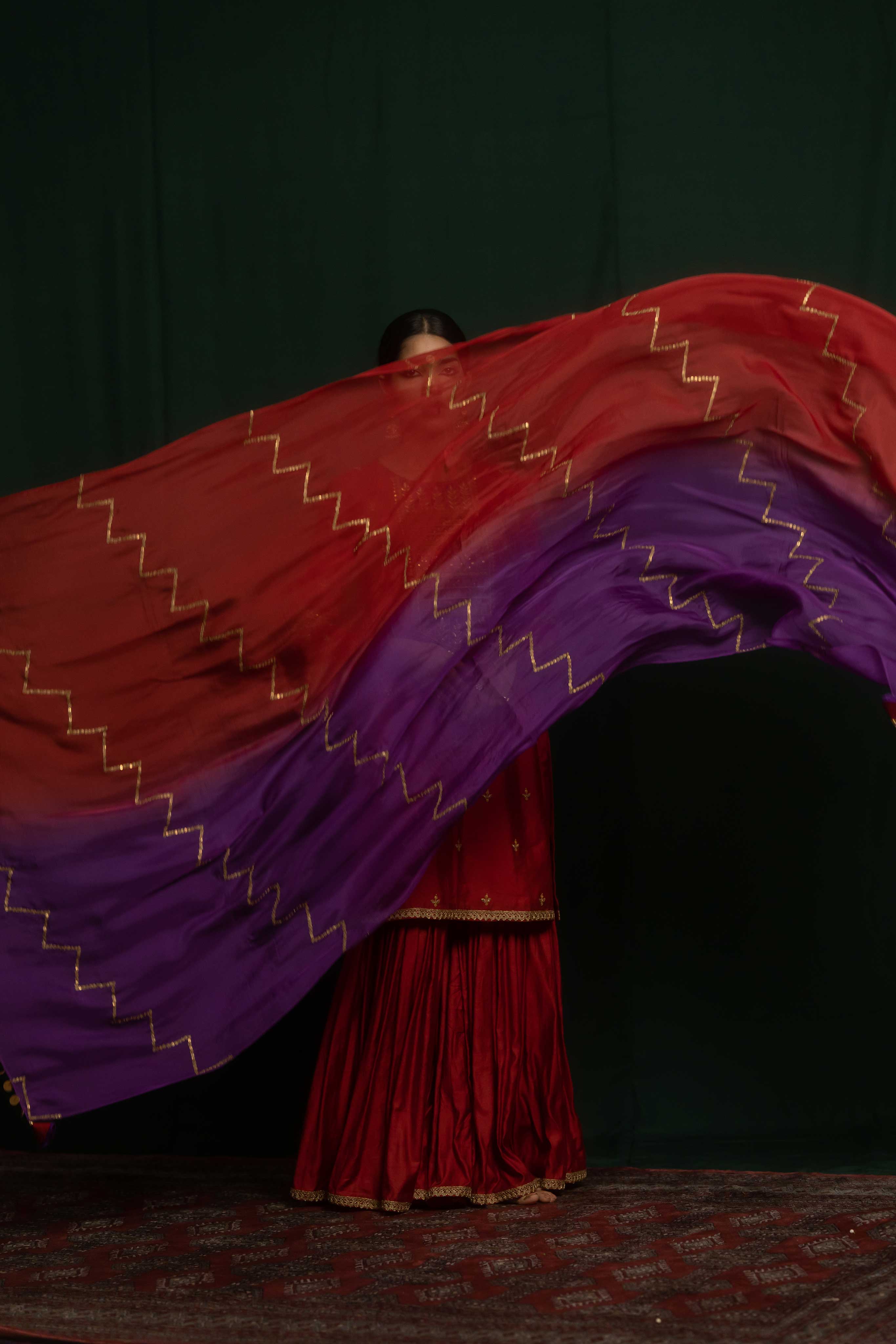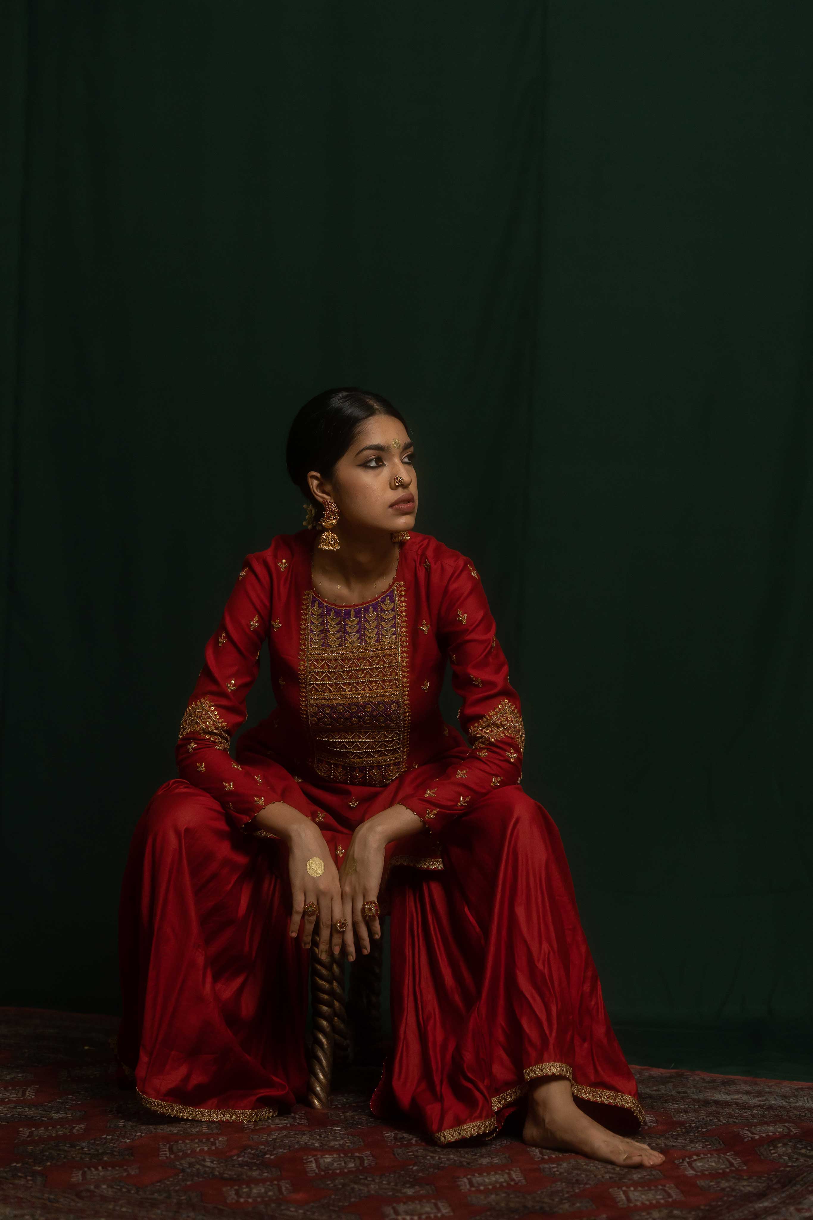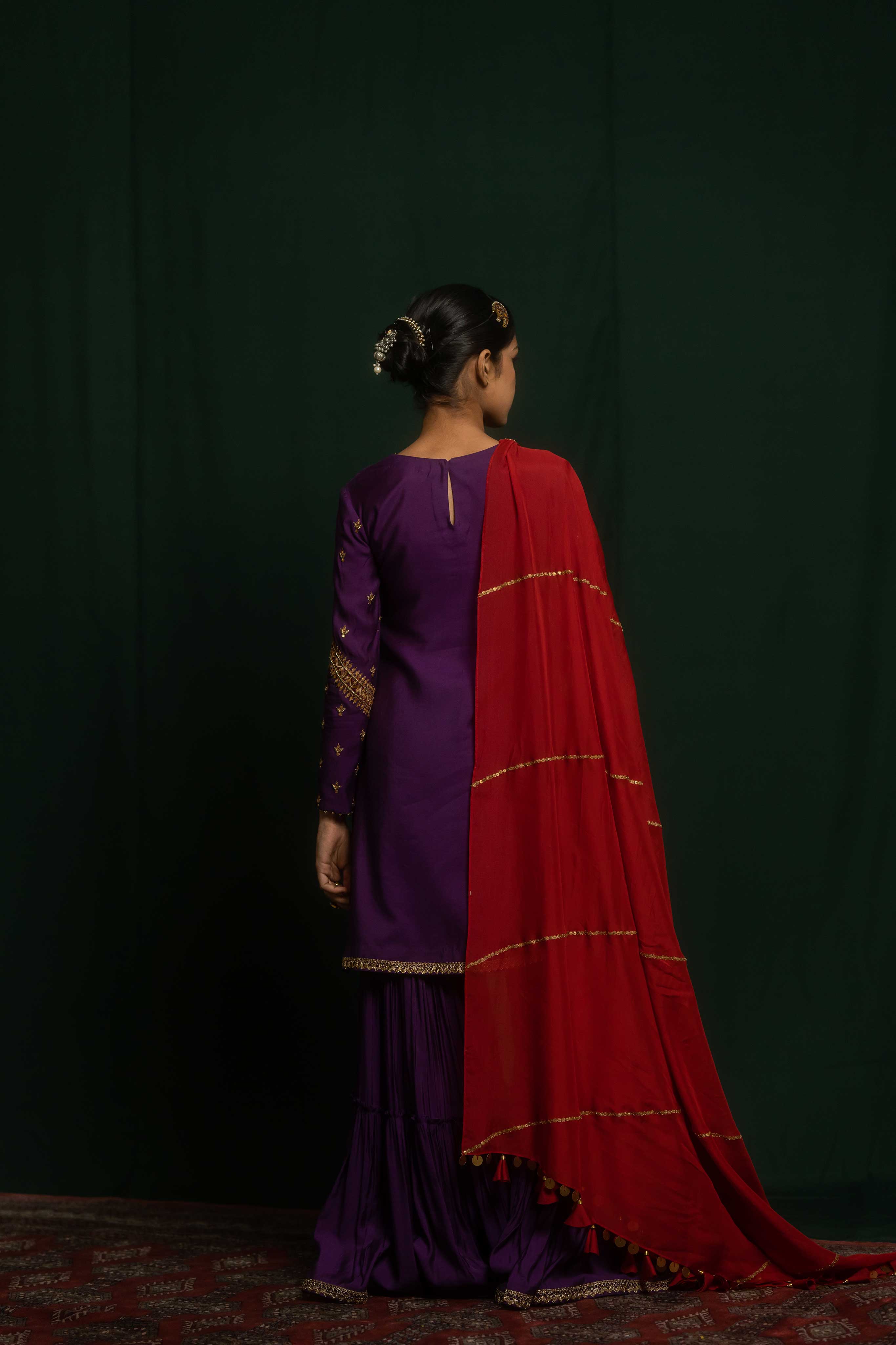 Laila Set consists of a purple/red kurta and sharara which is crafted from cotton silk.It features a combination of marodi, zardozi and kasab gota embroidery techniques with a heavily embroidered yolk and sleeve with intricate floral motifs.