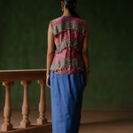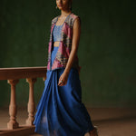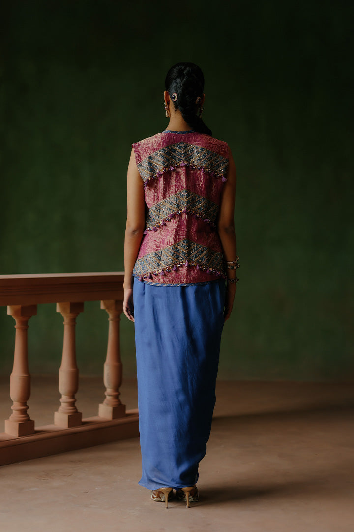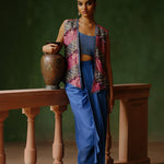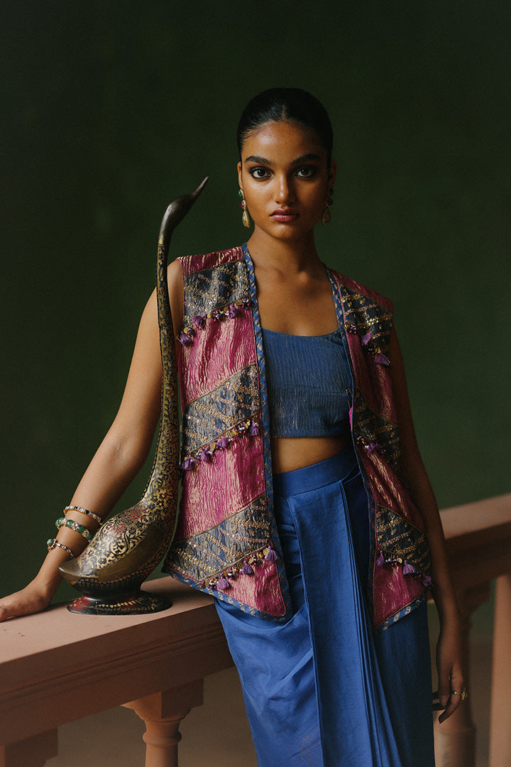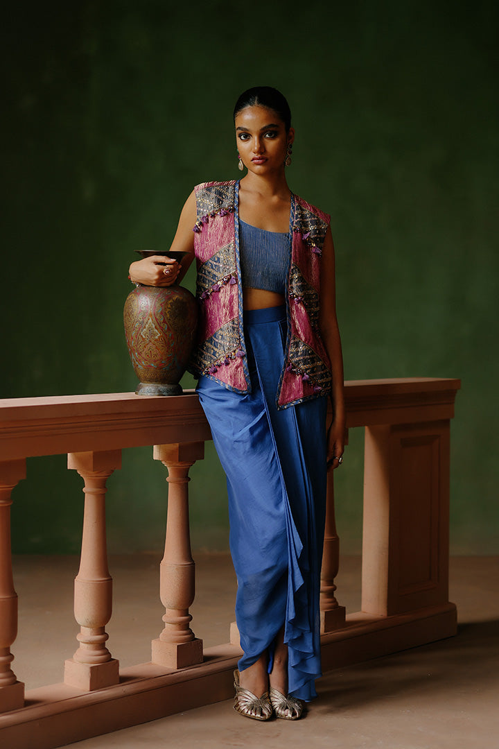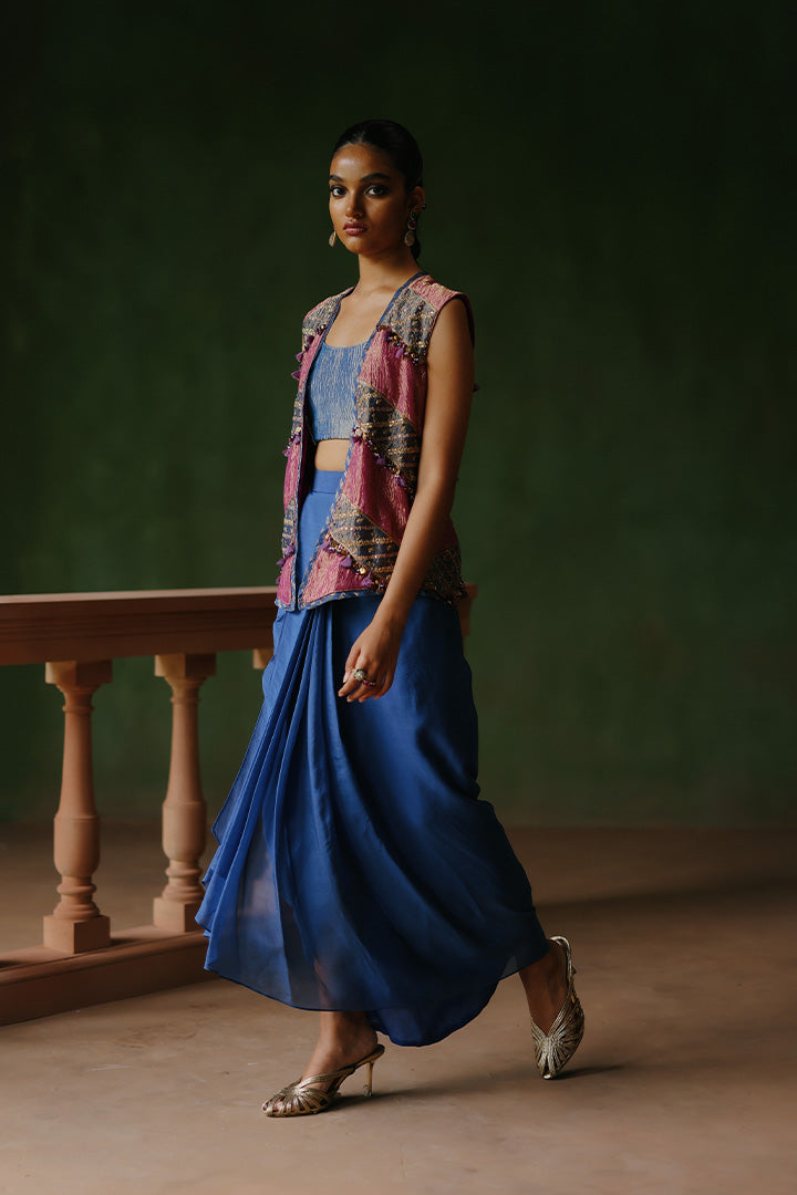 The Leena jacket set features a panelled crushed tissue jacket with marodi and resham embriodery accented with tassels. It has a crushed tissue bustier and paired with an organza drape skirt.