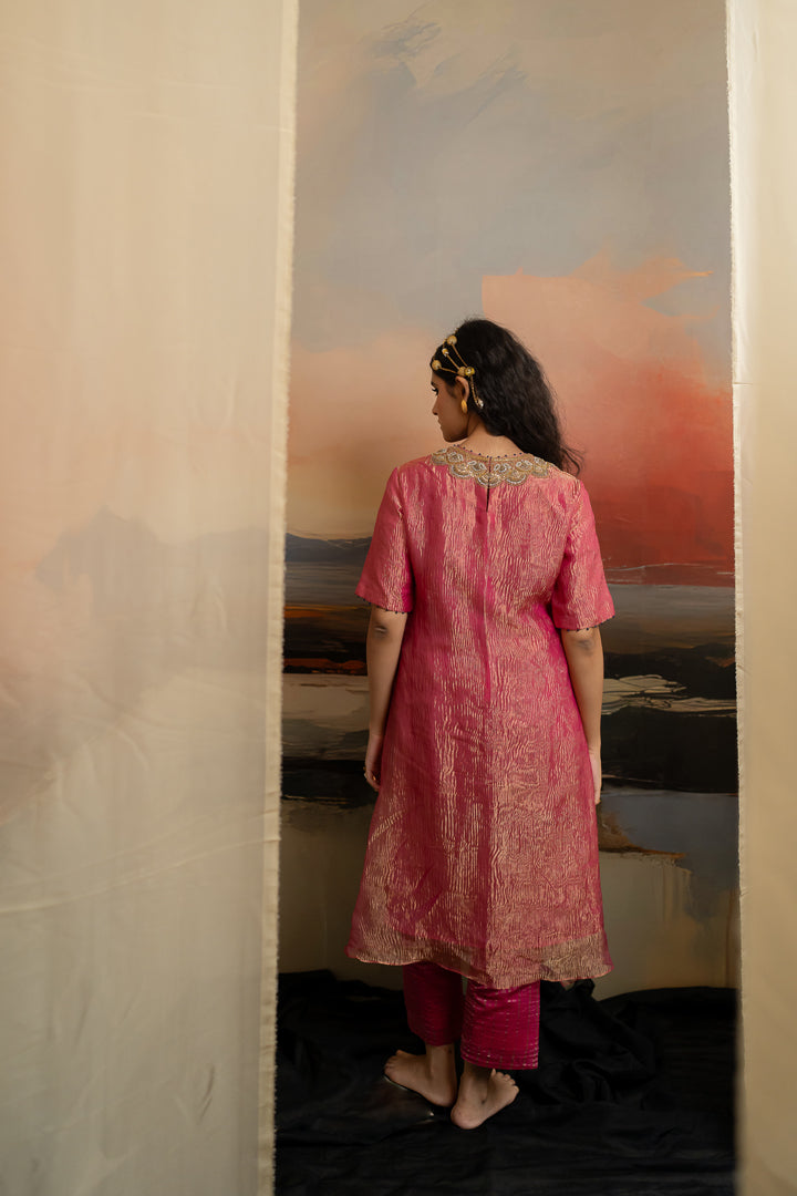 Lida set consists of a drape kurta which is crafted in rani pink handwoven crushed tissue. The neckline features a combination of marodi and zardosi embroidery with tassel detailing at the neck and on the sleeves.