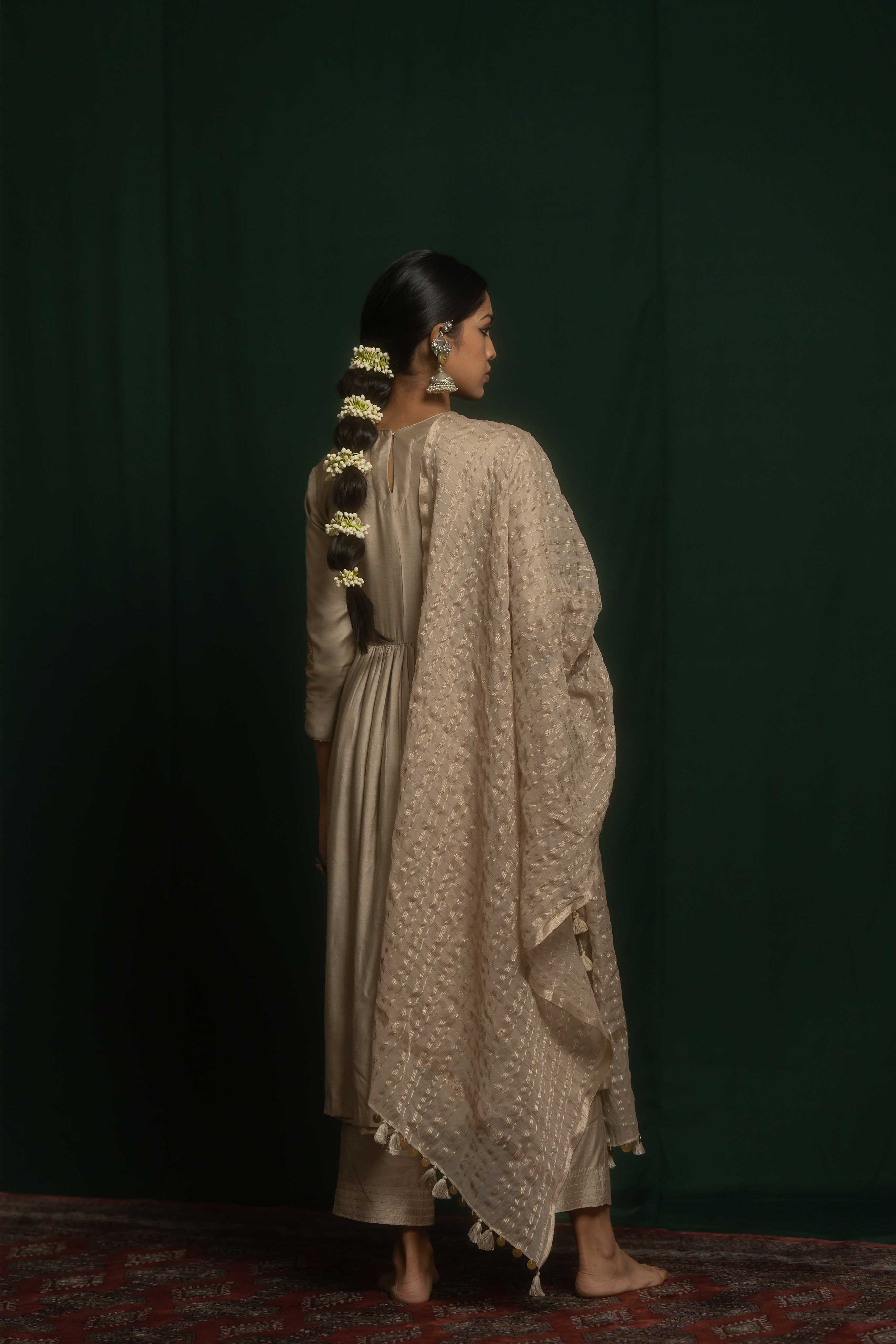 The dupatta is made in woven tissue with tassel details at the edges.