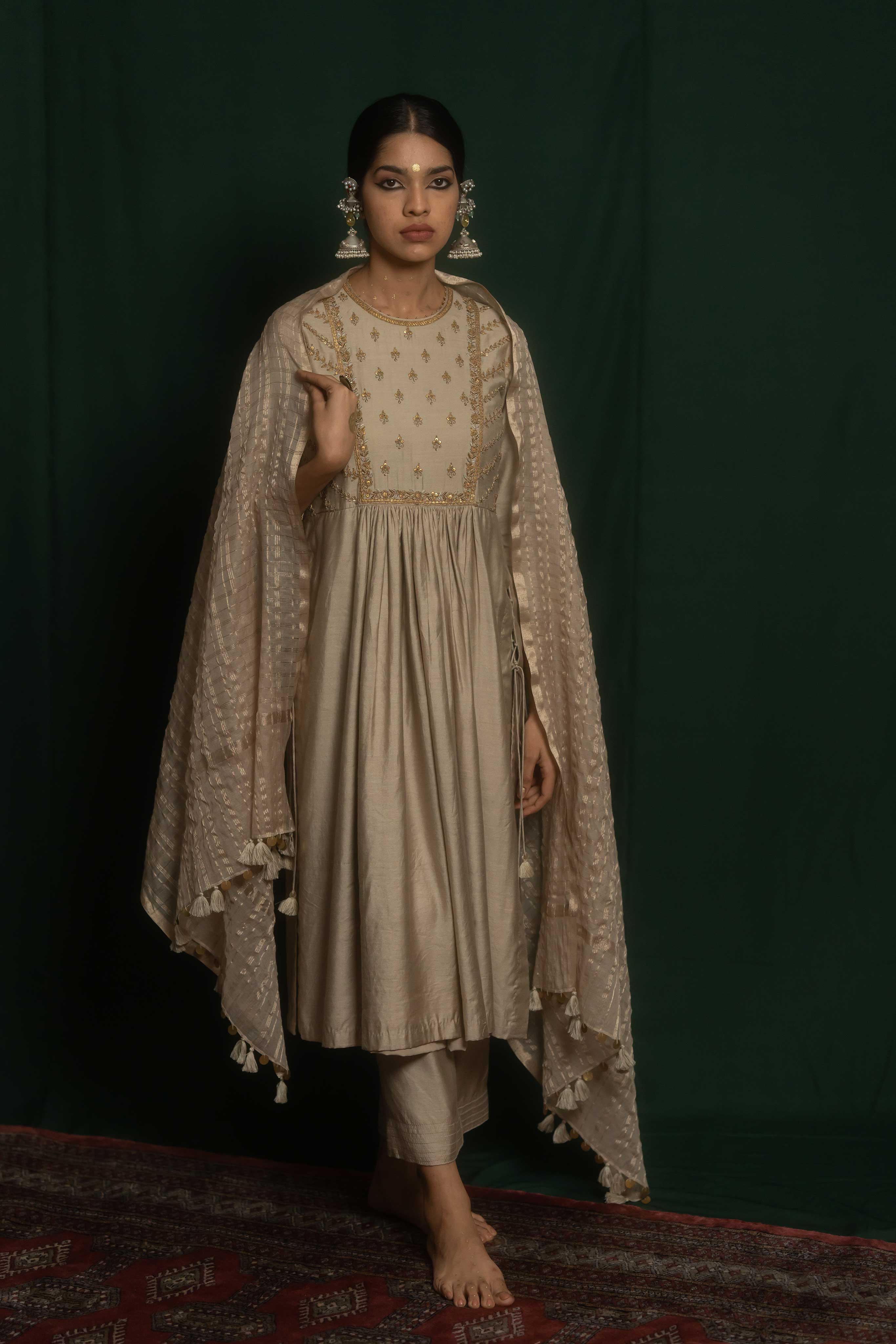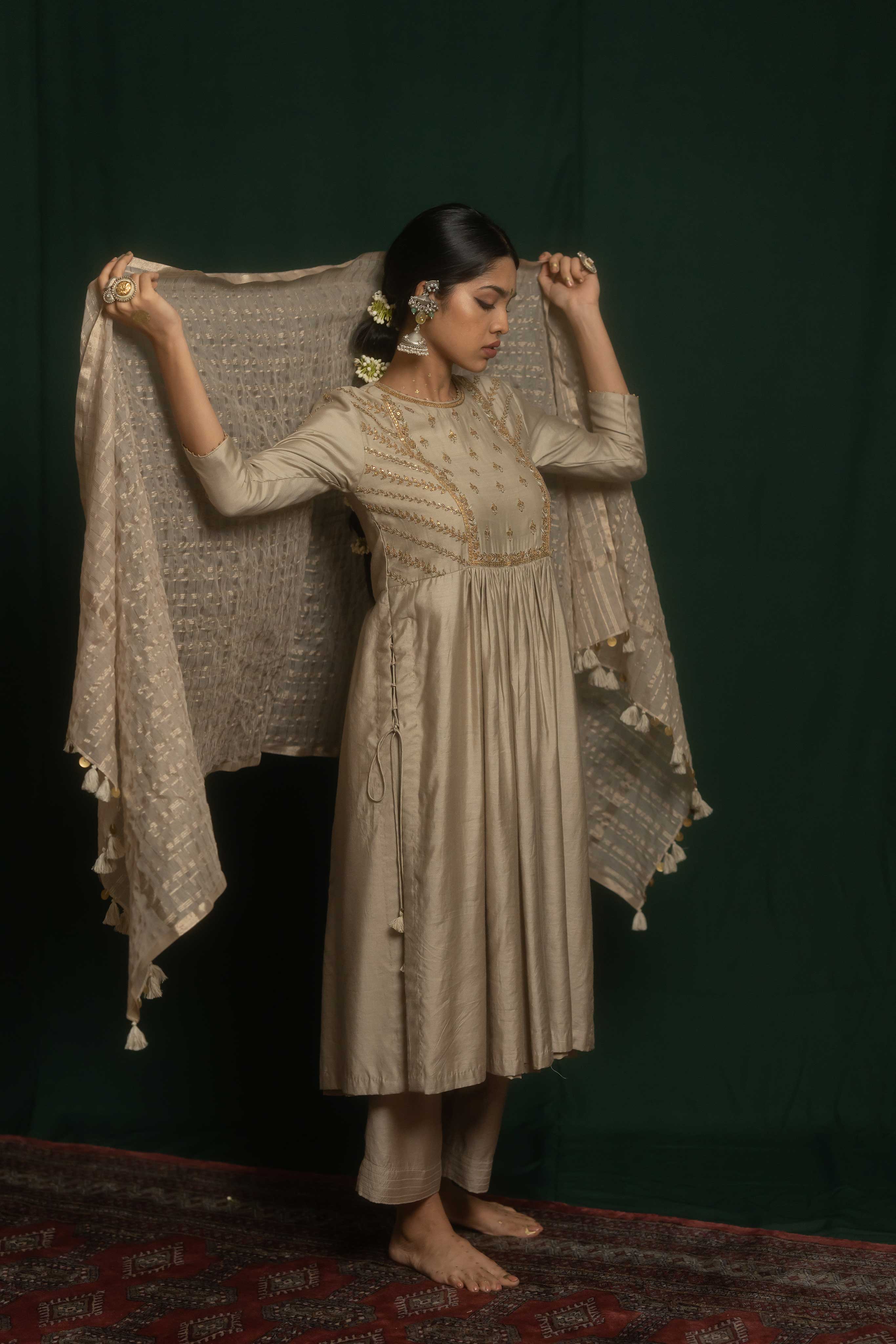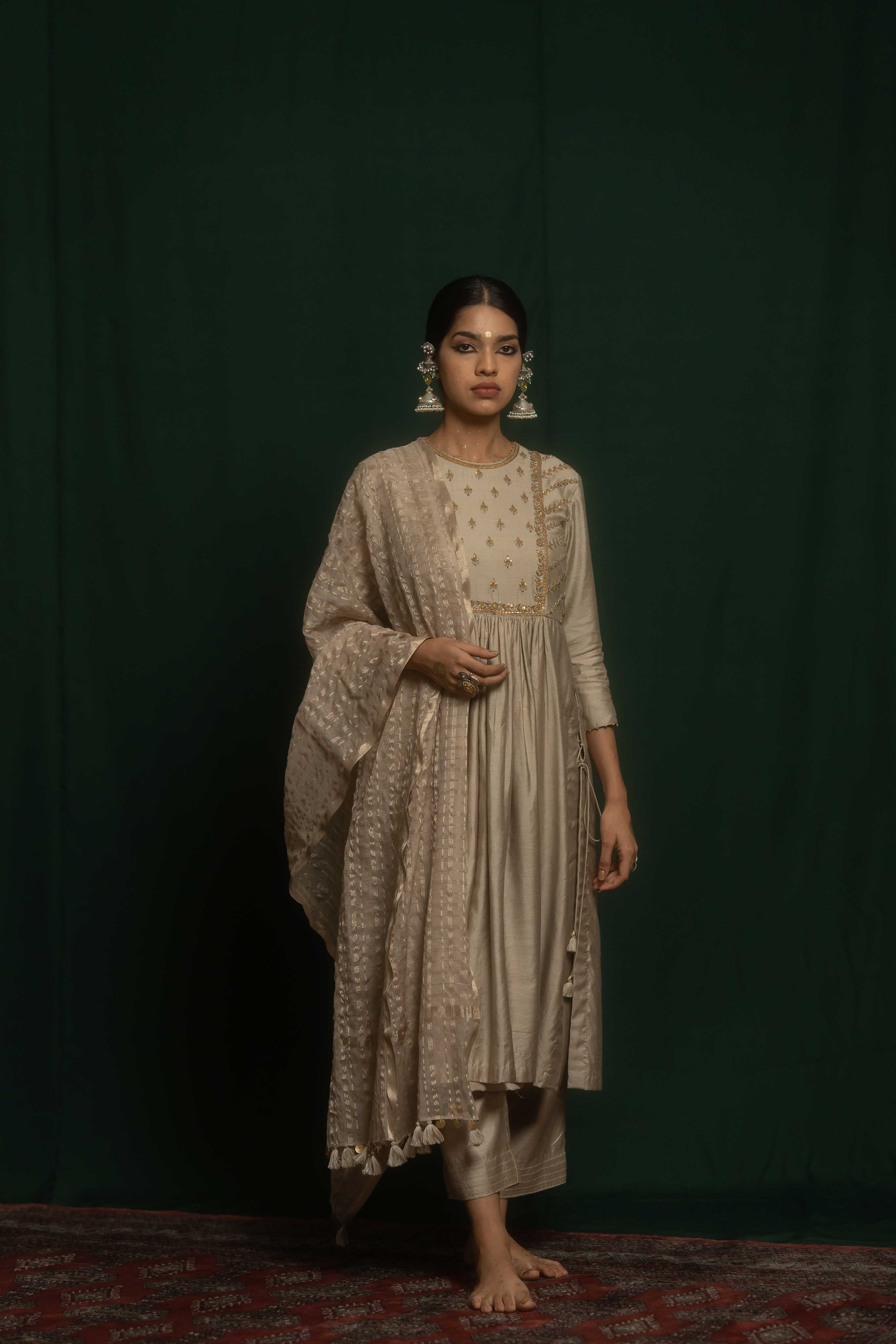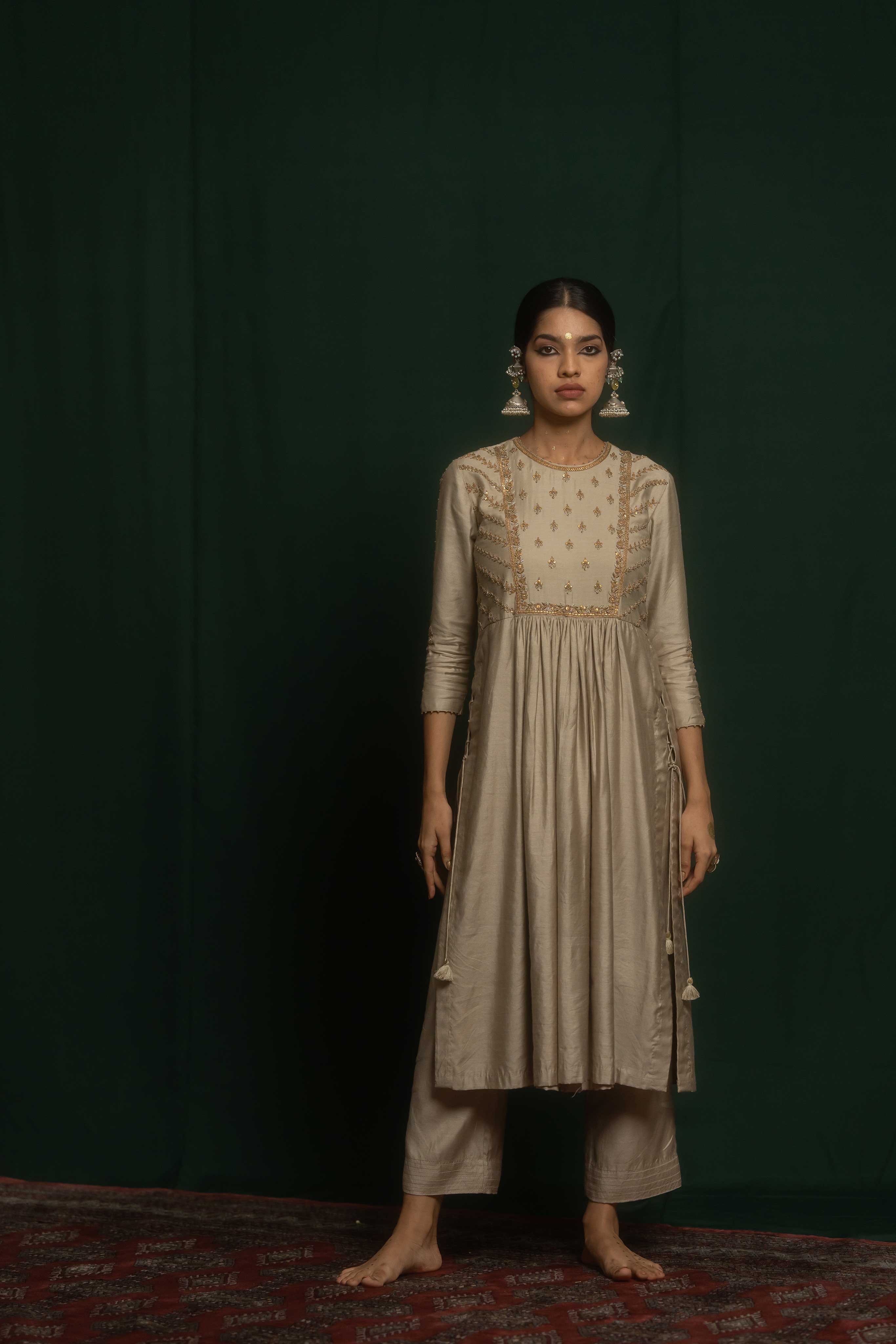 Maha set consists of a straight kurta and pant crafted from grey cotton silk. It features a combination of marodi and resham embroidery techniques with an embroidered yolk and sleeve with delicate floral motifs.