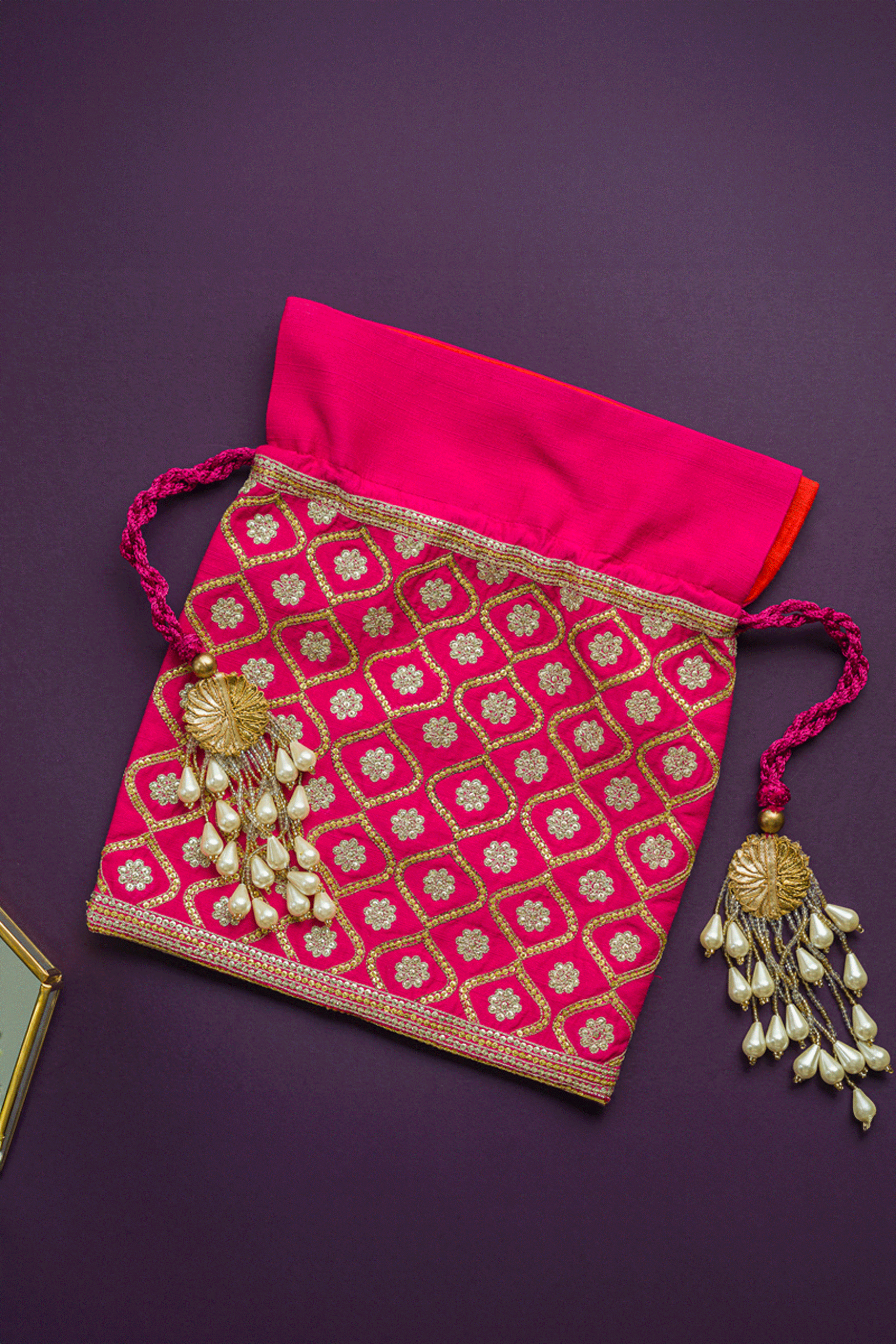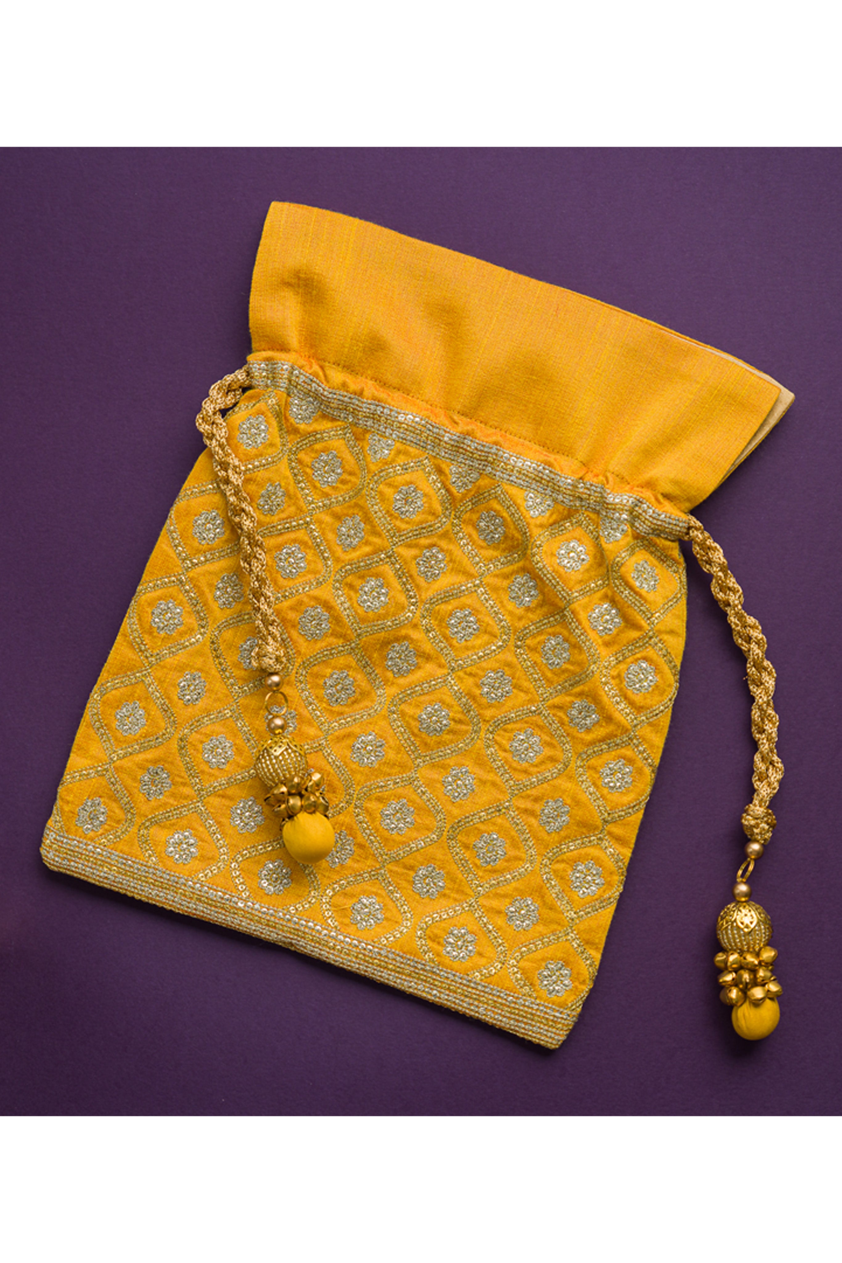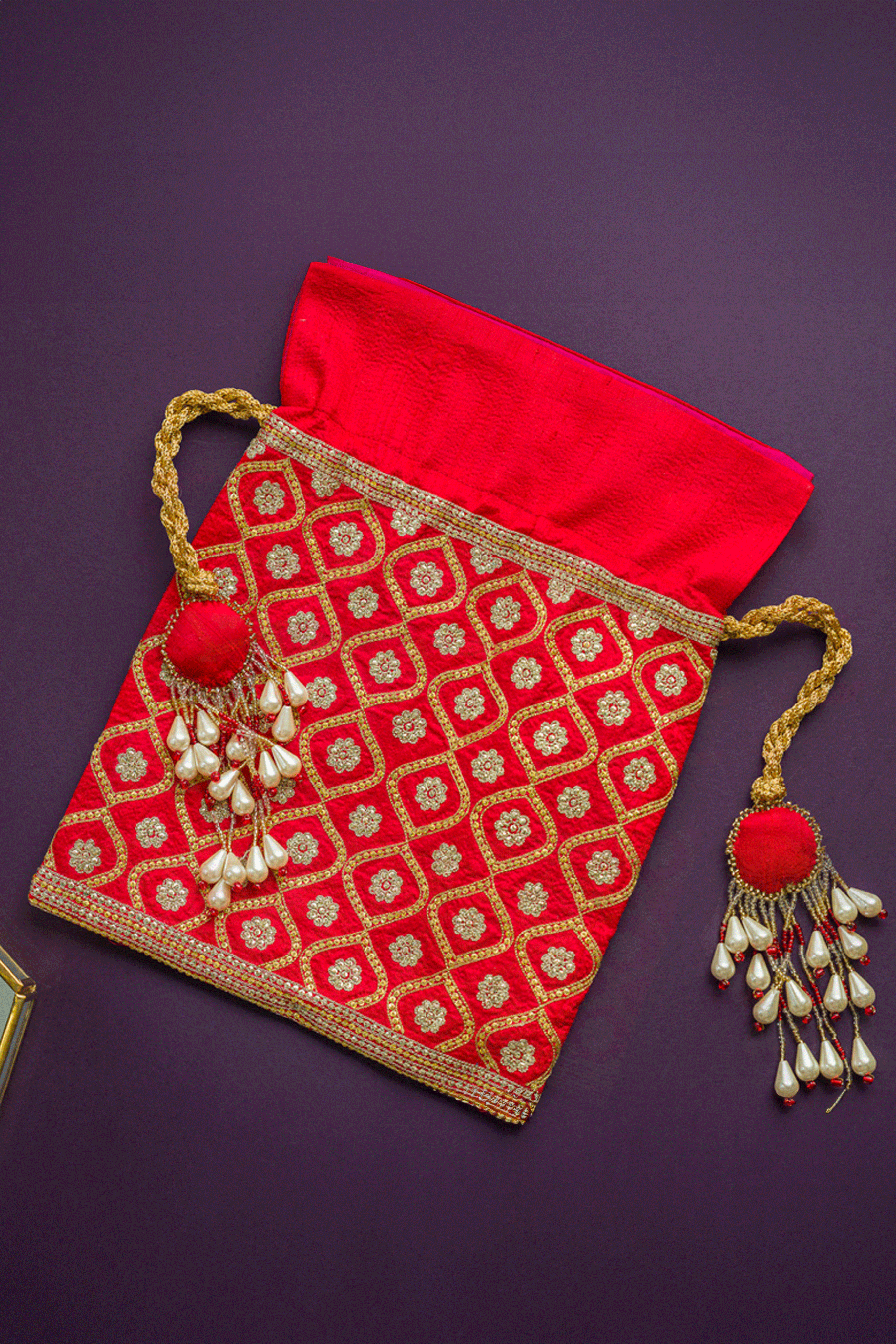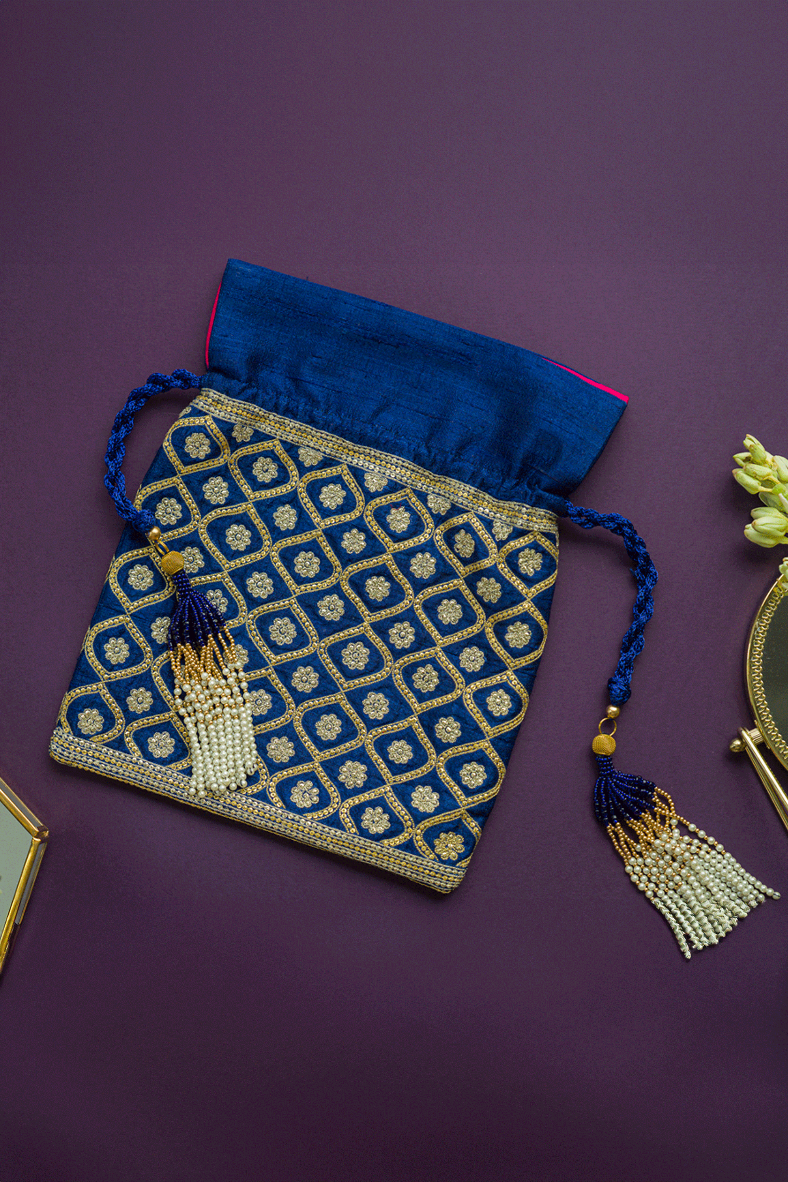 An elegant raw silk batwa, beautifully embroidered with Aari and Tikki techniques. The fabric is adorned with intricate floral and geometric patterns, enhanced by delicate tassel accents.
