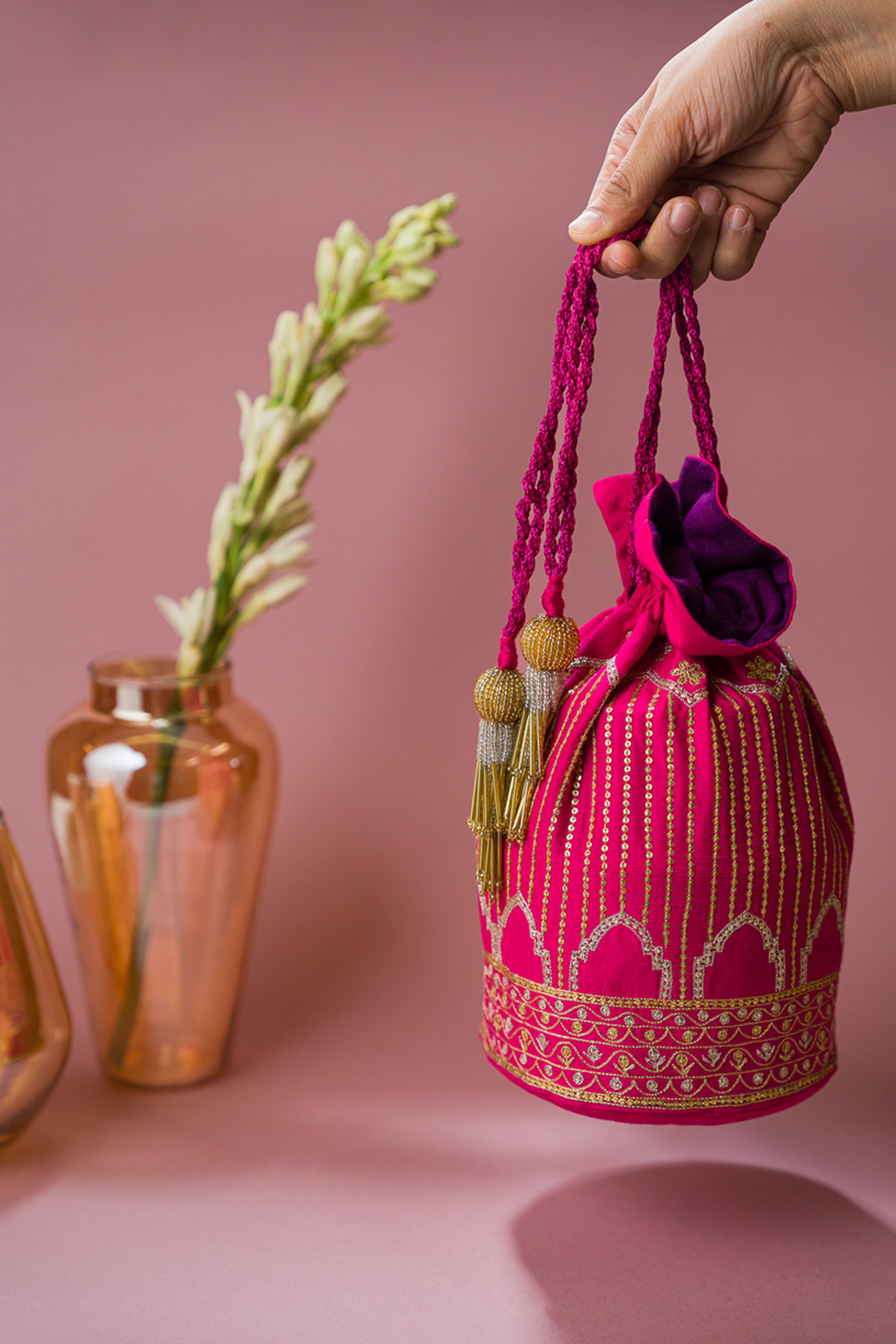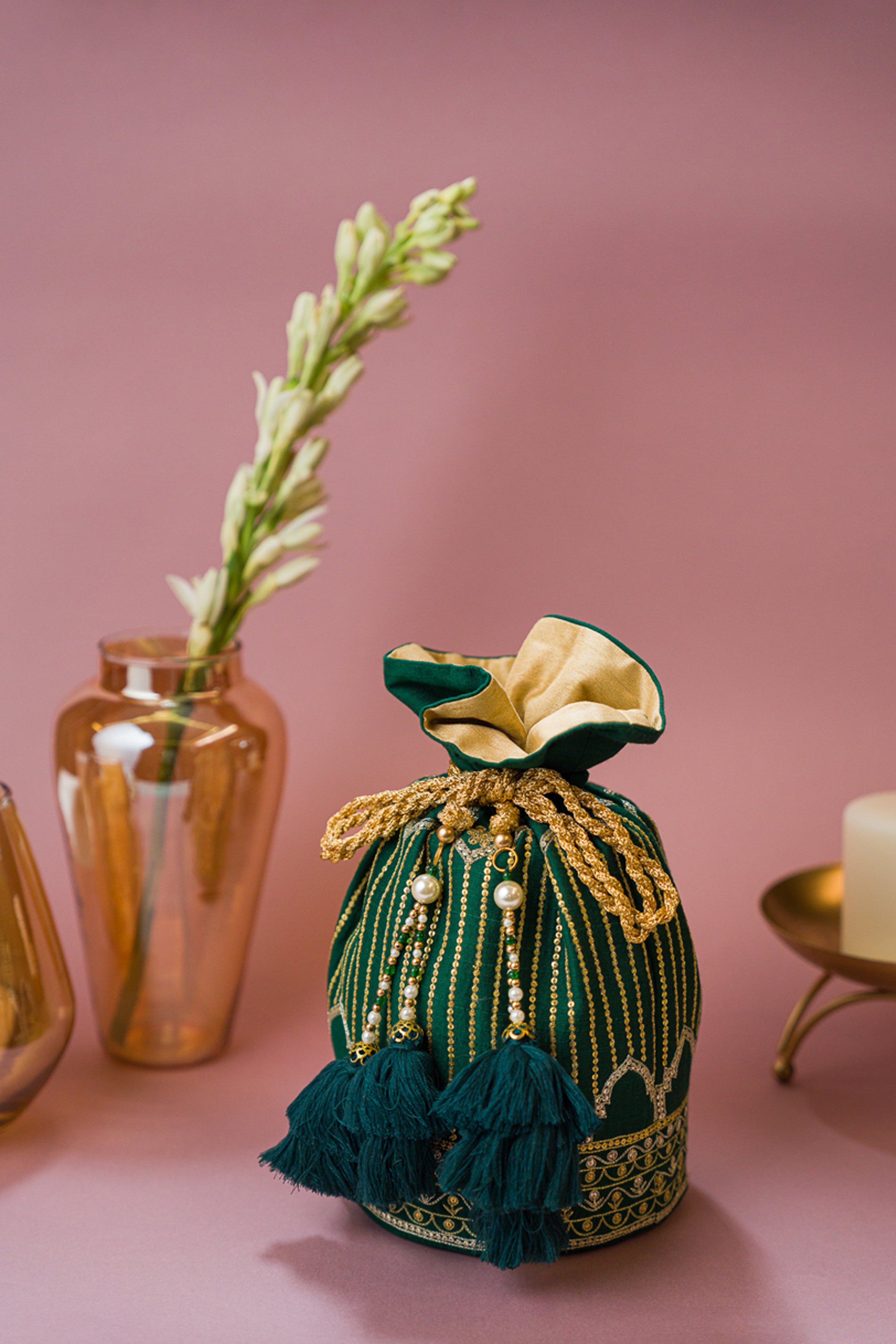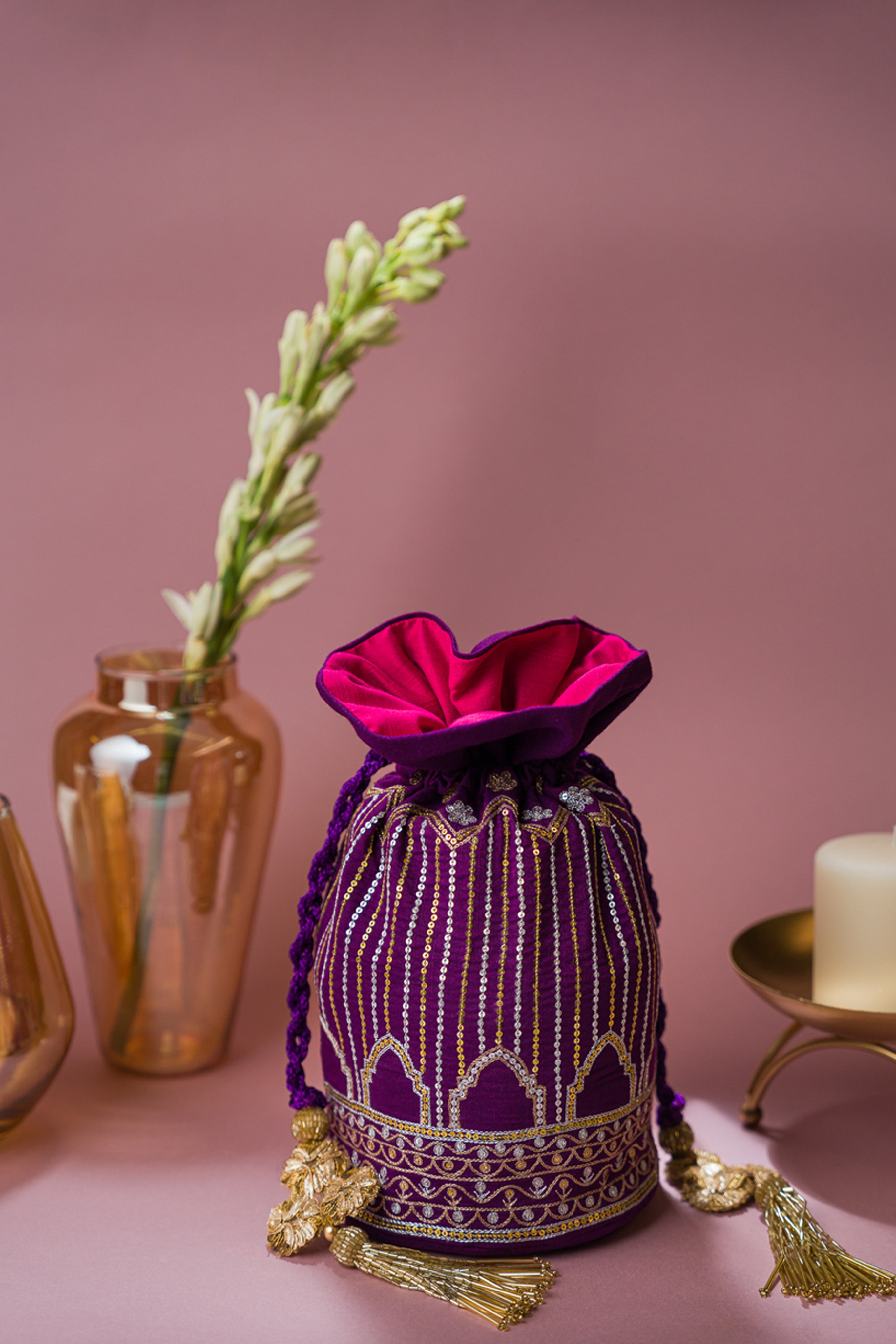 An elegant raw silk batwa, beautifully embroidered with Aari and Tikki techniques. The fabric is adorned with intricate floral and geometric patterns, enhanced by delicate tassel accents.