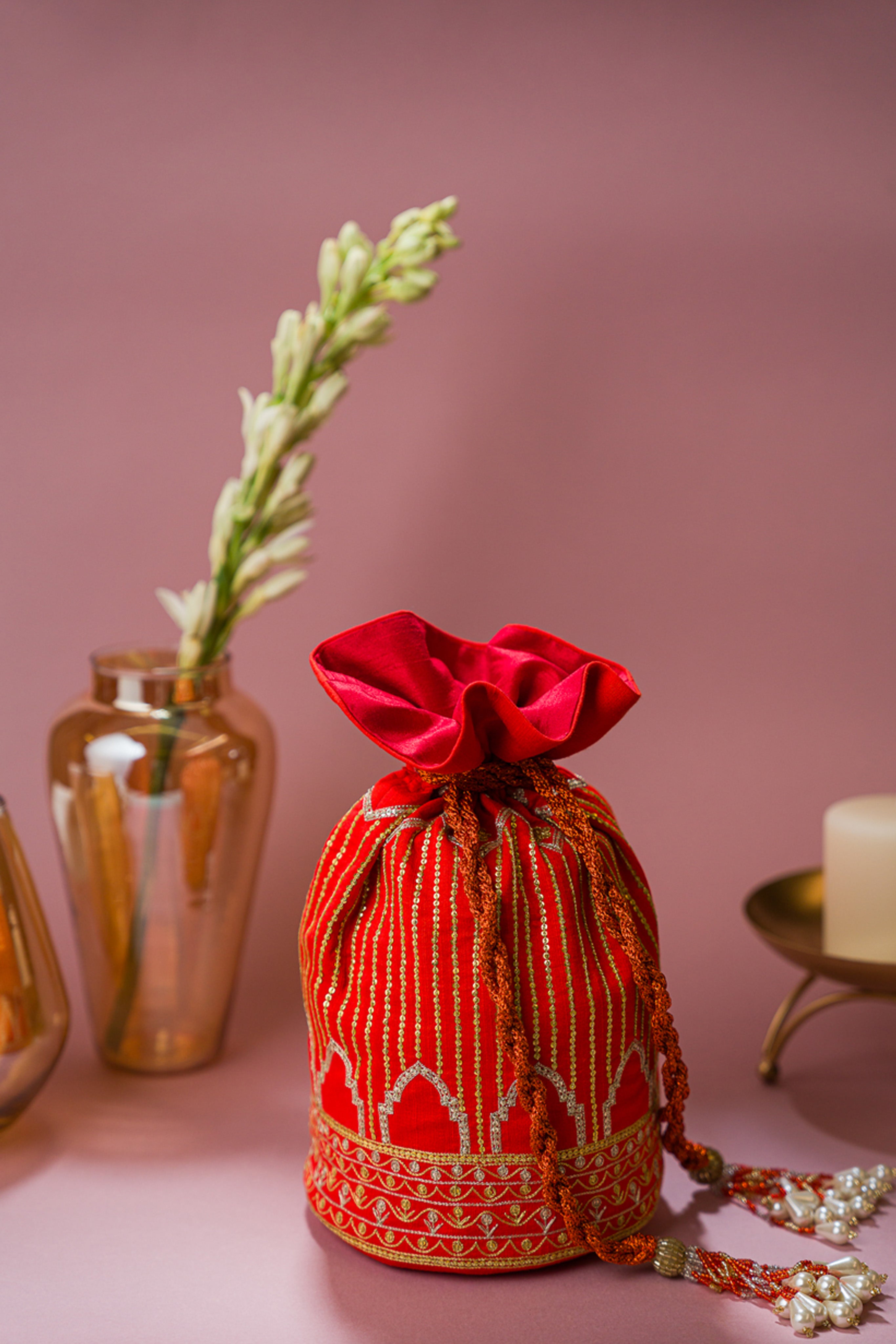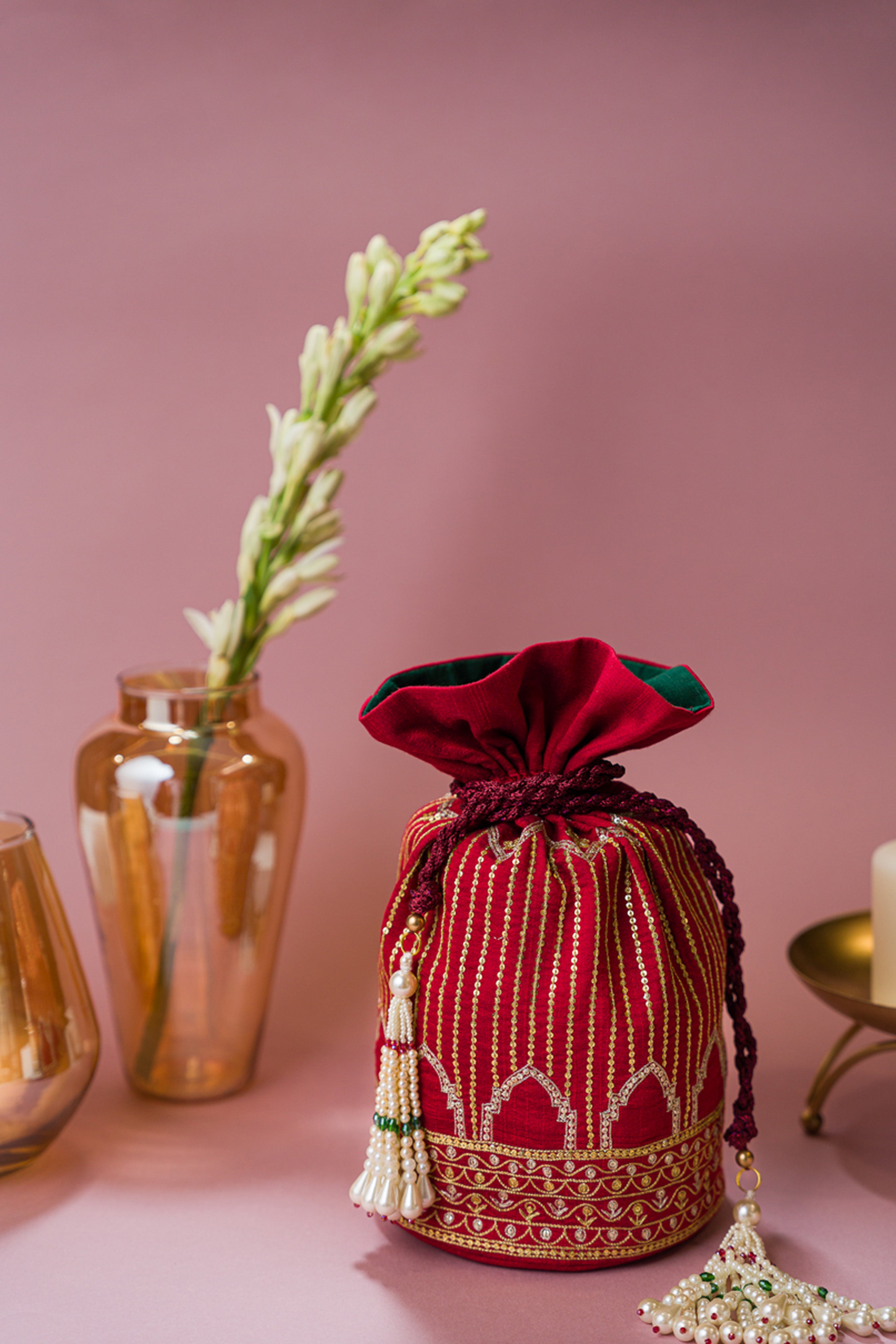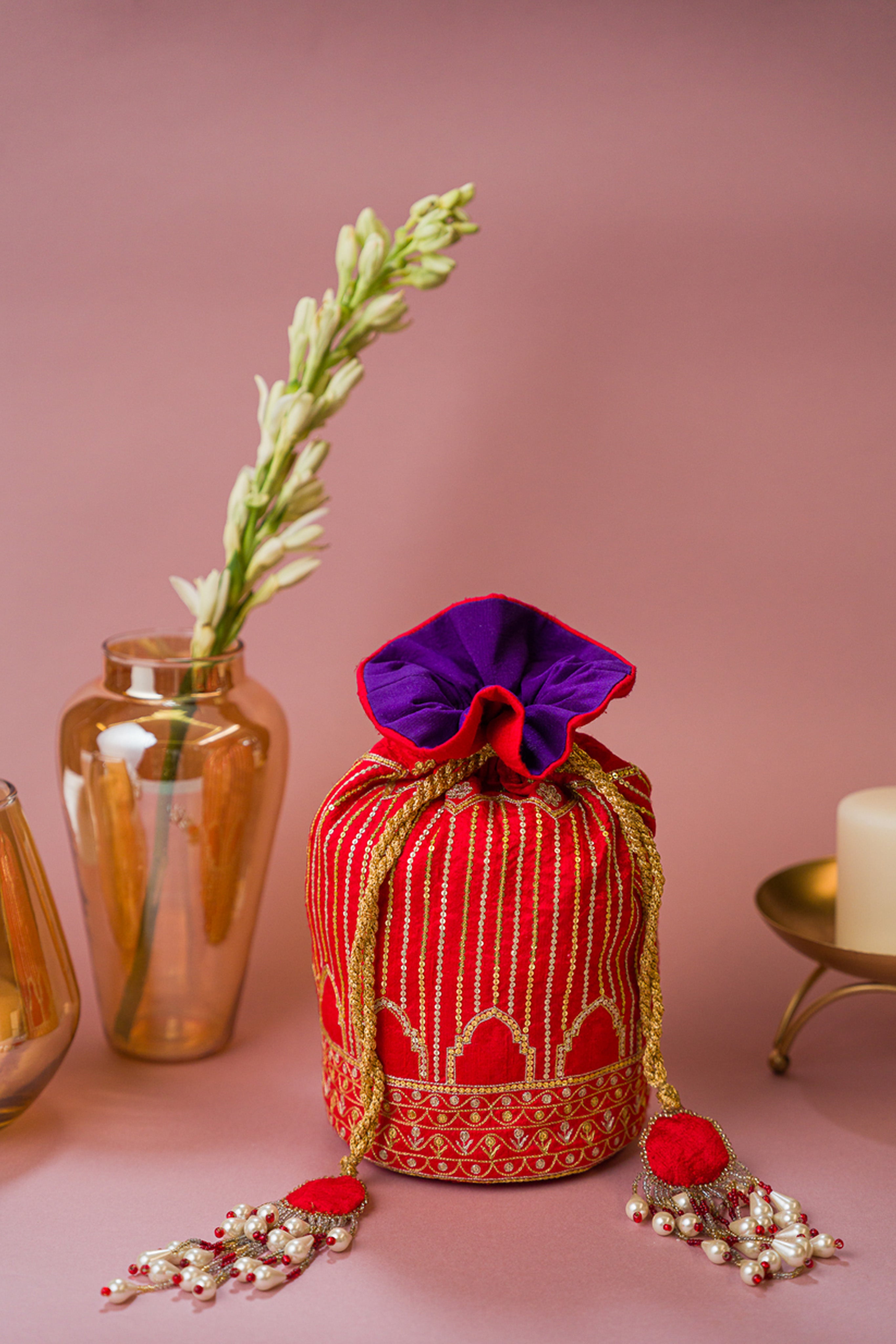 An elegant raw silk batwa, beautifully embroidered with Aari and Tikki techniques. The fabric is adorned with intricate floral and geometric patterns, enhanced by delicate tassel accents.