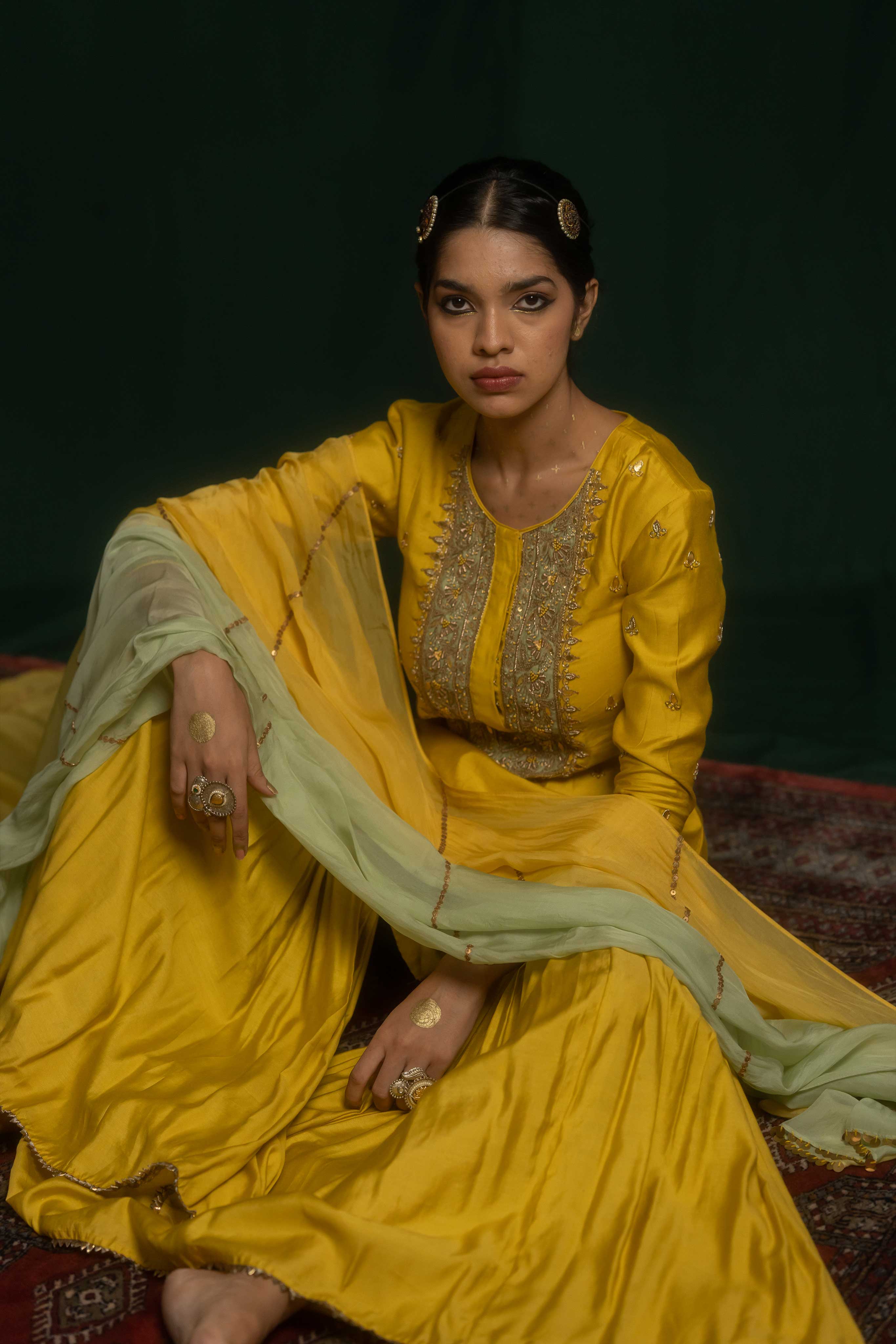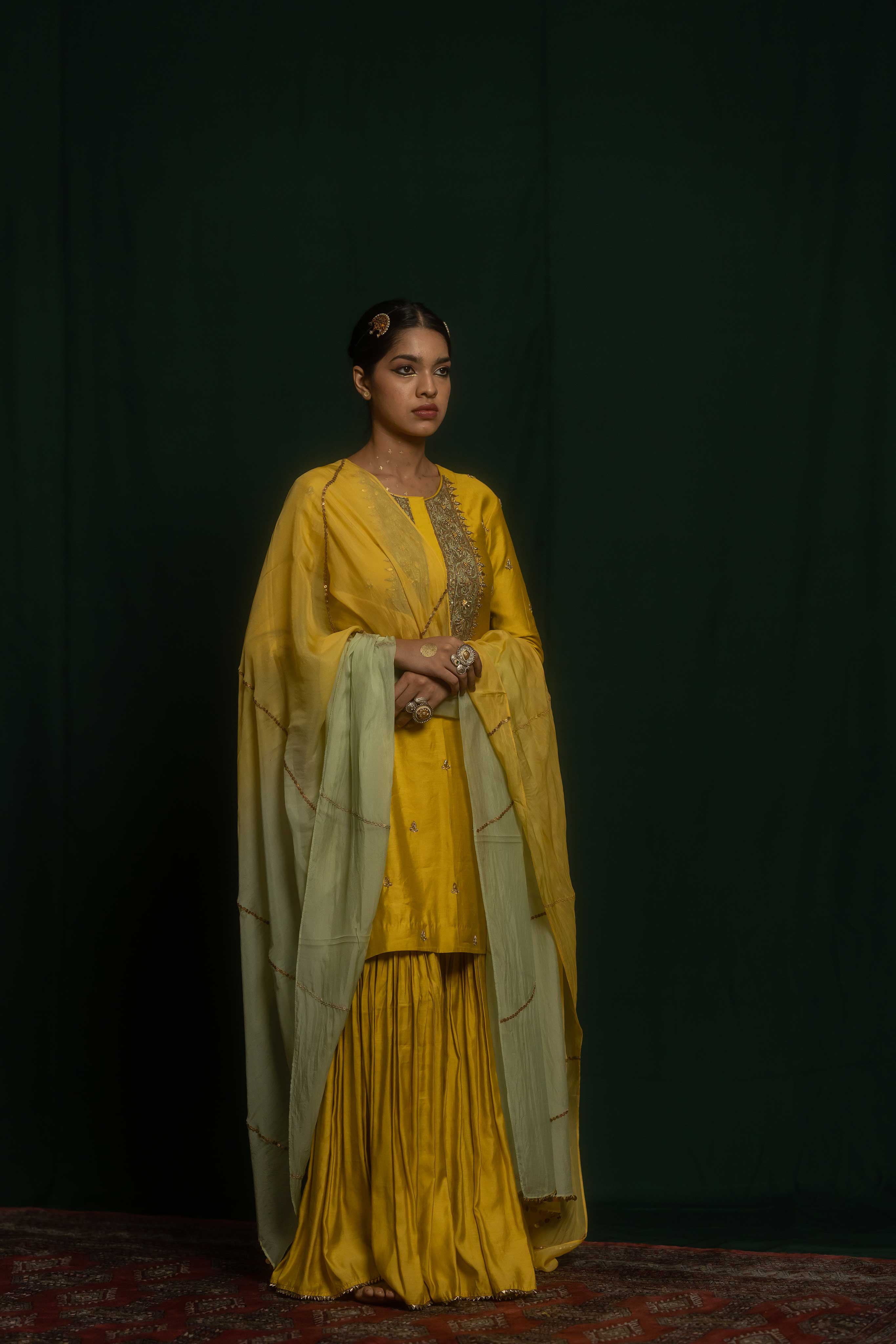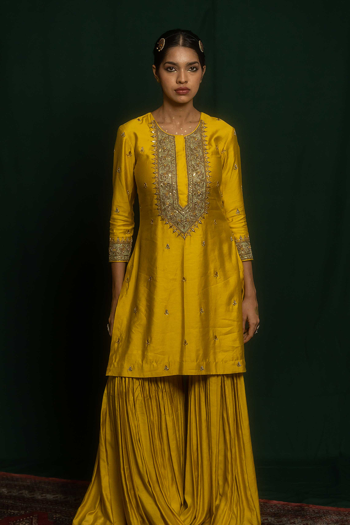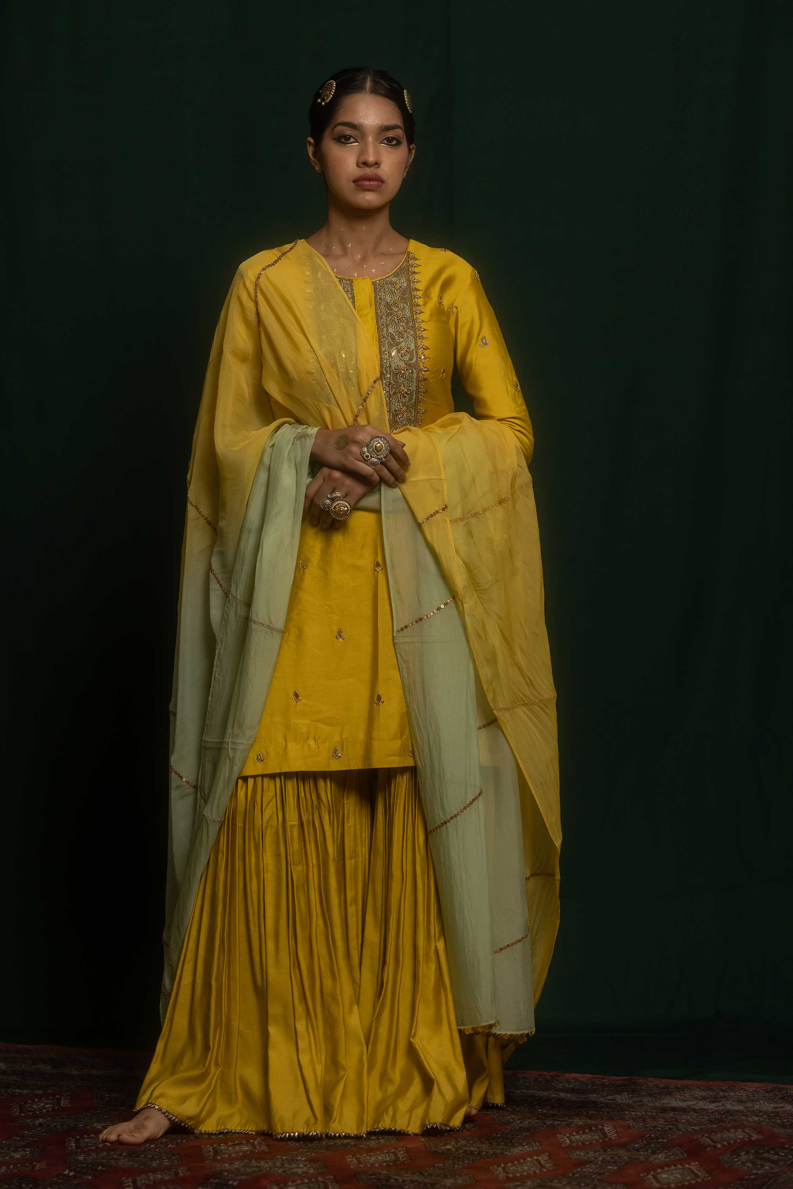 Meher set consists of a short kurta and sharara crafted in yellow cotton silk. It features a combination of marodi, zardozi and kasab gota embroidery with a heavily embroidered yolk and sleeve with intricate floral motifs.