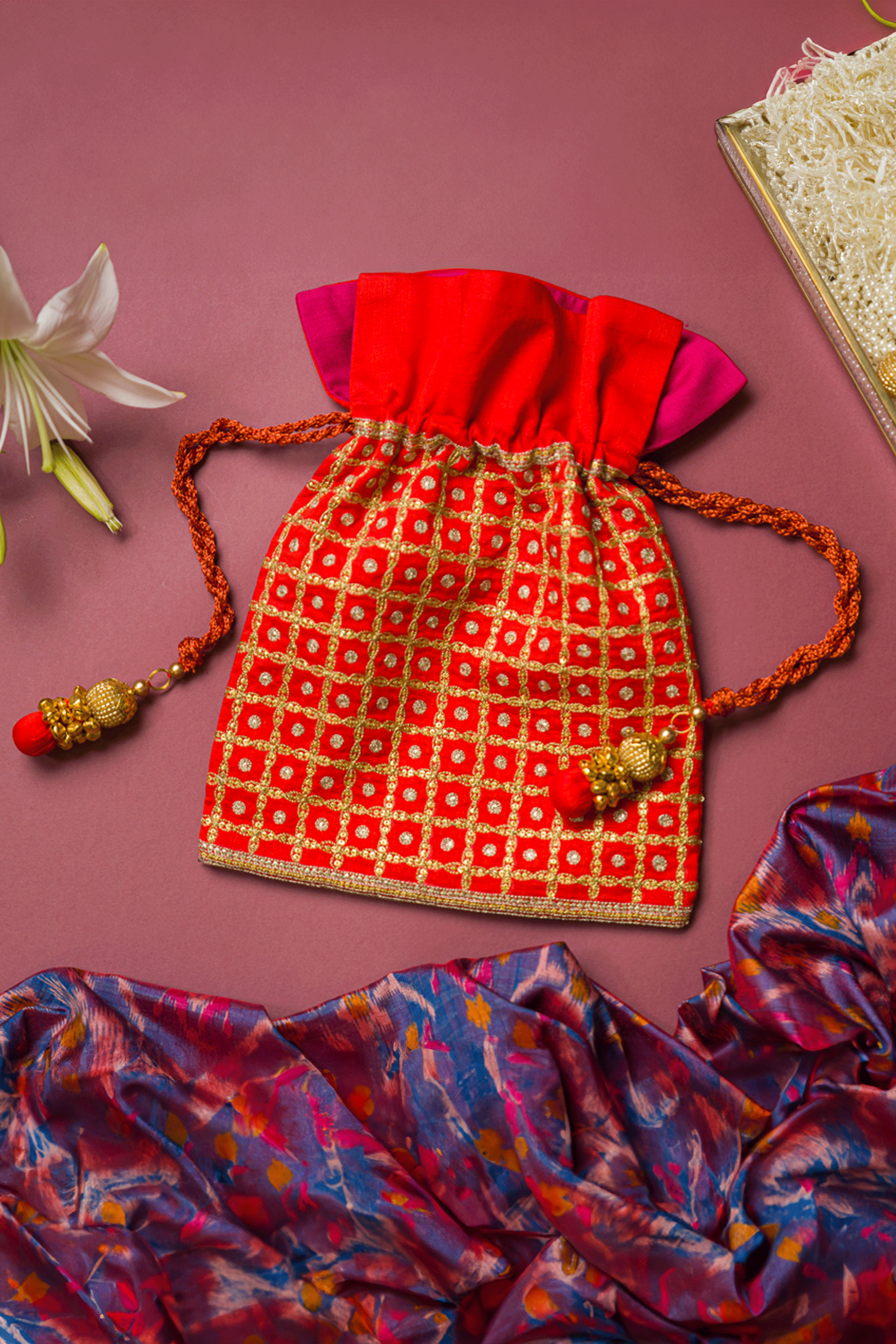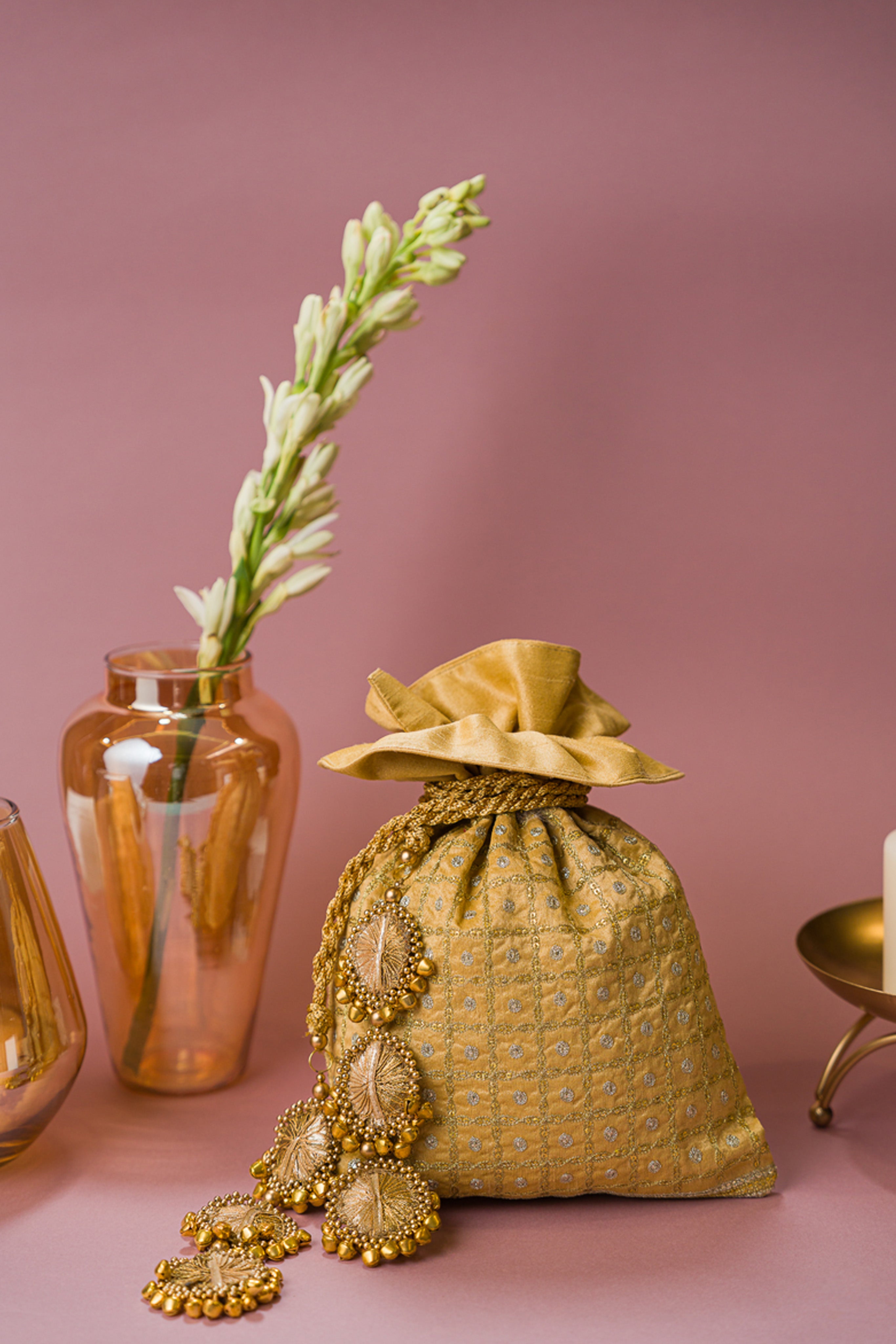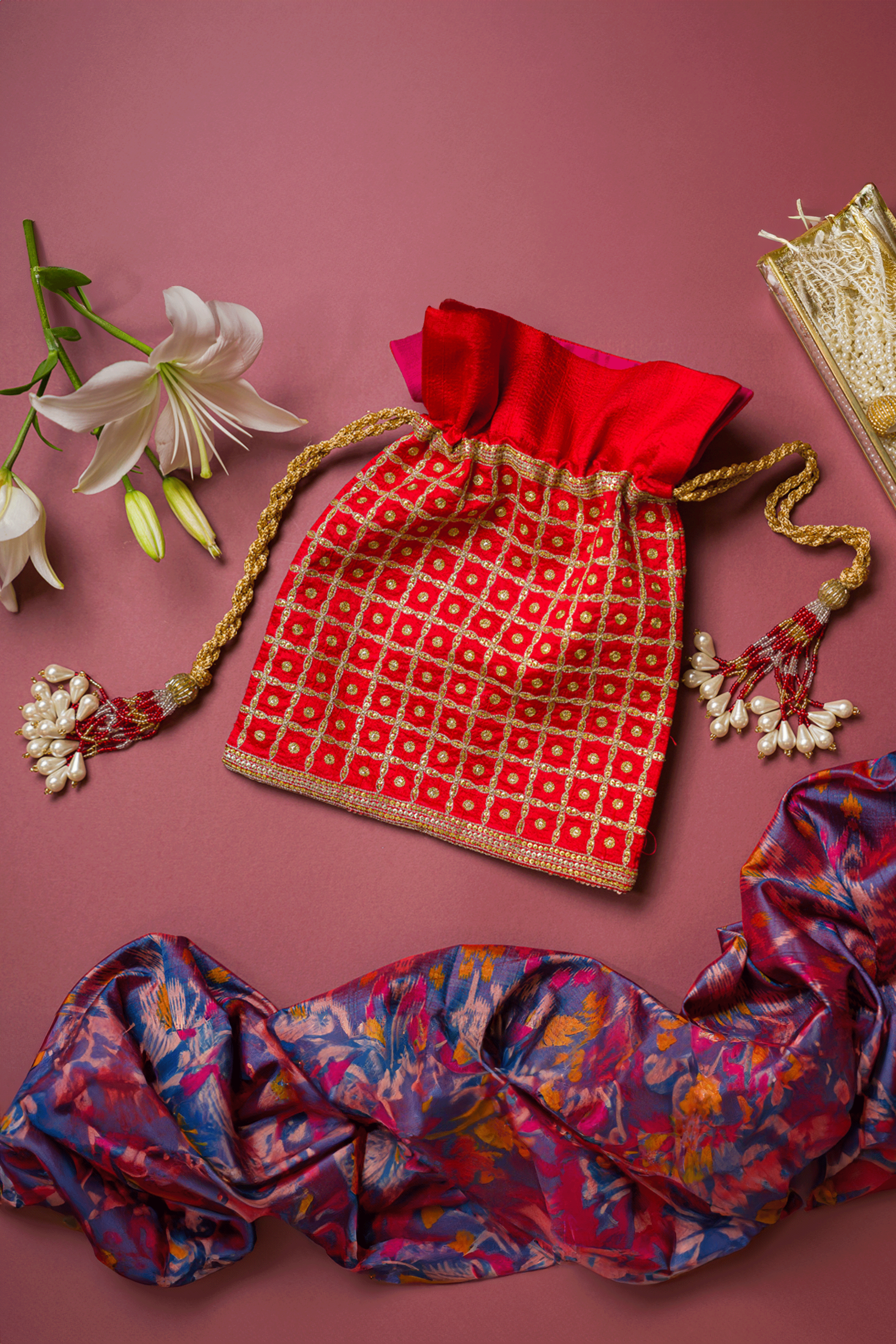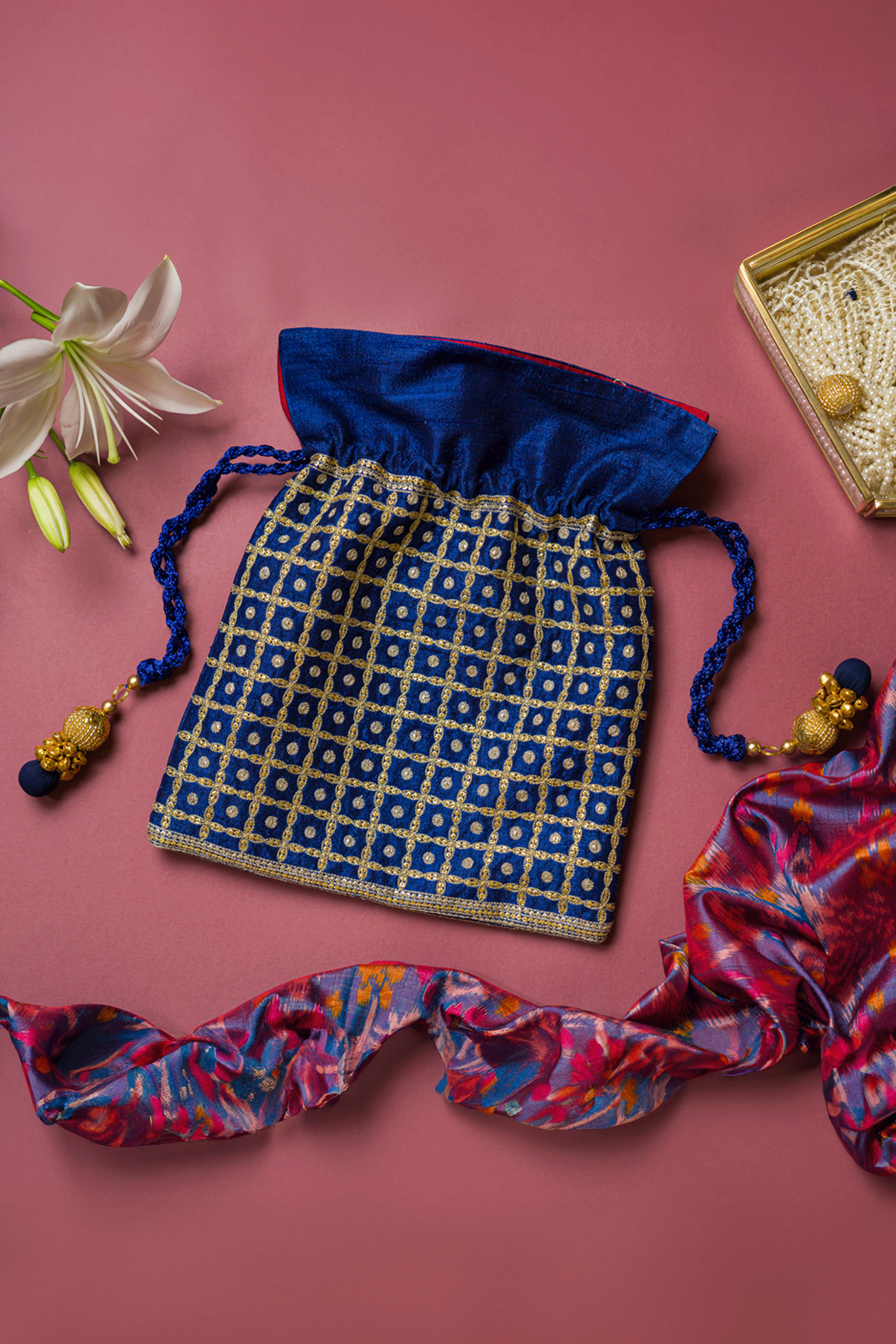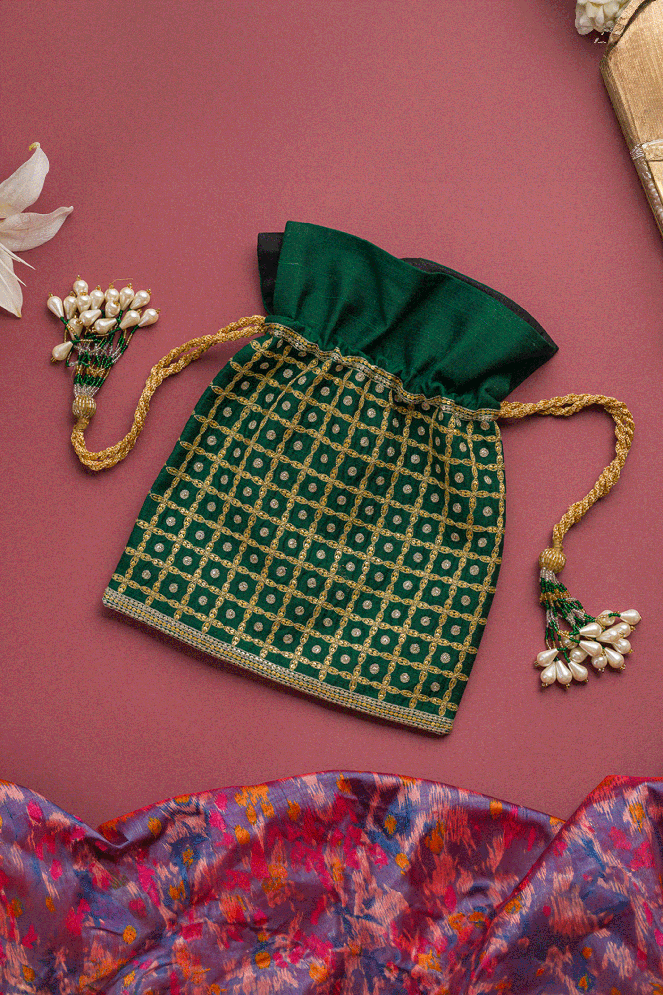 An elegant raw silk batwa, beautifully embroidered with Aari and Tikki techniques. The fabric is adorned with intricate floral and geometric patterns, enhanced by delicate tassel accents.