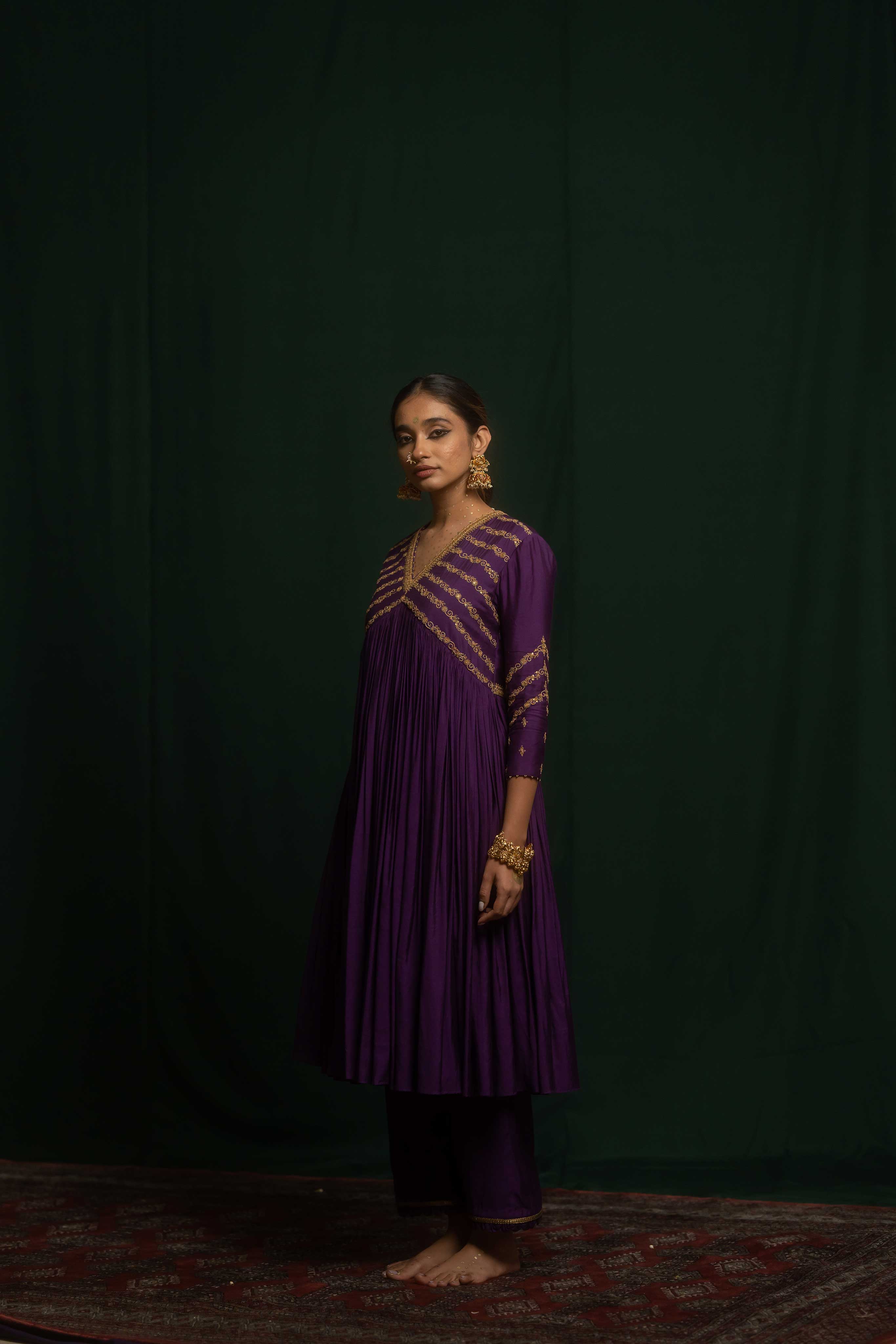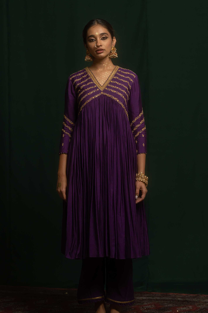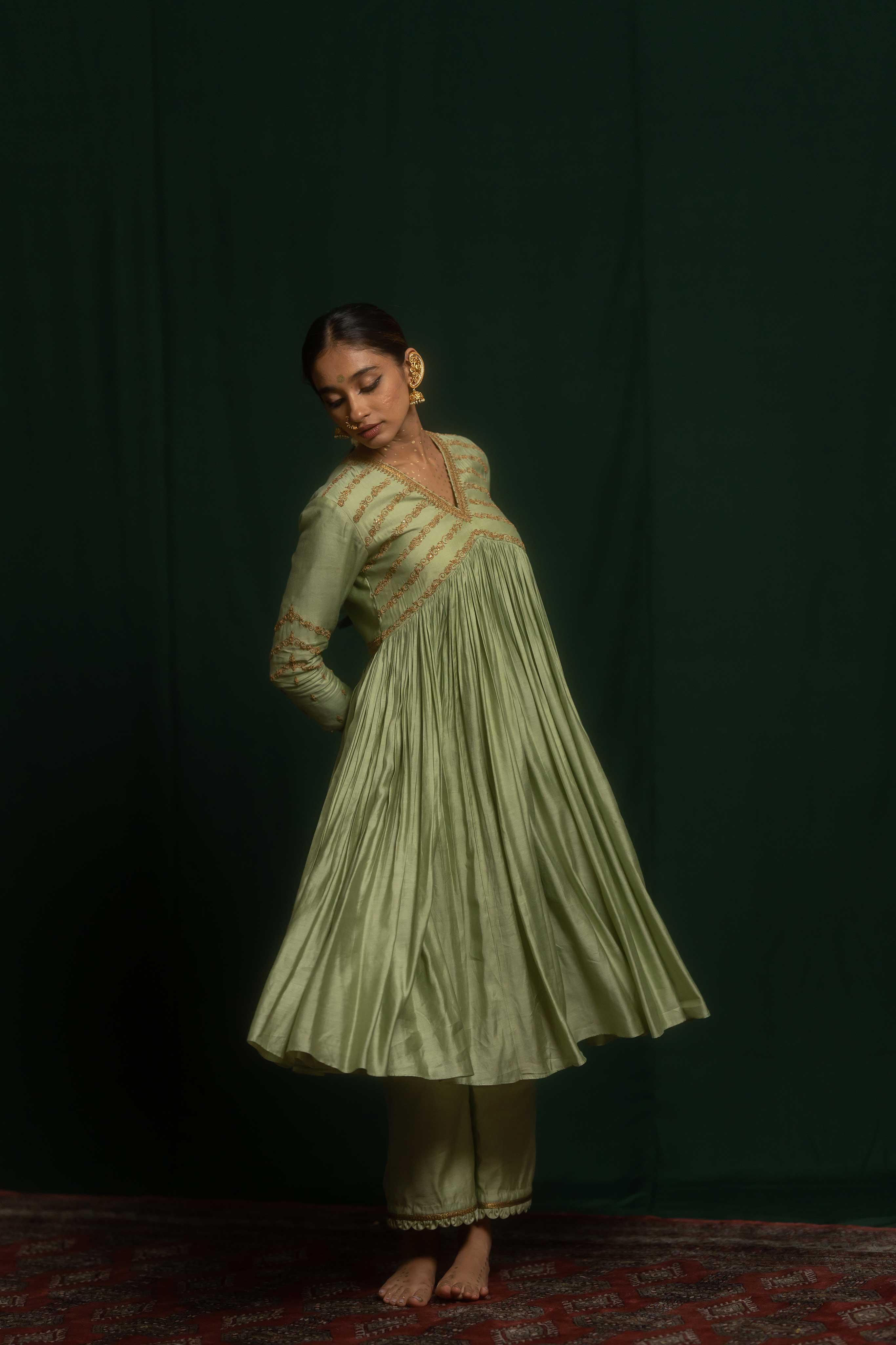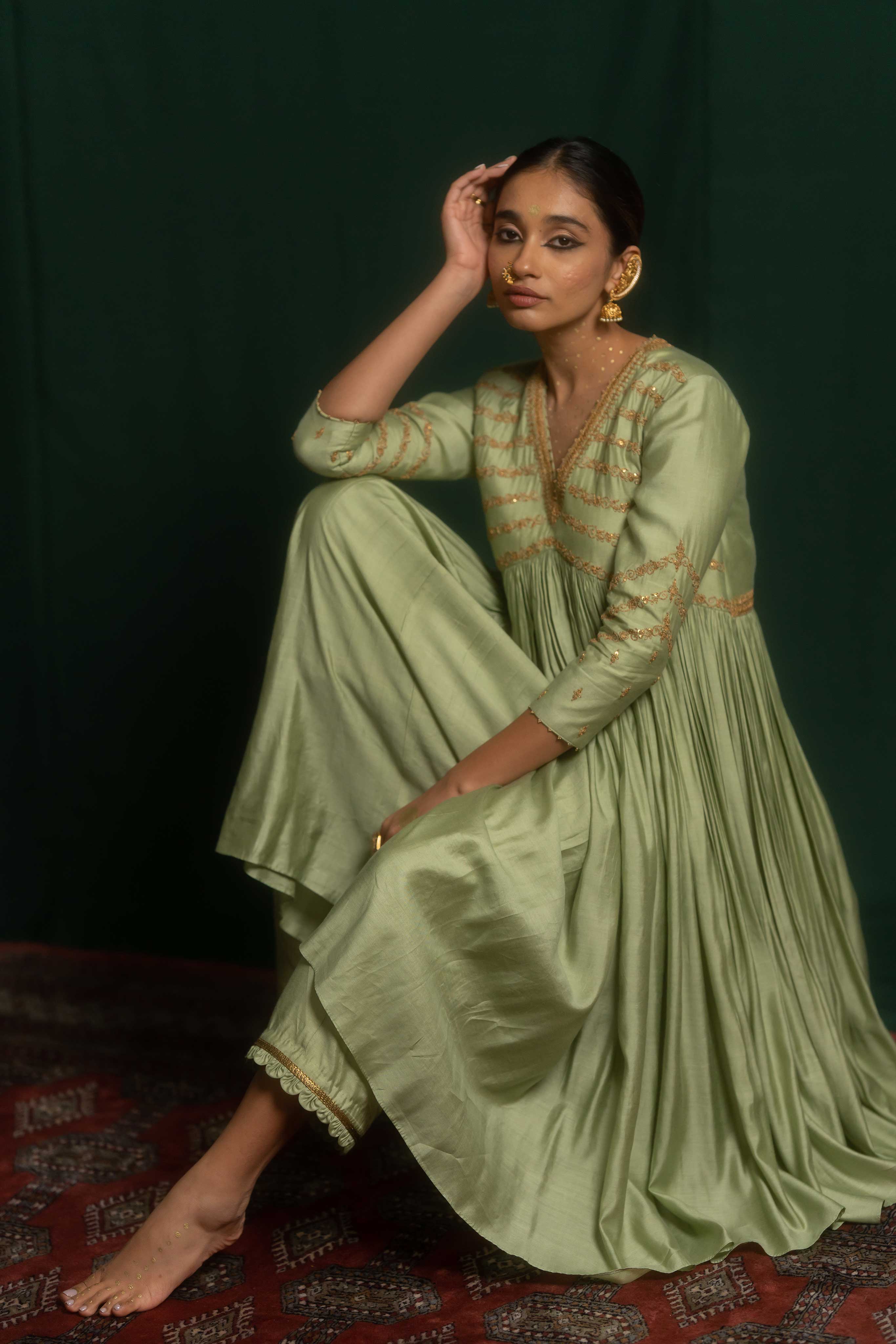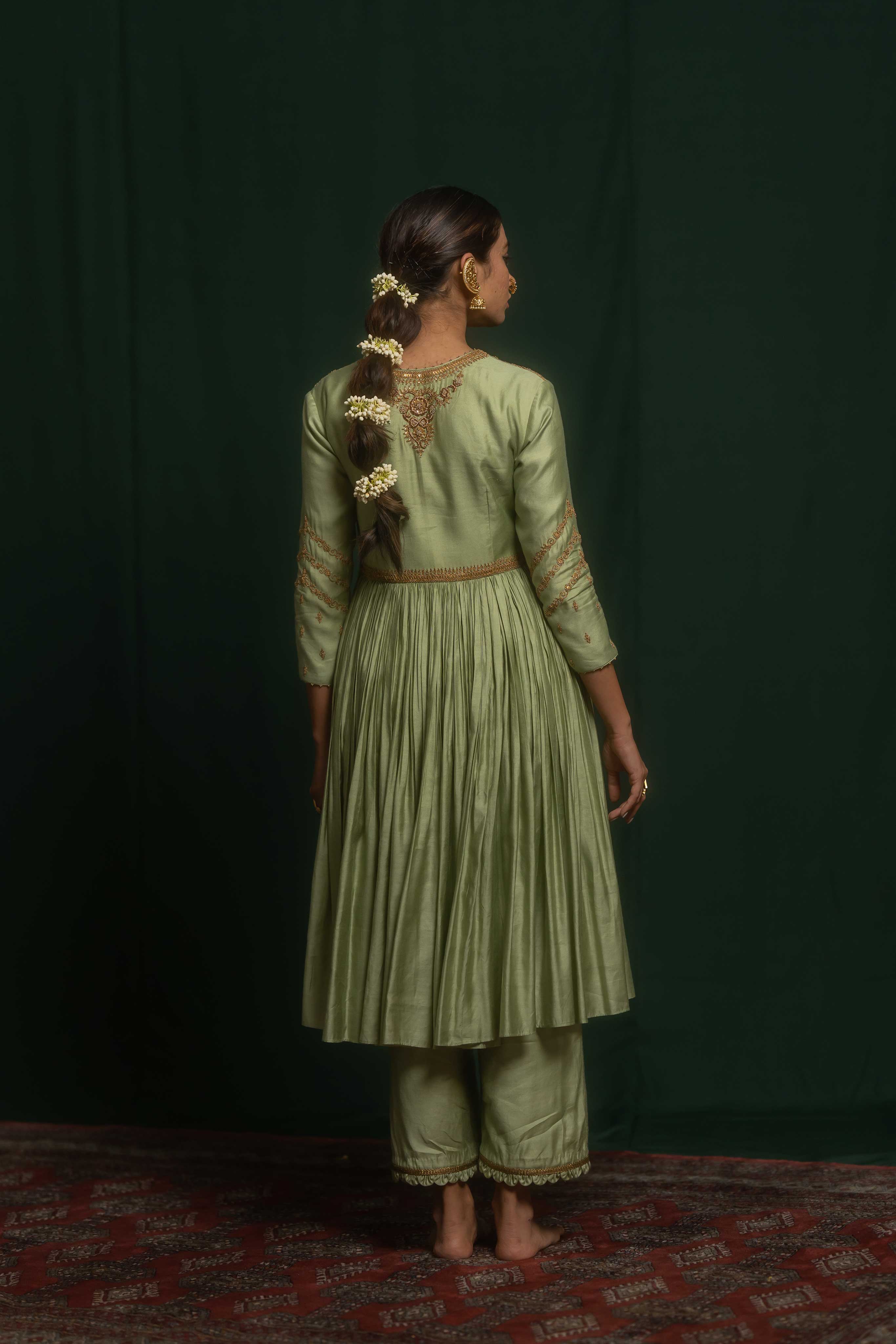 Nadia set consists of a kurta and pant crafted in mint green cotton silk. It features a combination of marodi and zardosi embroidery. It is heavily embroidered in the front, back and on the sleeves