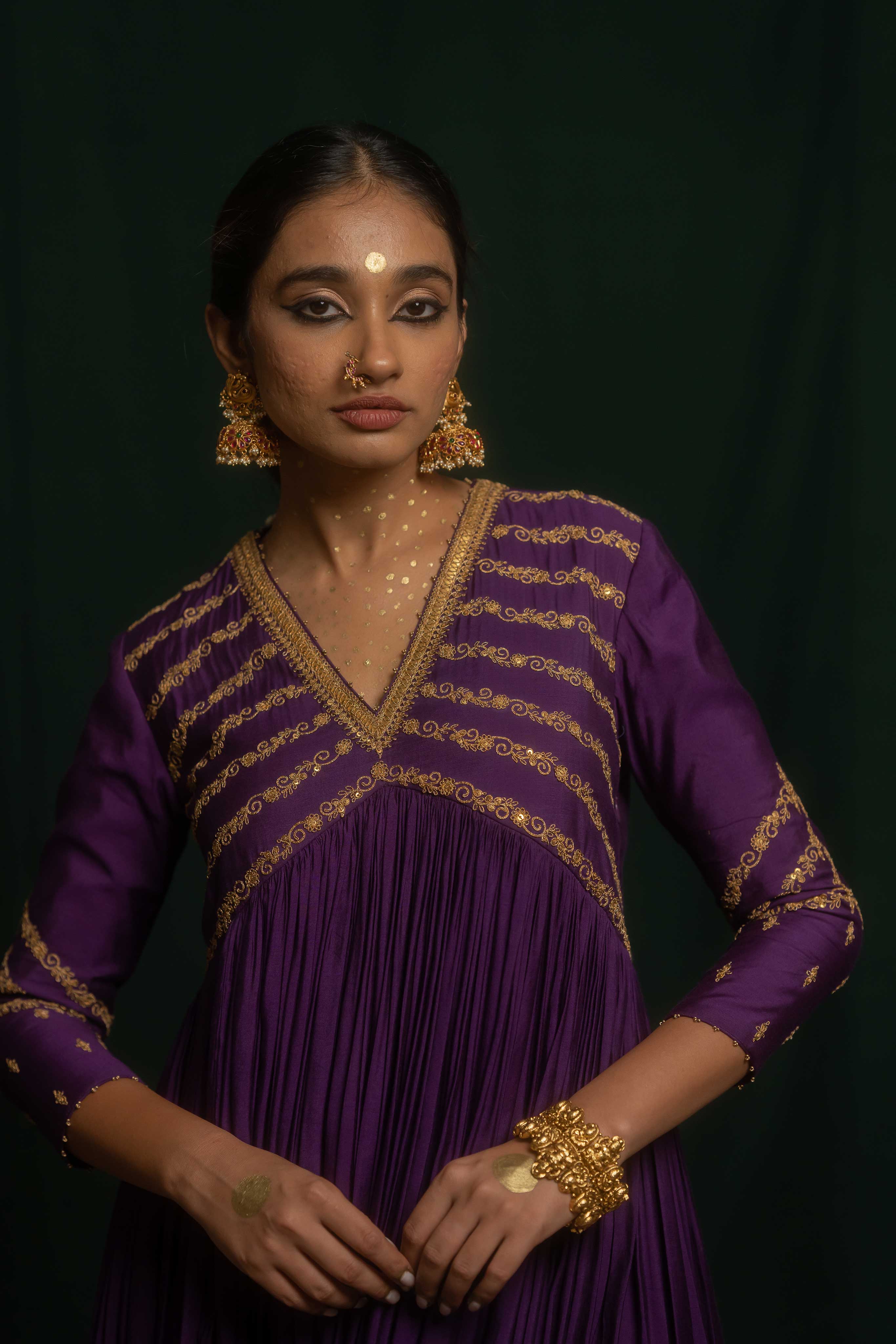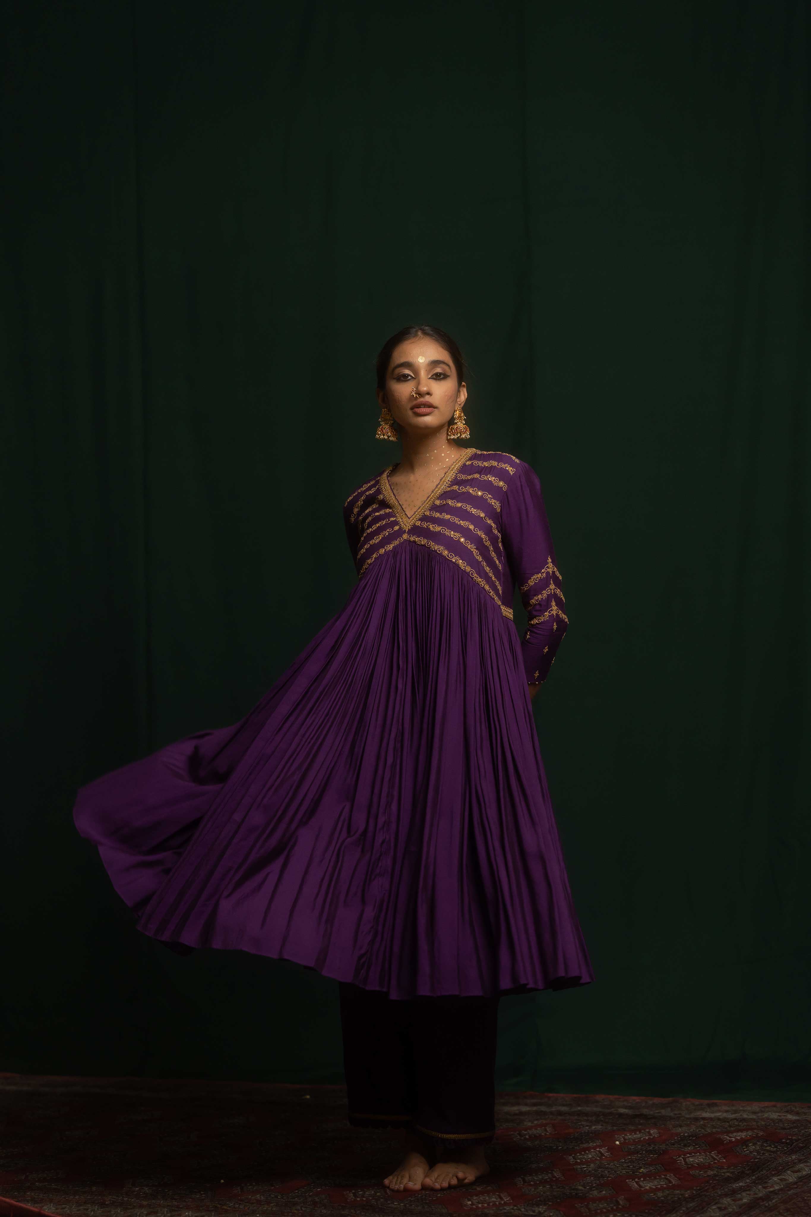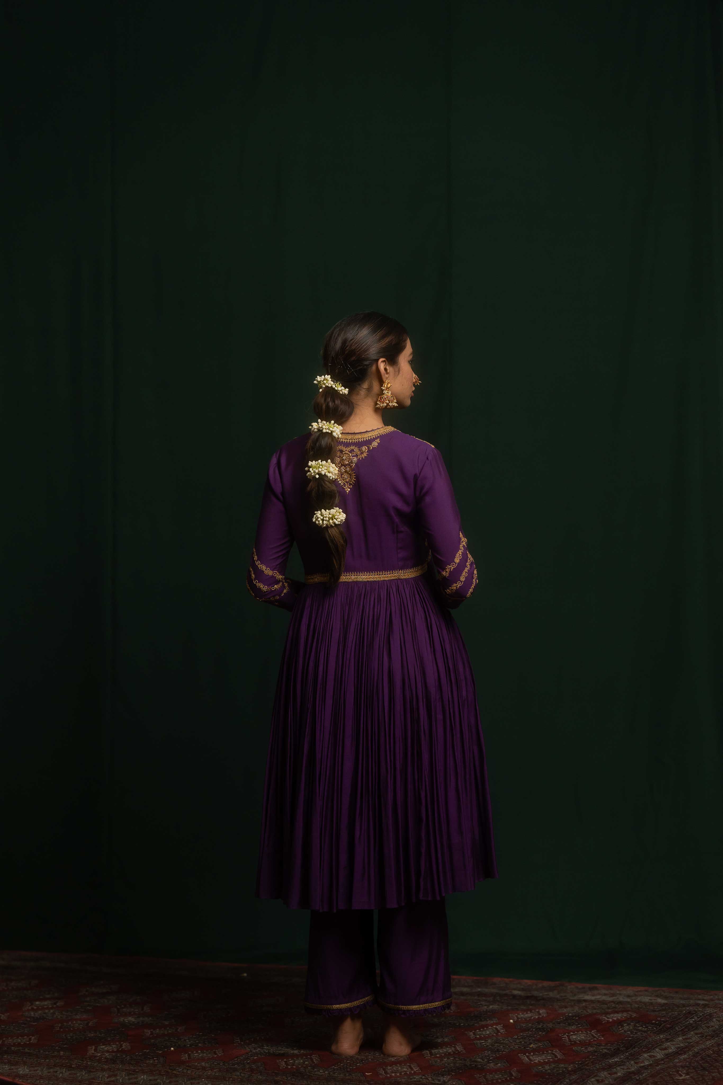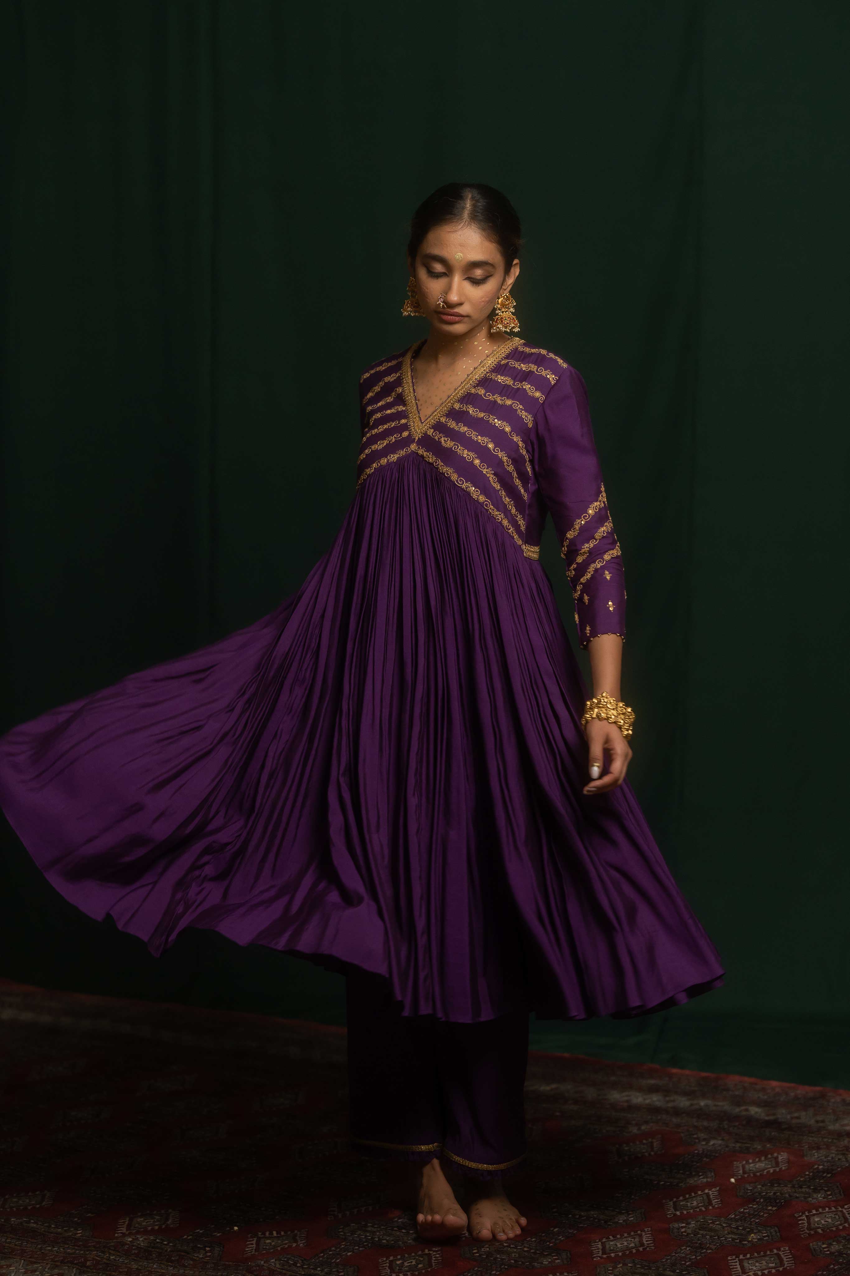 Nadia set consists of a kurta and pant crafted in mint green cotton silk. It features a combination of marodi and zardosi embroidery. It is heavily embroidered in the front, back and on the sleeves