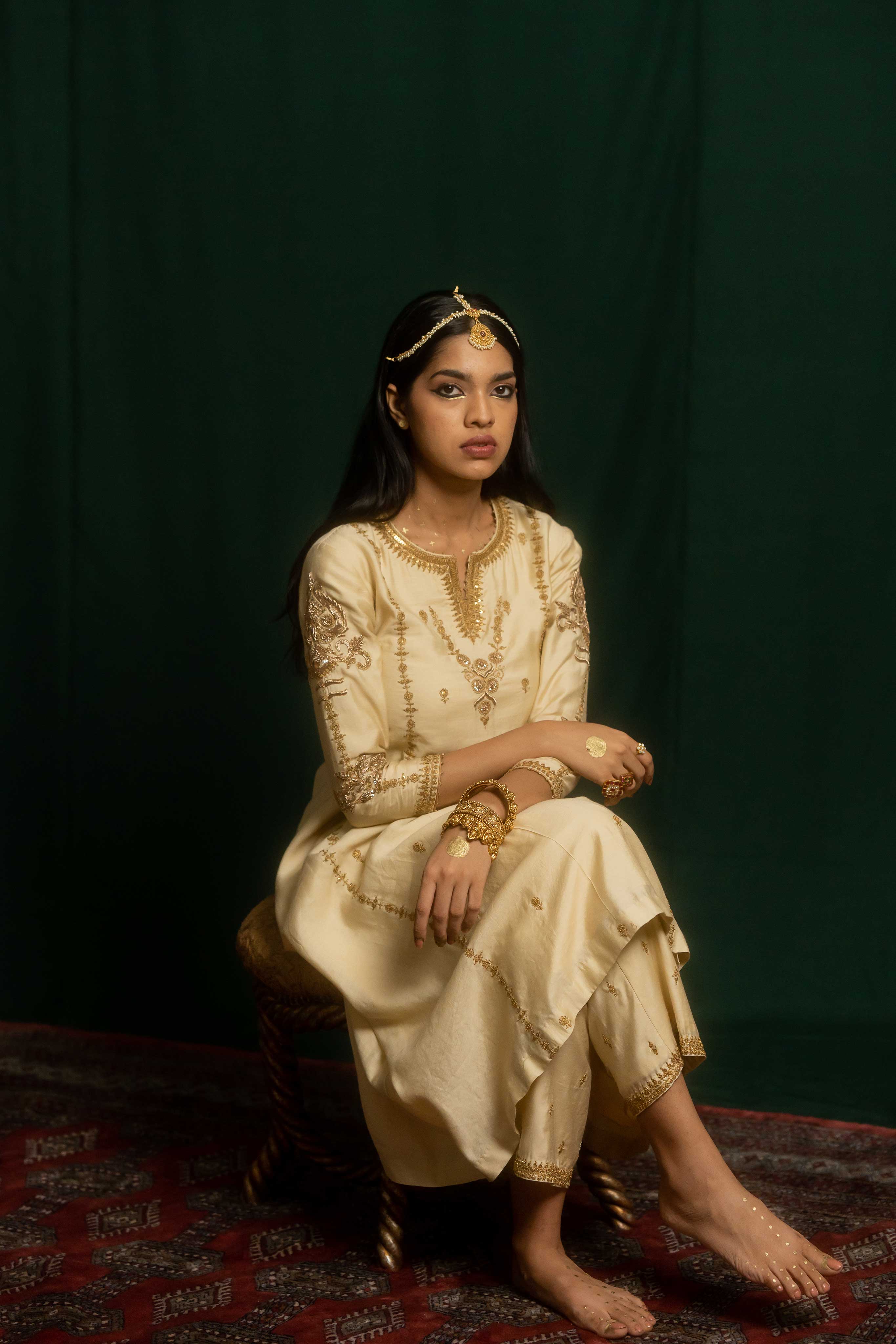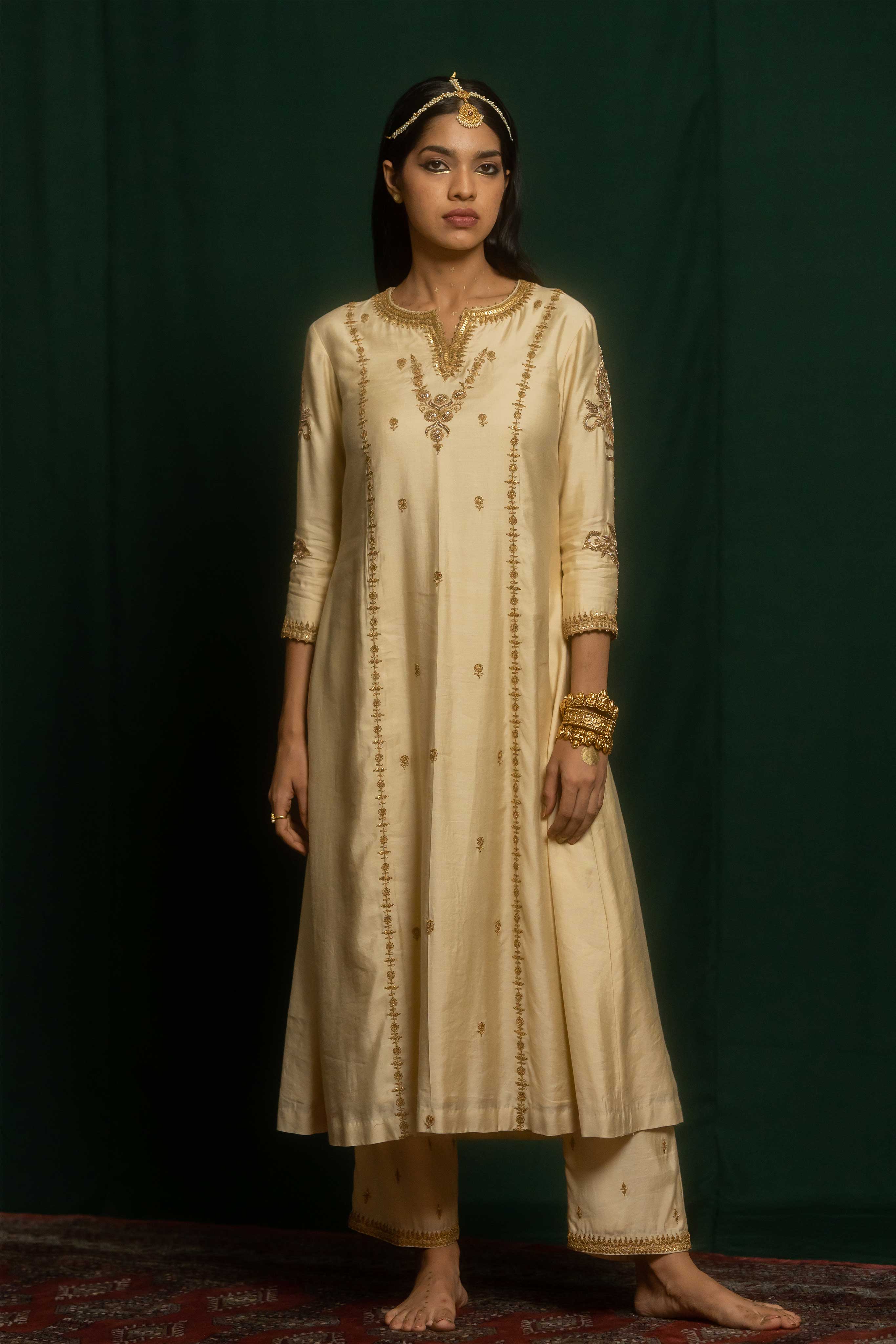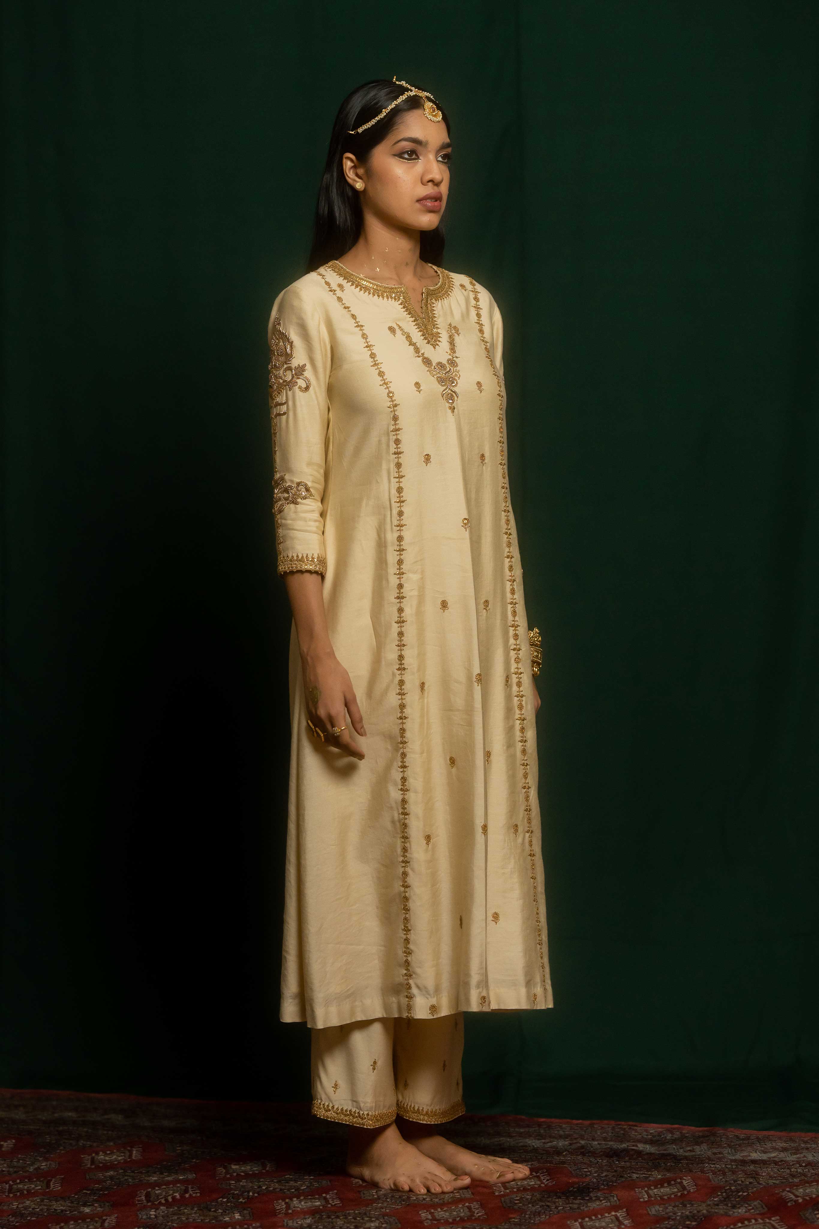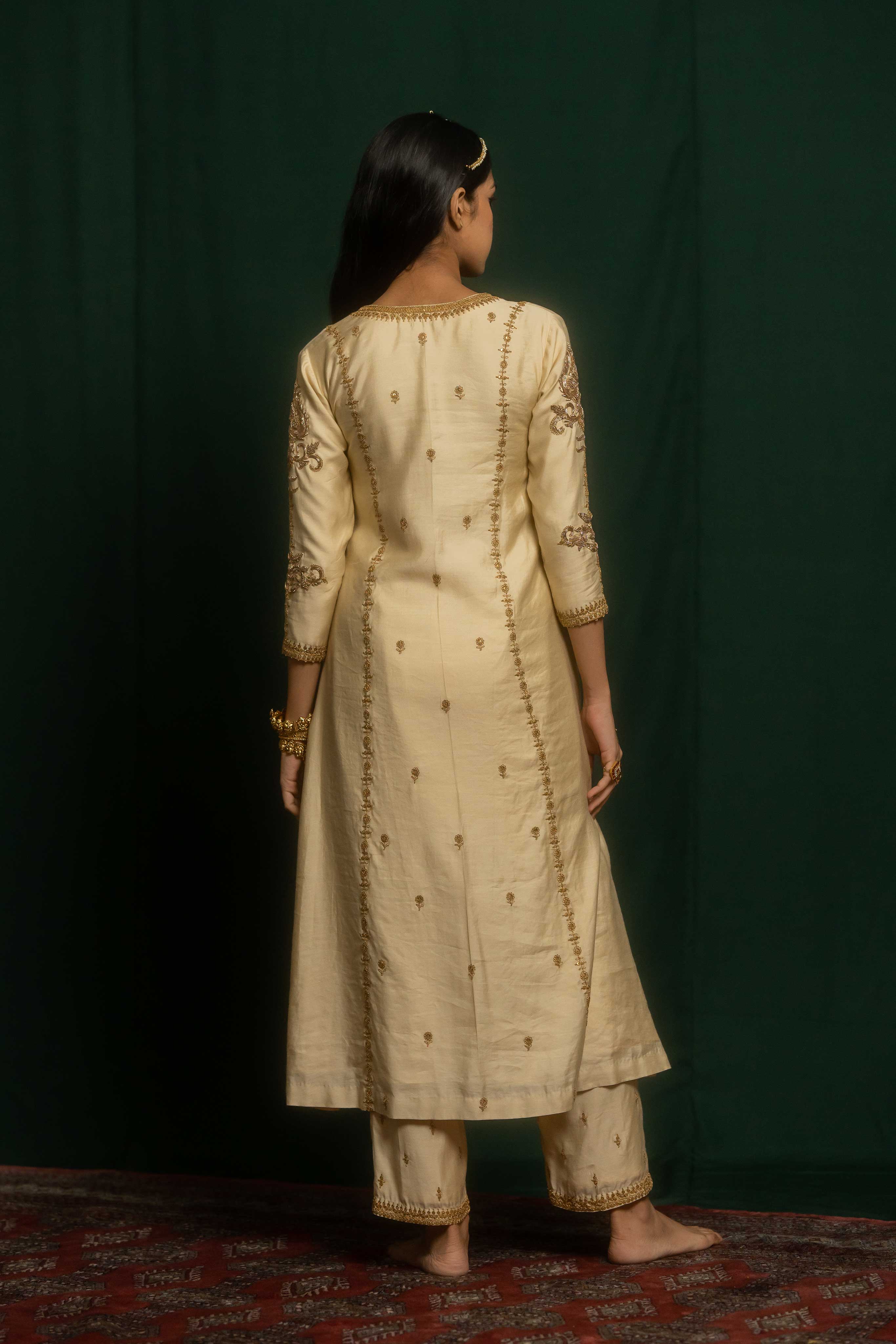 Nisa set consists of a kurta and pant crafted in ivory cotton silk. It features a combination of marodi and zardosi embroidery. It is heavily embroidered in the front, back and sleeves.