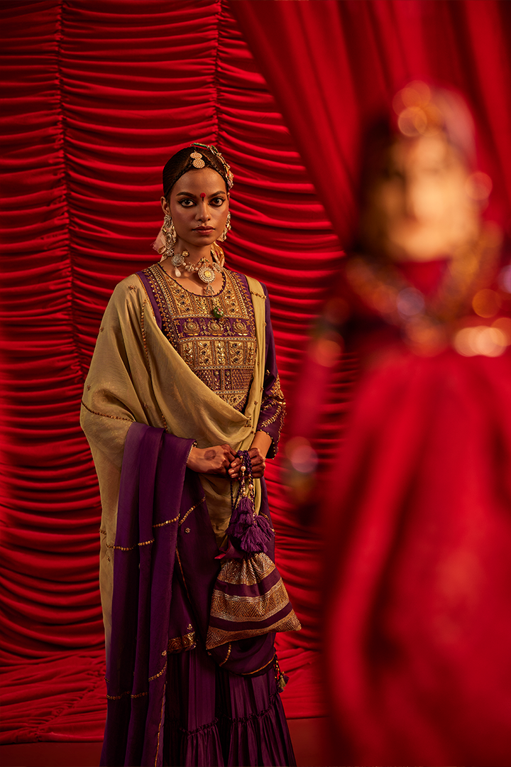 Nitara kurta and sharara set is crafted in rani handwoven silk. It features a combination of marodi, zardozi and kasab gota embroidery with a heavily embroidered yolk and sleeve.