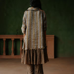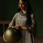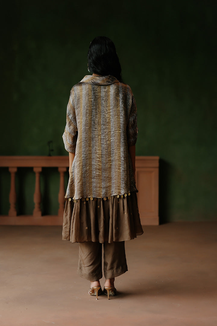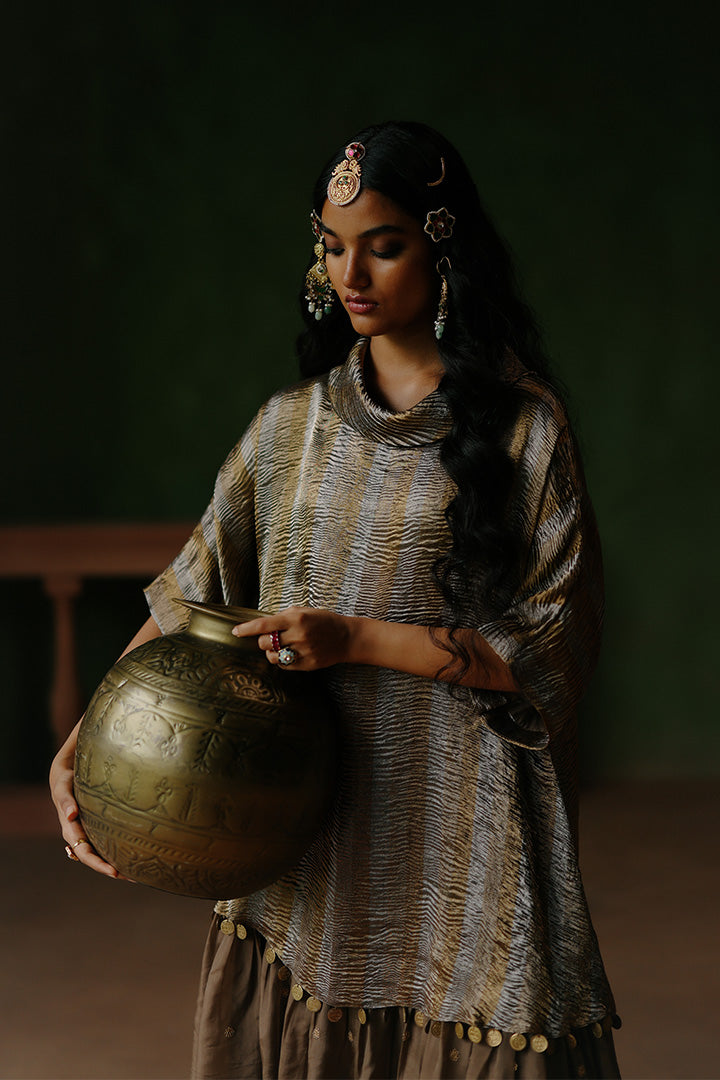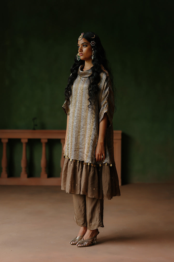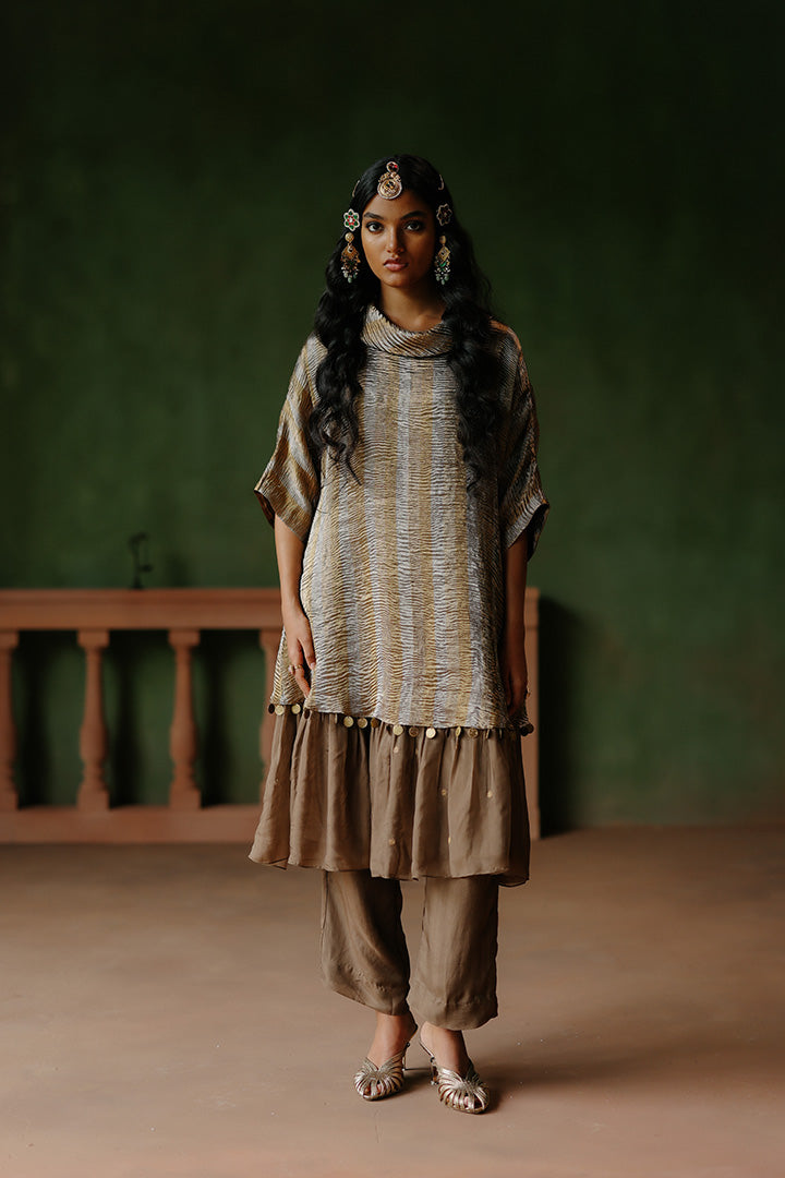 The Raha kurta set features a crushed stripe tissue kurta with a cowl neck, it has an organza frill with embriodery and coin detailing. It is paired with an organza pant,This set includes a kurta and pant.