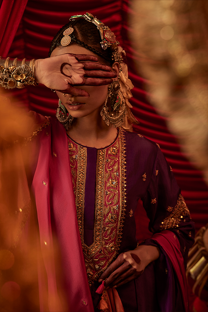 Ryka kurta, pant and dupatta set is crafted in purple handwoven silk. It features a combination of marodi, zarodi and resham embriodery. It has a heavily embroidered yolk and sleeve with floral motifs.