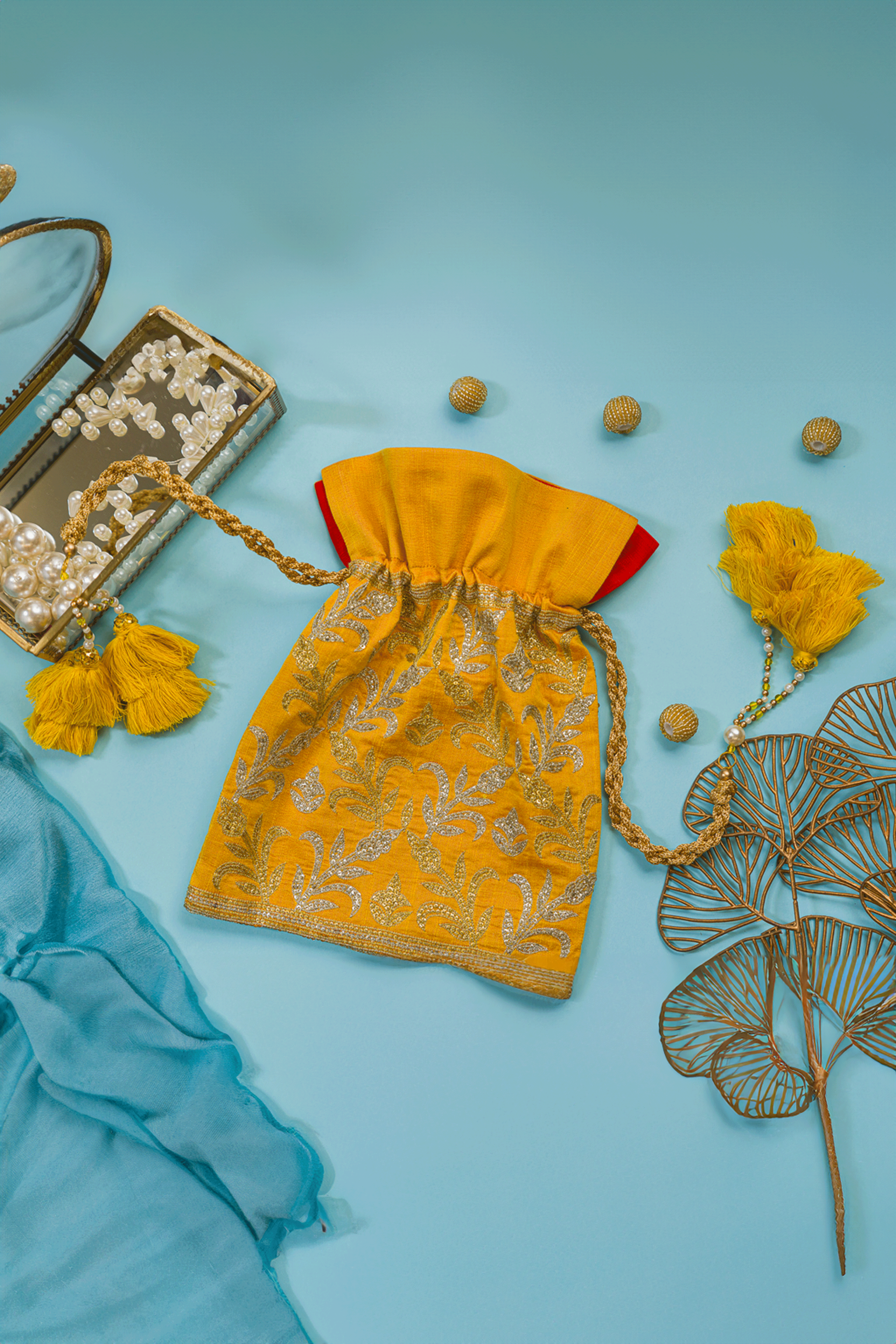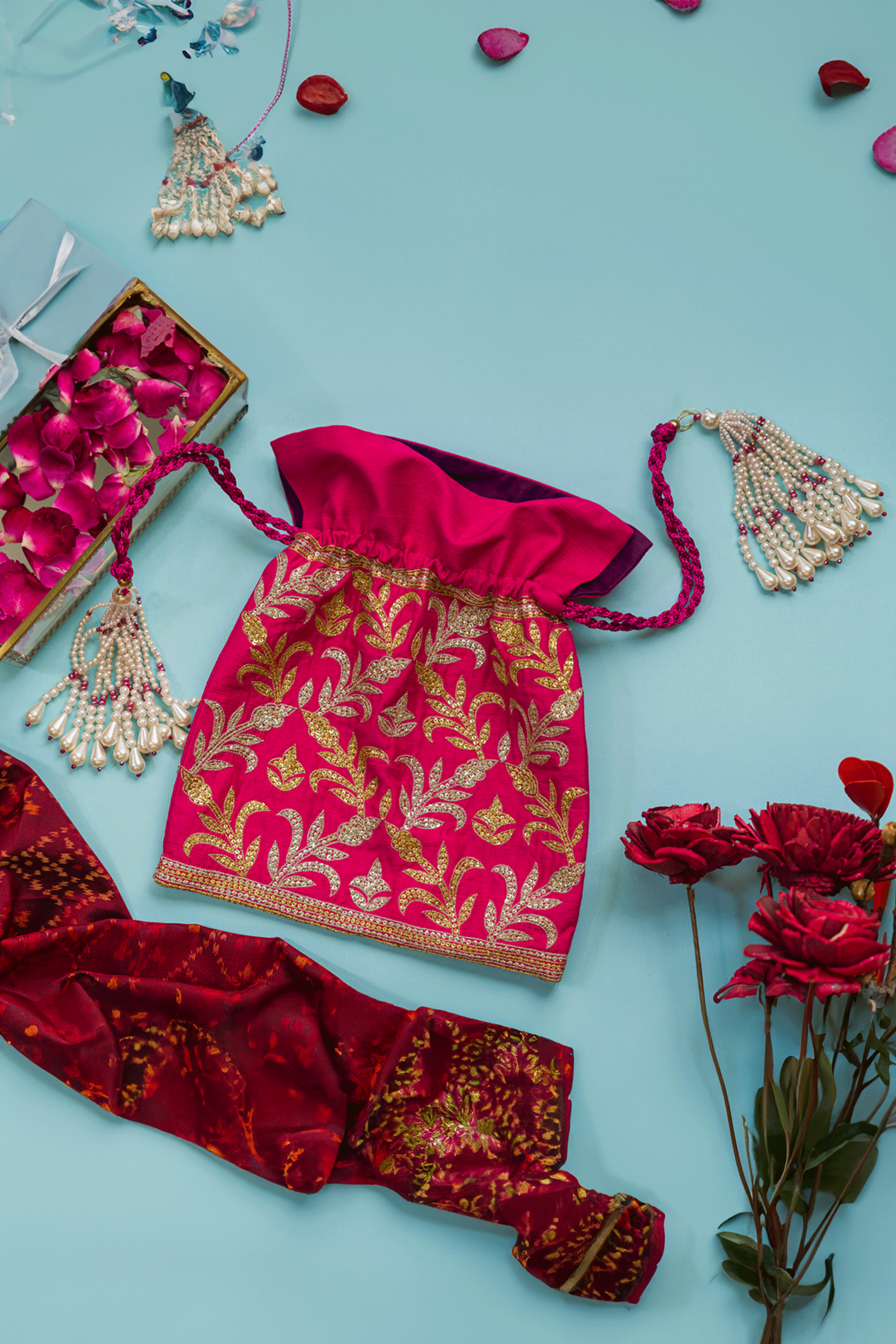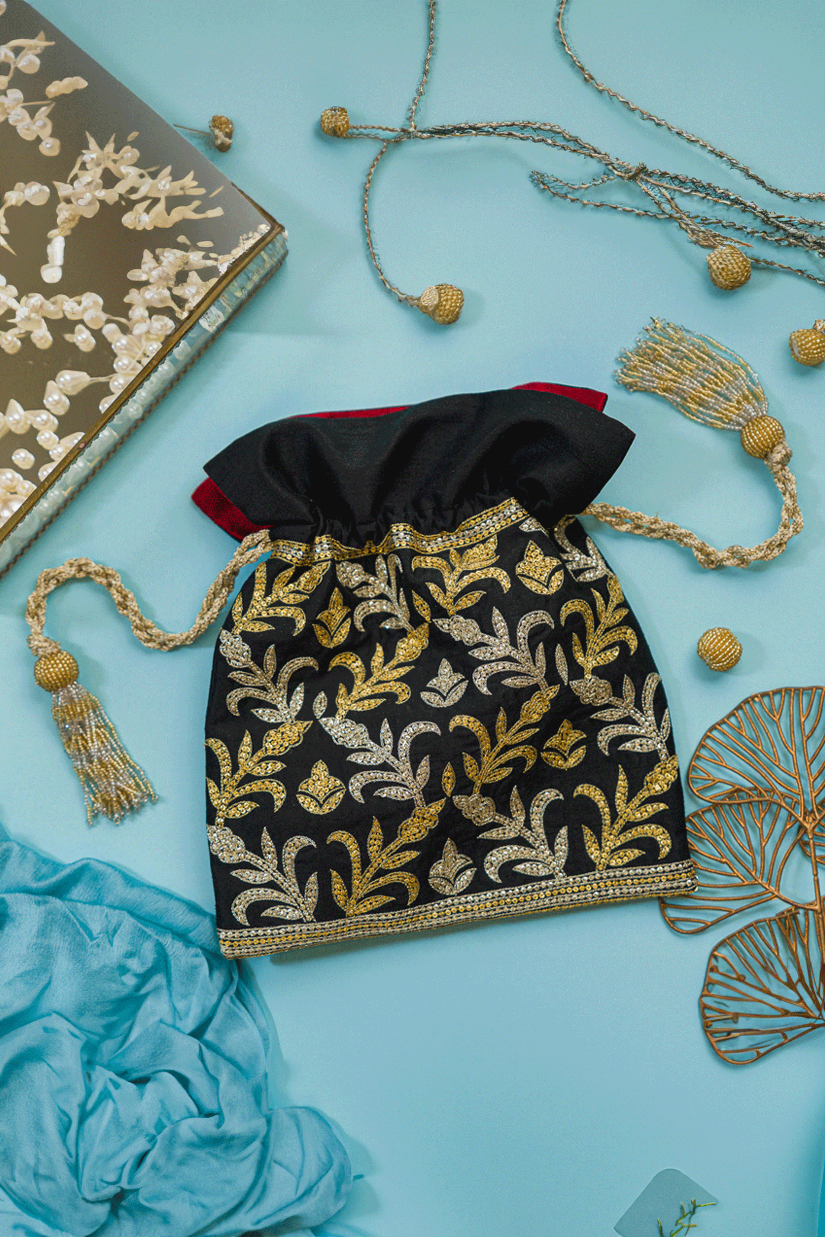An elegant raw silk batwa, beautifully embroidered with Aari and Tikki techniques. The fabric is adorned with intricate floral and geometric patterns, enhanced by delicate tassel accents.