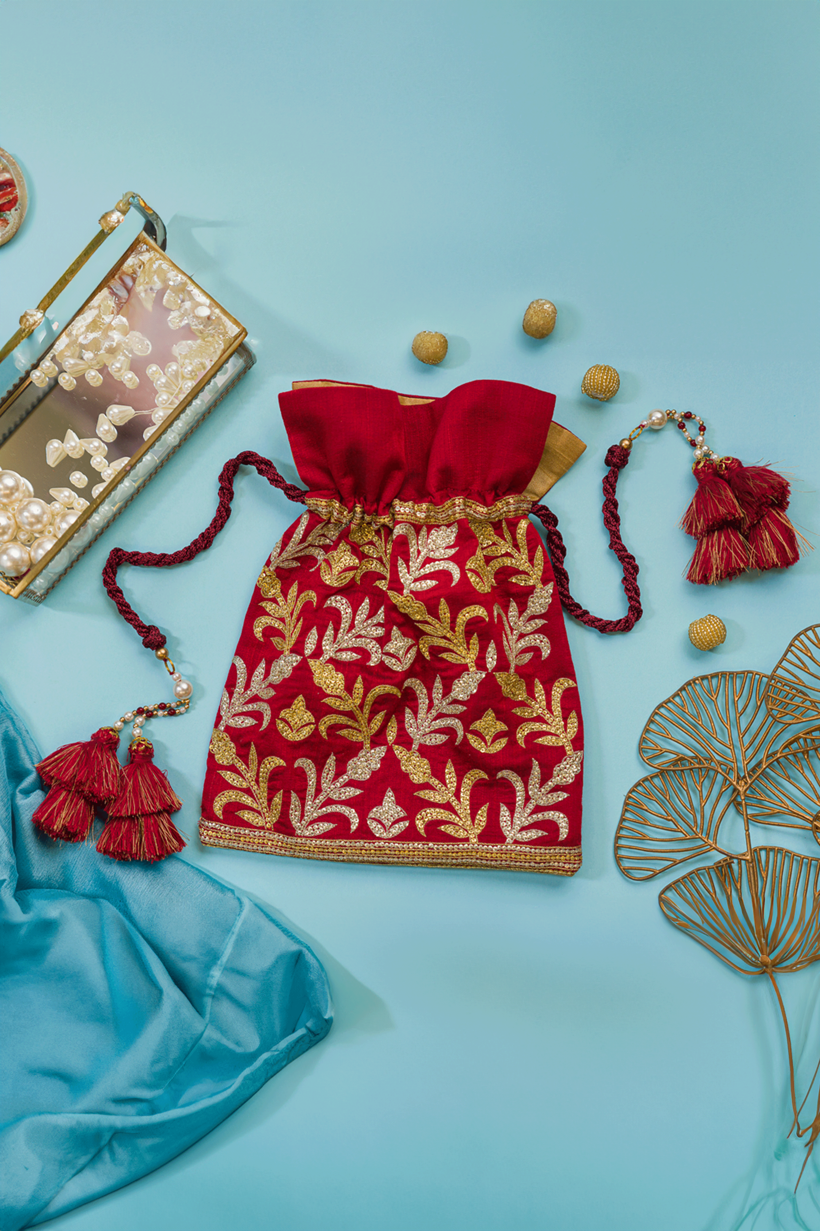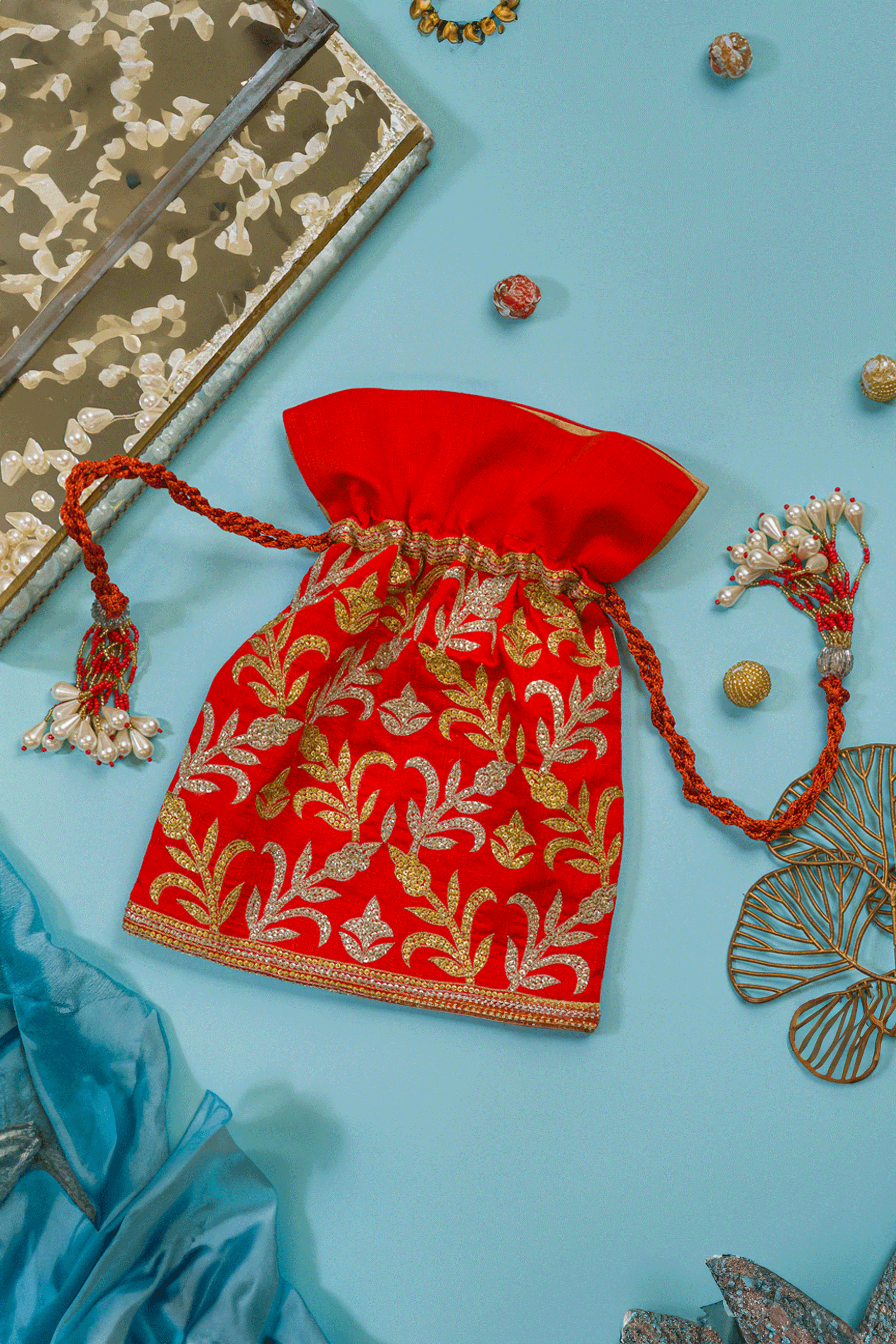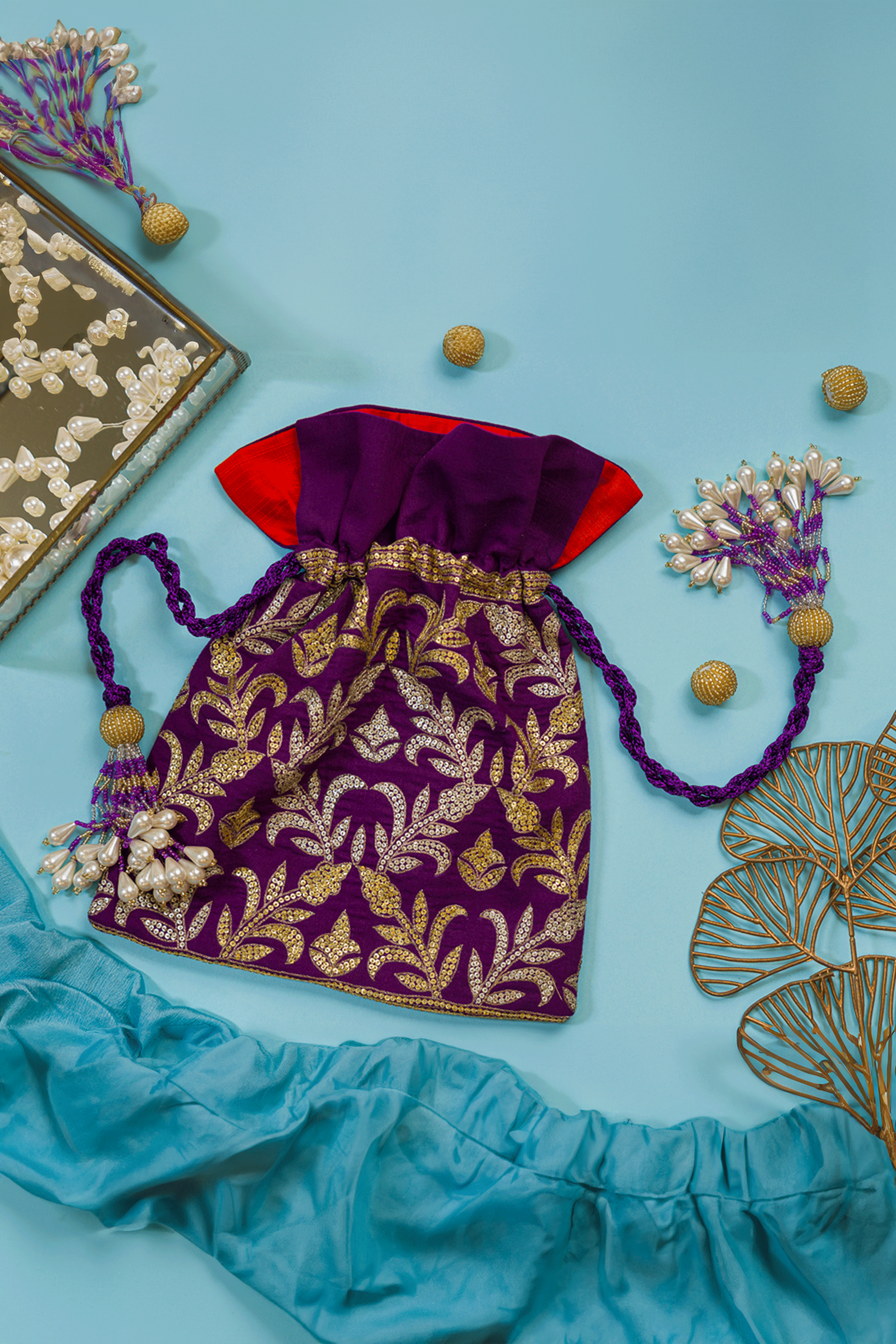 An elegant raw silk batwa, beautifully embroidered with Aari and Tikki techniques. The fabric is adorned with intricate floral and geometric patterns, enhanced by delicate tassel accents.