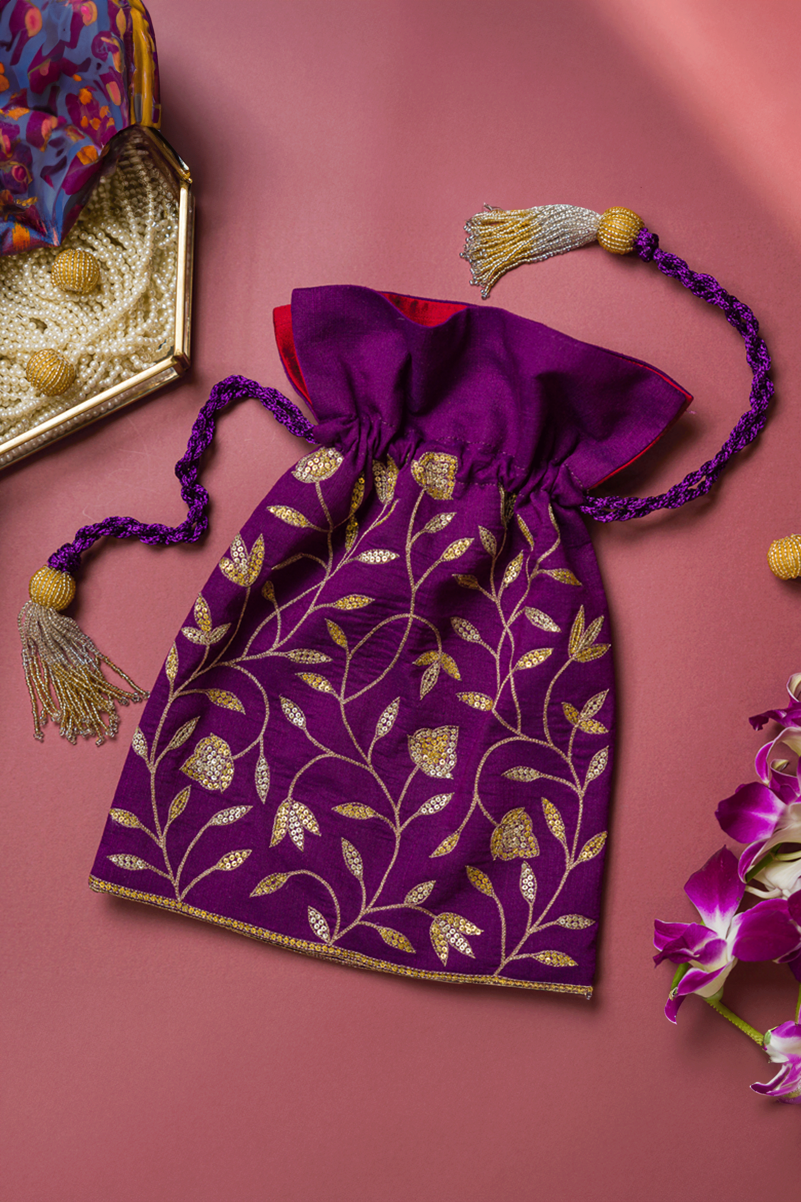 An elegant raw silk batwa, beautifully embroidered with Aari and Tikki techniques. The fabric is adorned with intricate floral and geometric patterns, enhanced by delicate tassel accents.