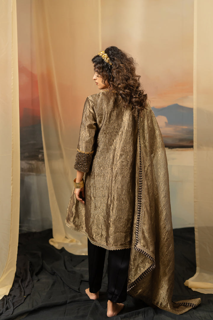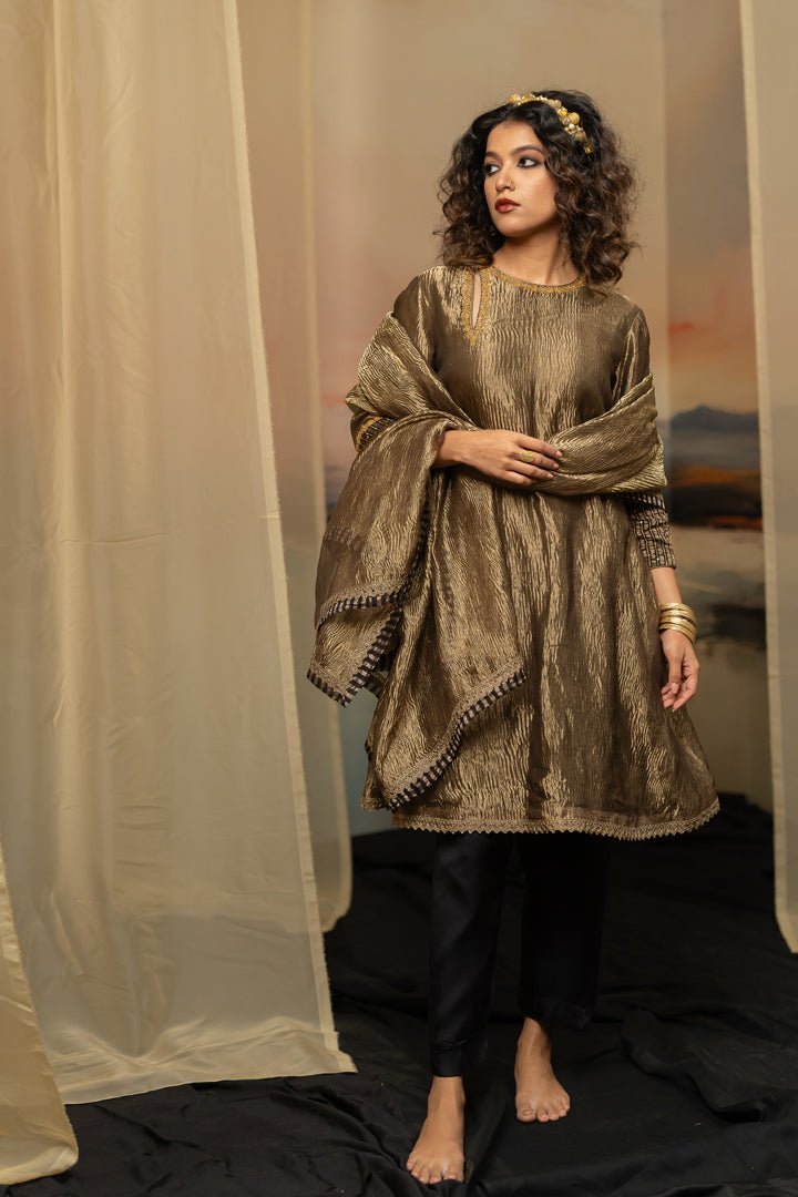 Sana set consists of a kurta and dupatta which is crafted in gold handwoven crushed tissue. The kurta features marodi embroidery at the neckline and sleeve. The dupatta has a contrast border with lace detailing.