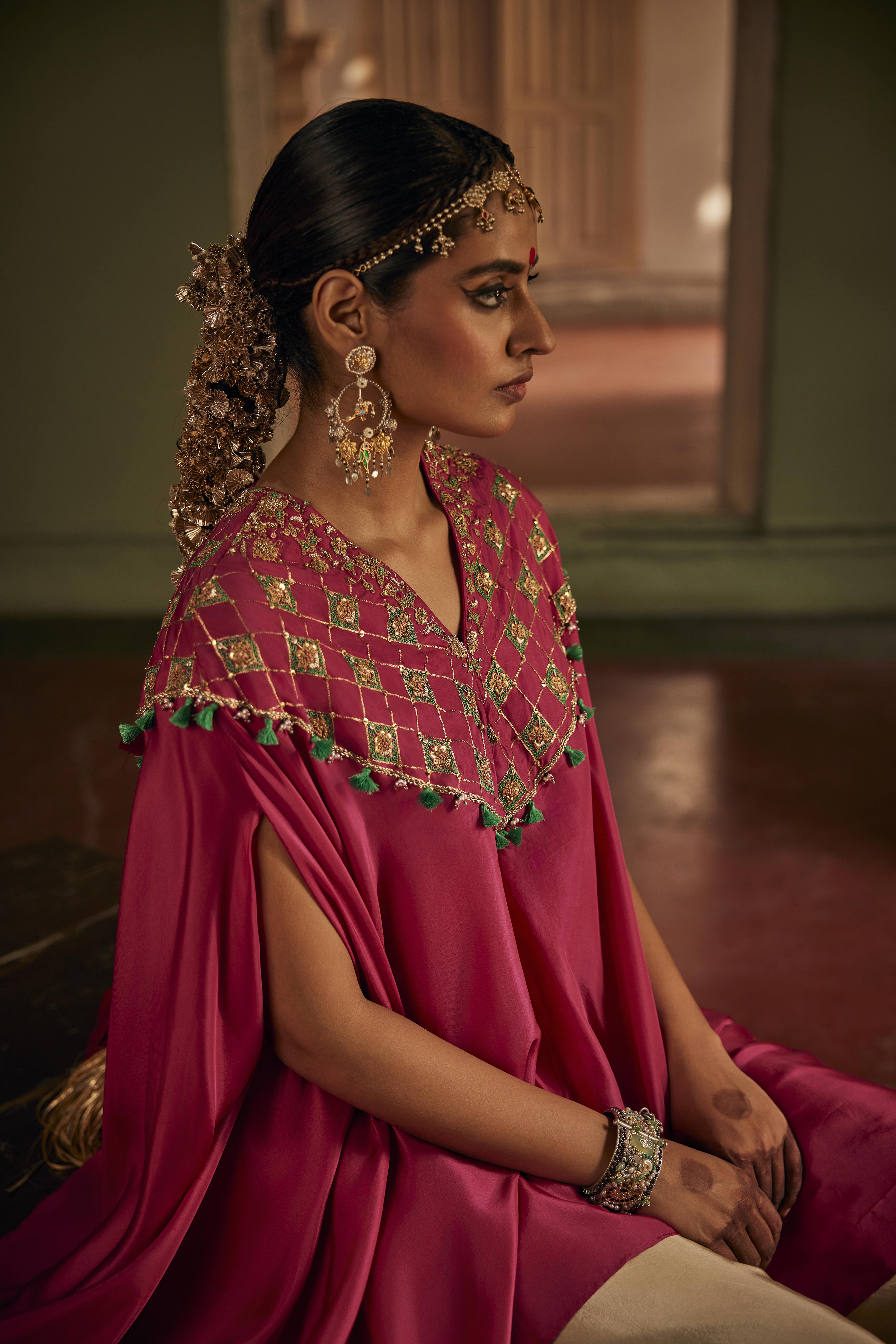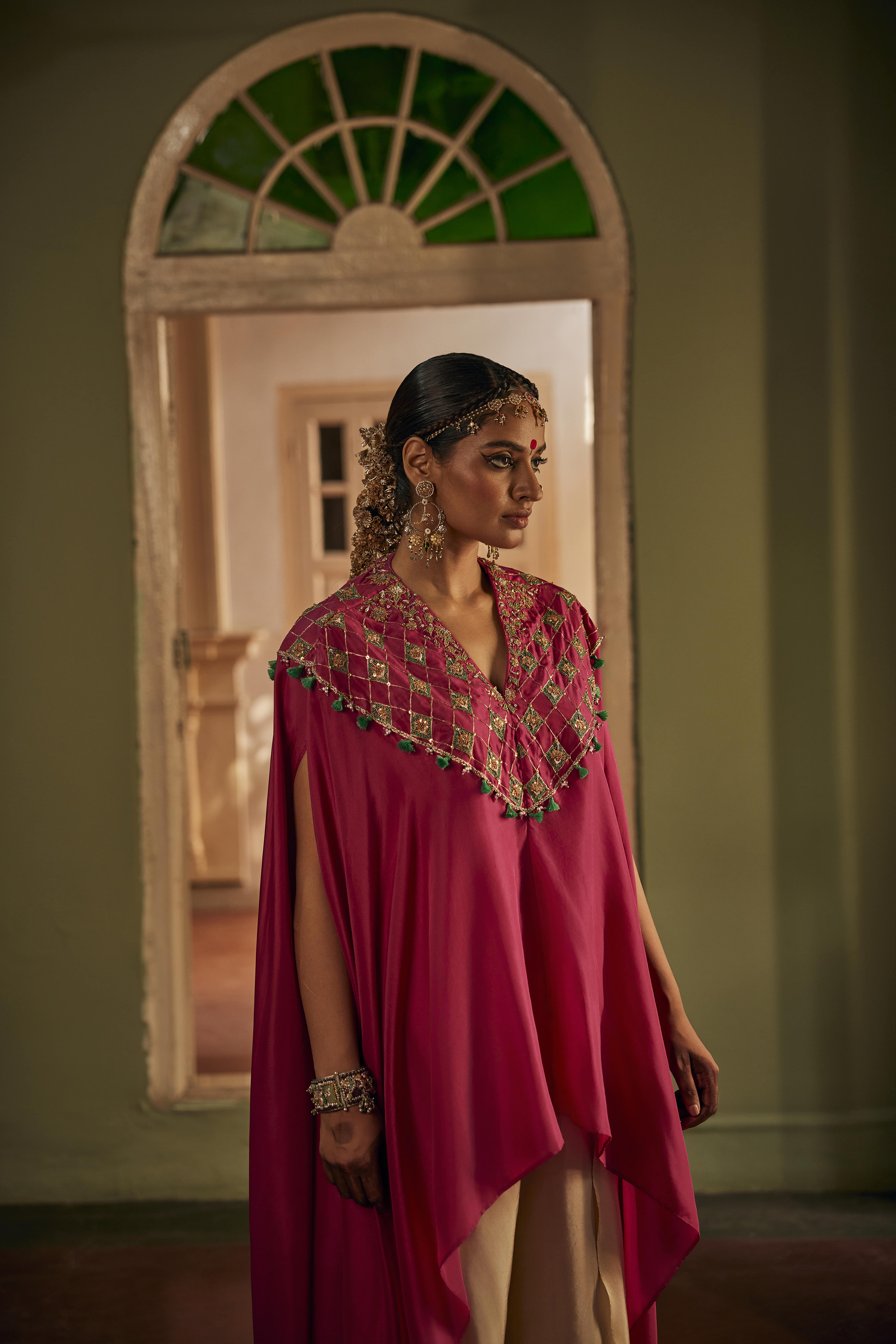 Tara cape is crafted in fine rani handwoven silk. The cape has marodi, zardozi and patch techniques with geometrical and floral motifs.