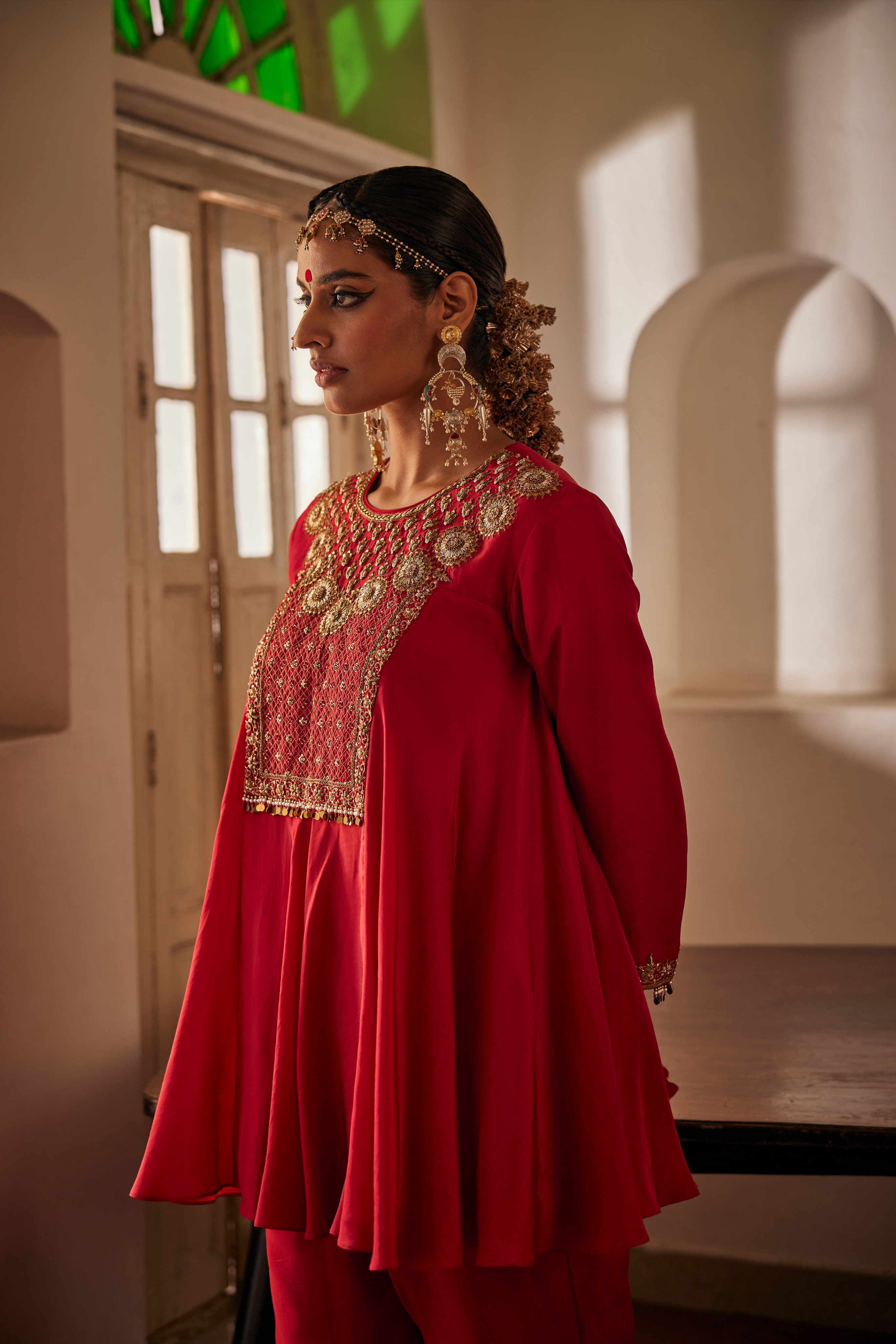 Veda tunic and pant set is crafted in fine red handwoven silk. The tunic has marodi, zardozi and resham techniques with geometrical and floral motifs.