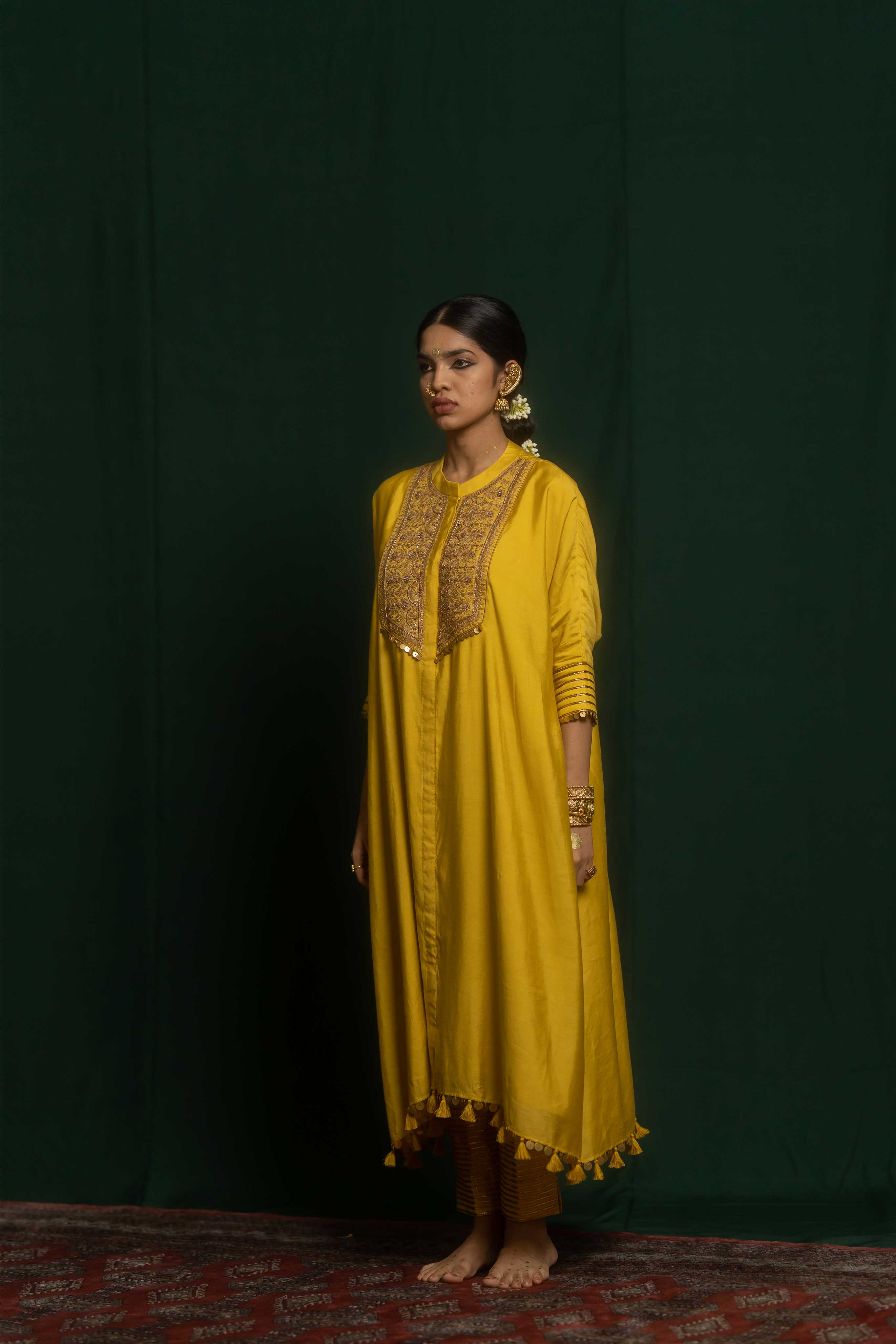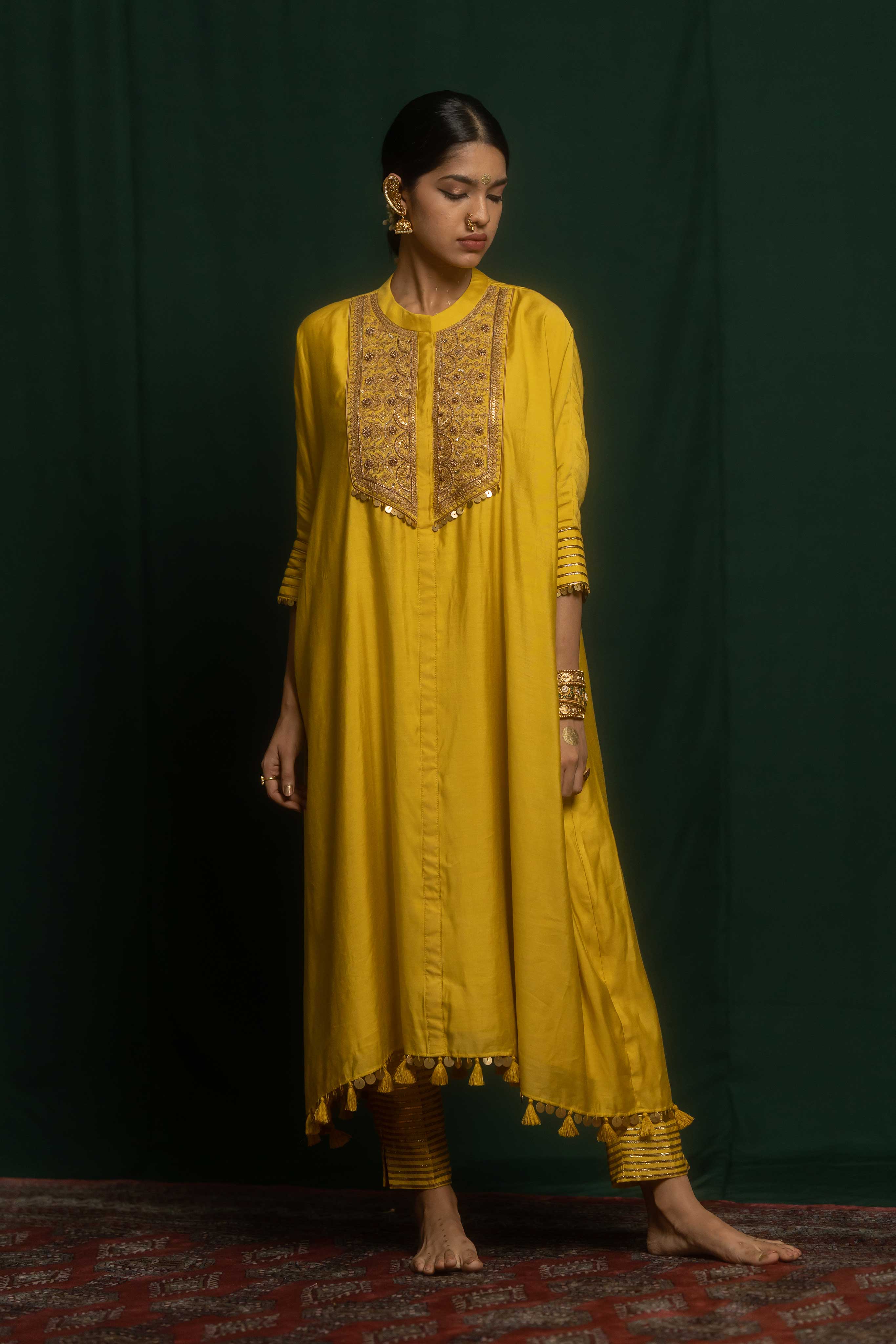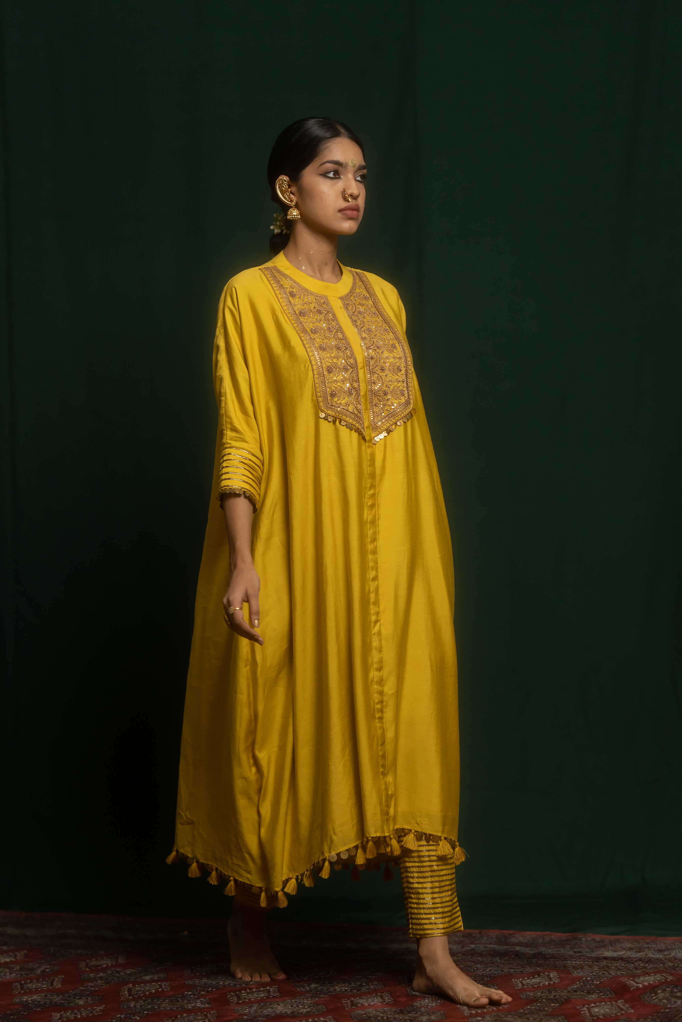 Yasna set has a kaftan and pant crafted from yellow cotton silk. It features a combination of marodi and zardosi embroidery. It has a heavily embroidered yolk.