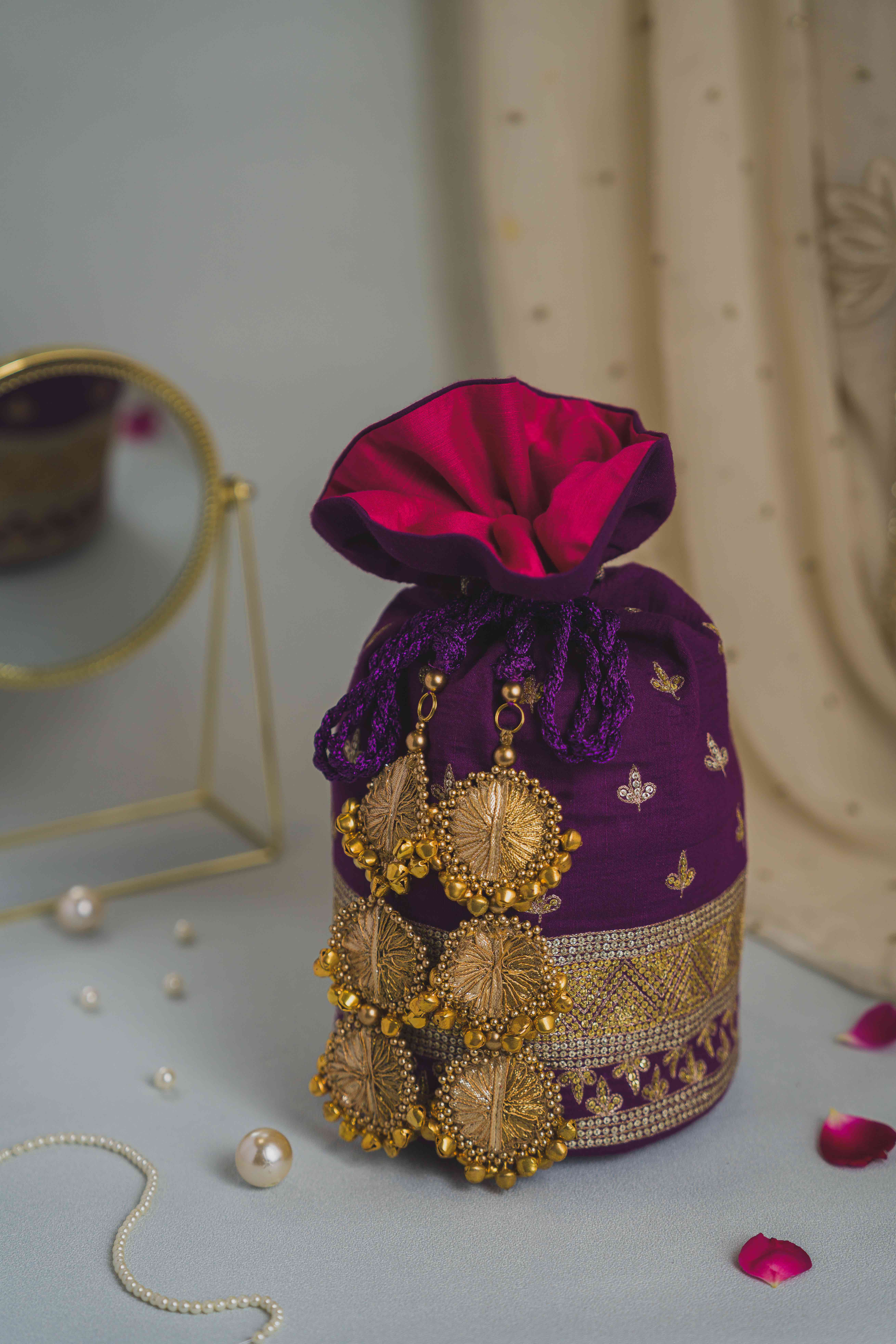 An elegant raw silk batwa, beautifully embroidered with Aari and Tikki techniques. The fabric is adorned with intricate floral and geometric patterns, enhanced by delicate tassel accents.